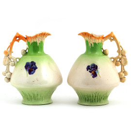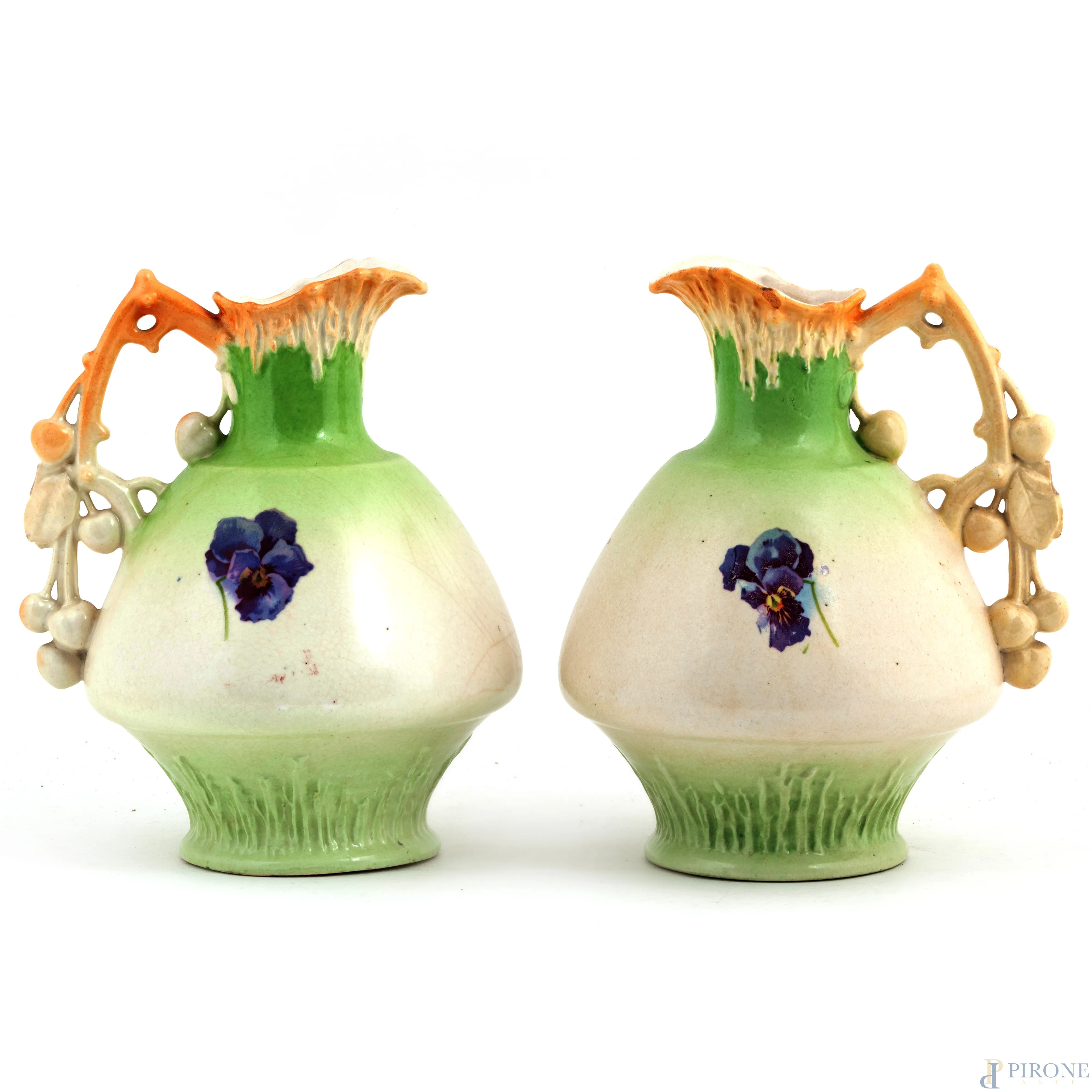 Coppia di versatoi in maiolica con decori floreali, XX secolo, altezza cm 23, (segni di usura)
