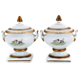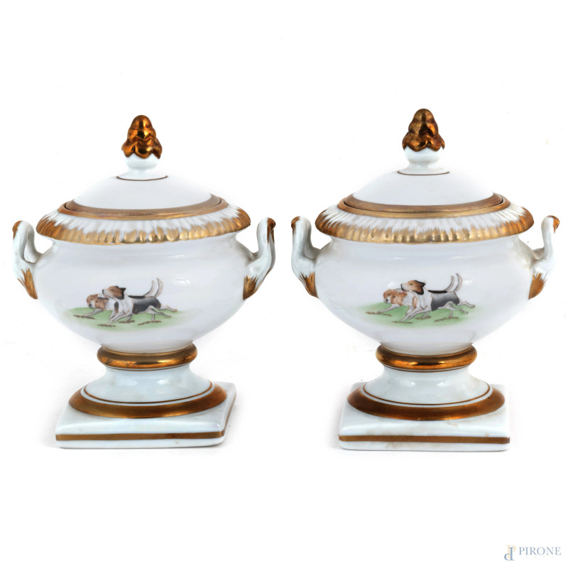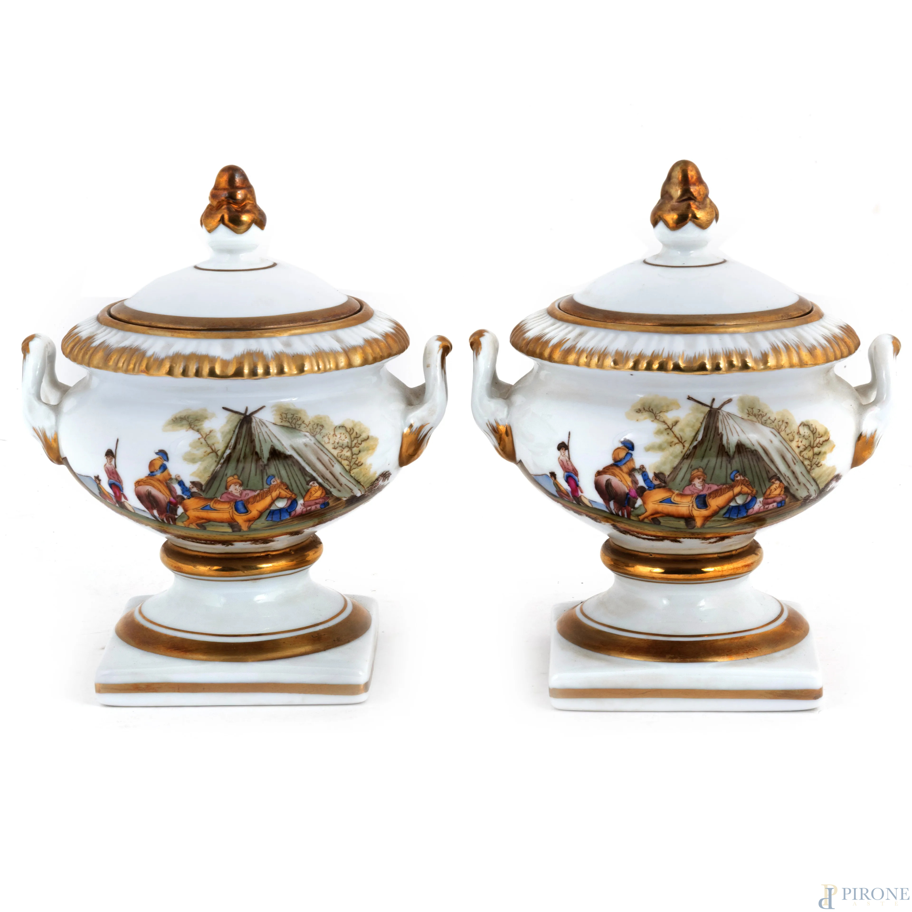 Coppia di zuccheriere biansate in porcellana Meissen nei toni del bianco e dell'oro, con raffigurazioni di accampamento e segugi, altezza cm 17, (lievi segni di usura)