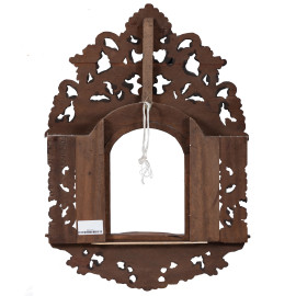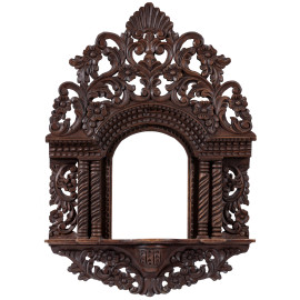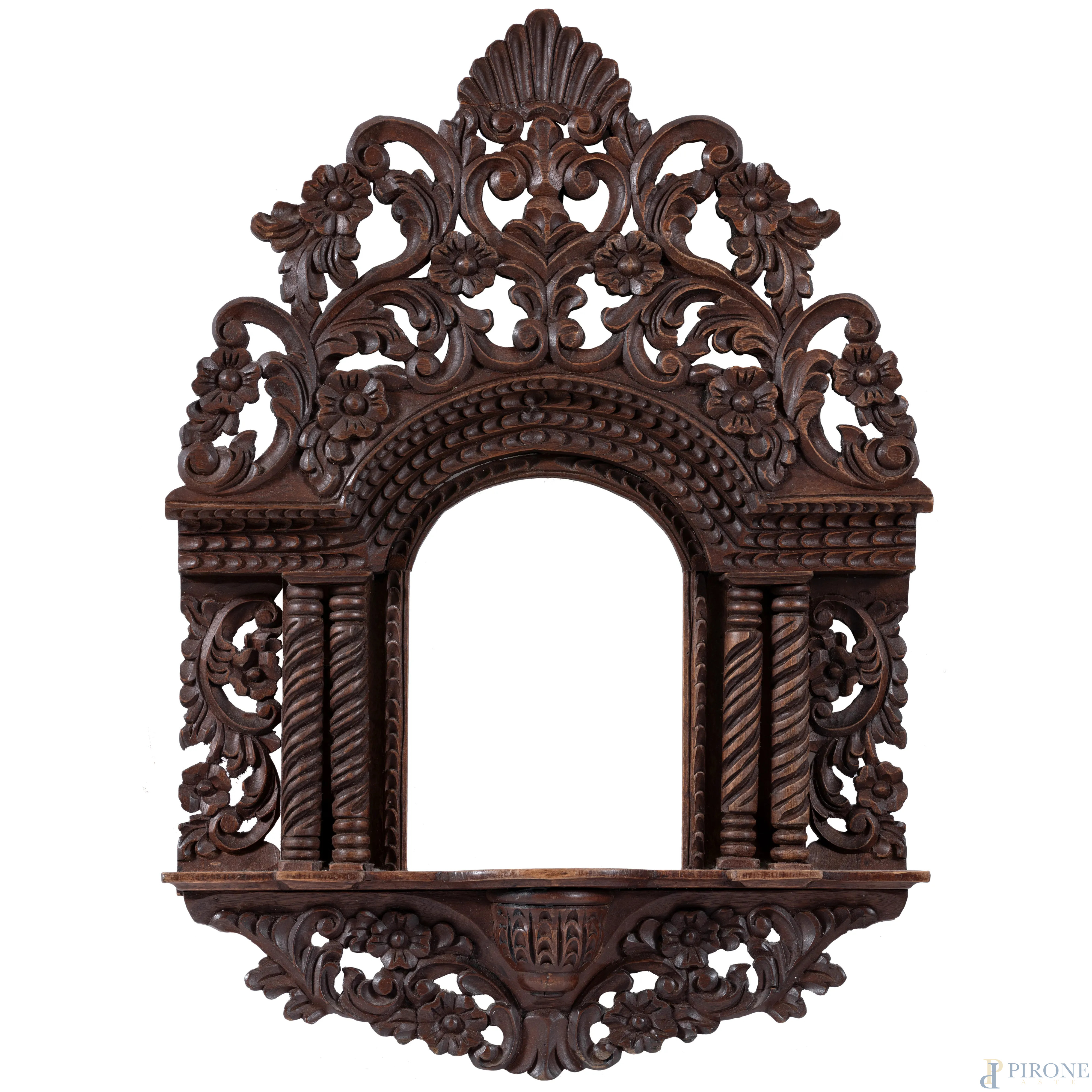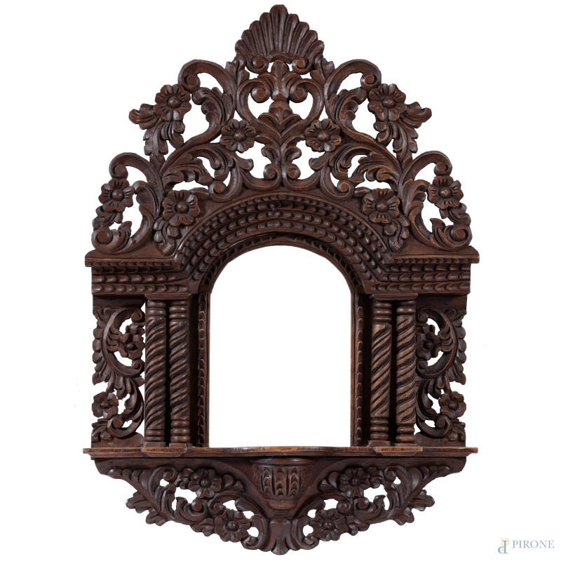 Cornicetta a tempio di legno di noce riccamente intagliato, XX secolo, cm 66x45,5, luce cm 24,5x17, (segni di usura, restauri)