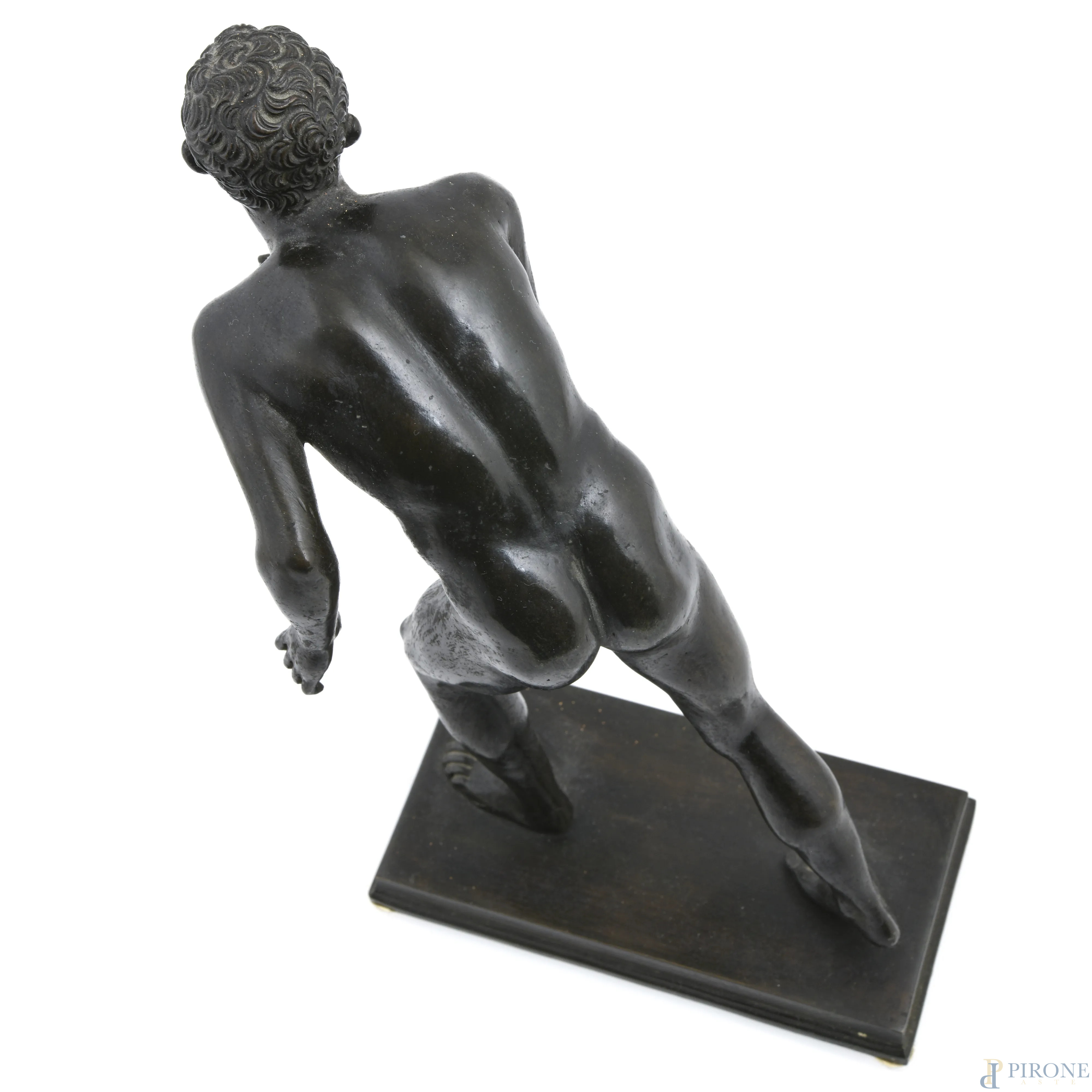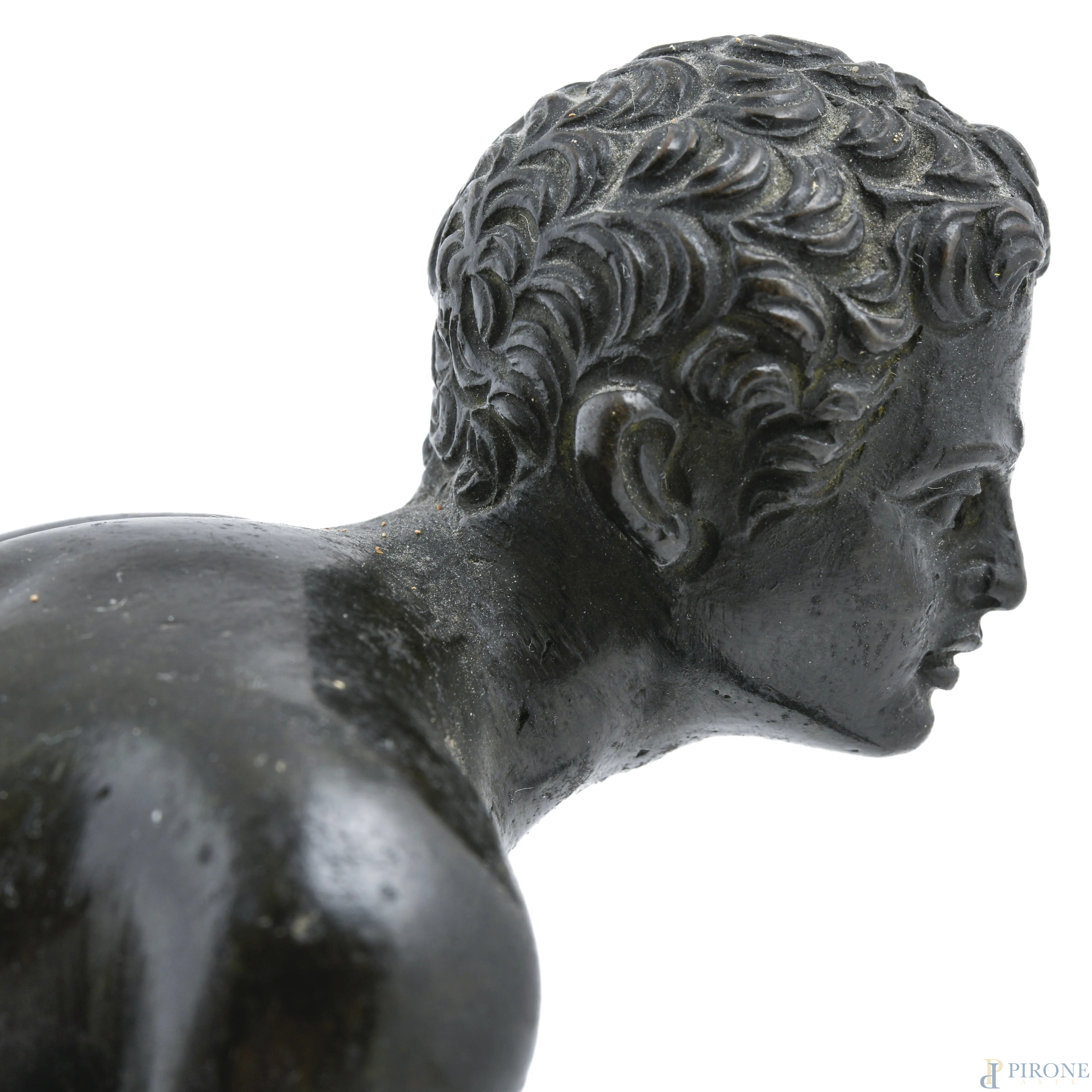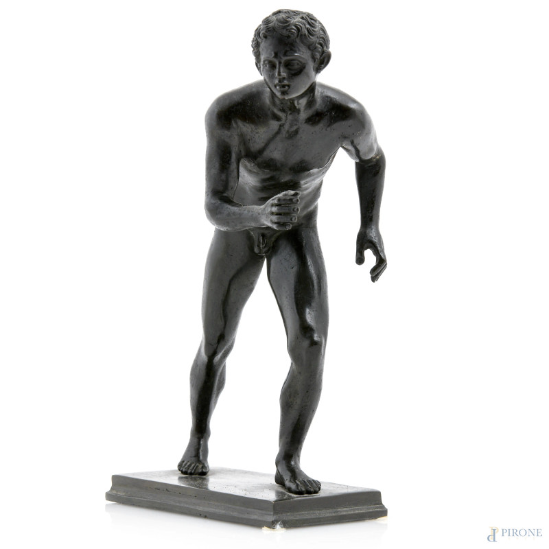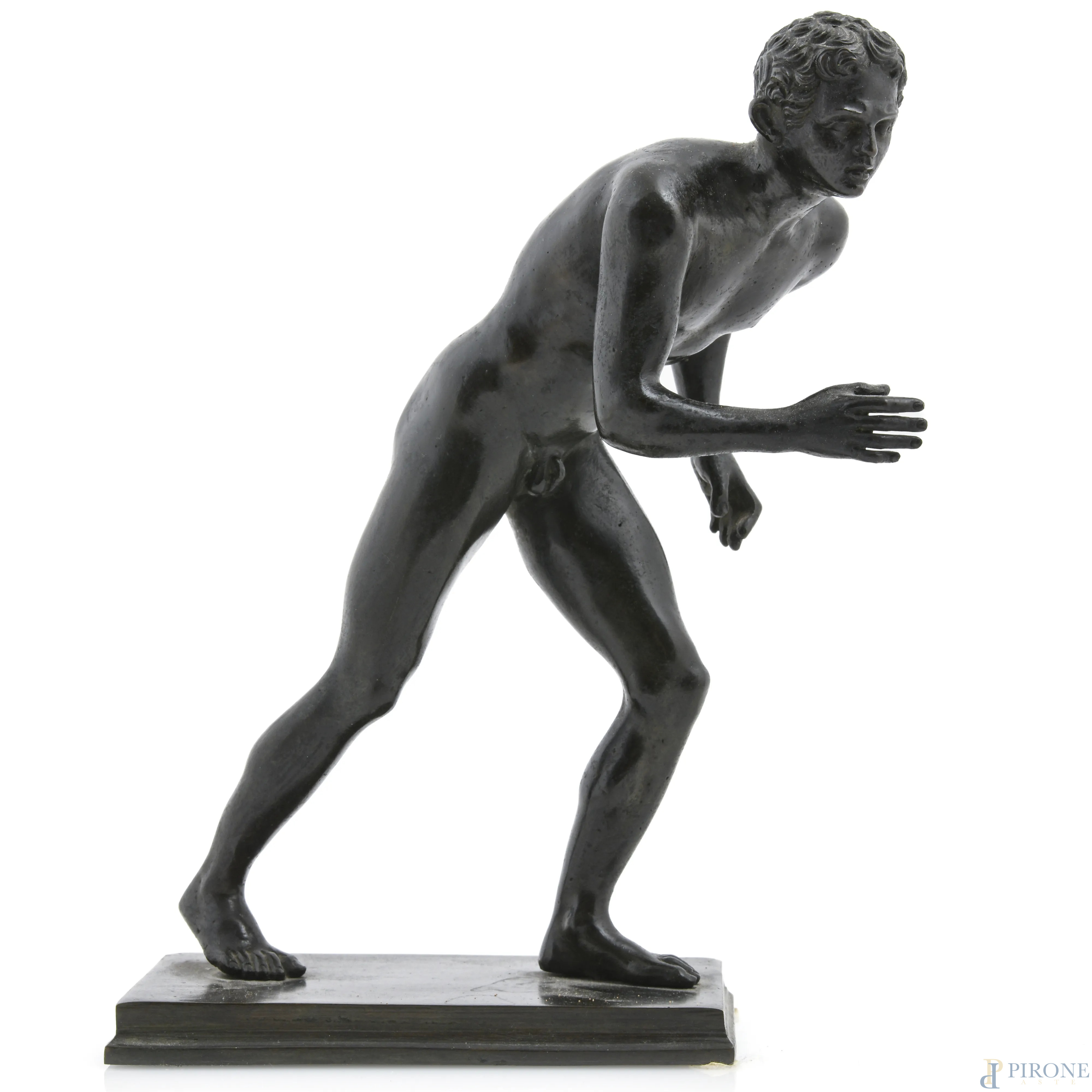 Corridore, XX secolo, scultura in metallo patinato su base in bronzo, altezza cm 22, (segni di usura, difetti)