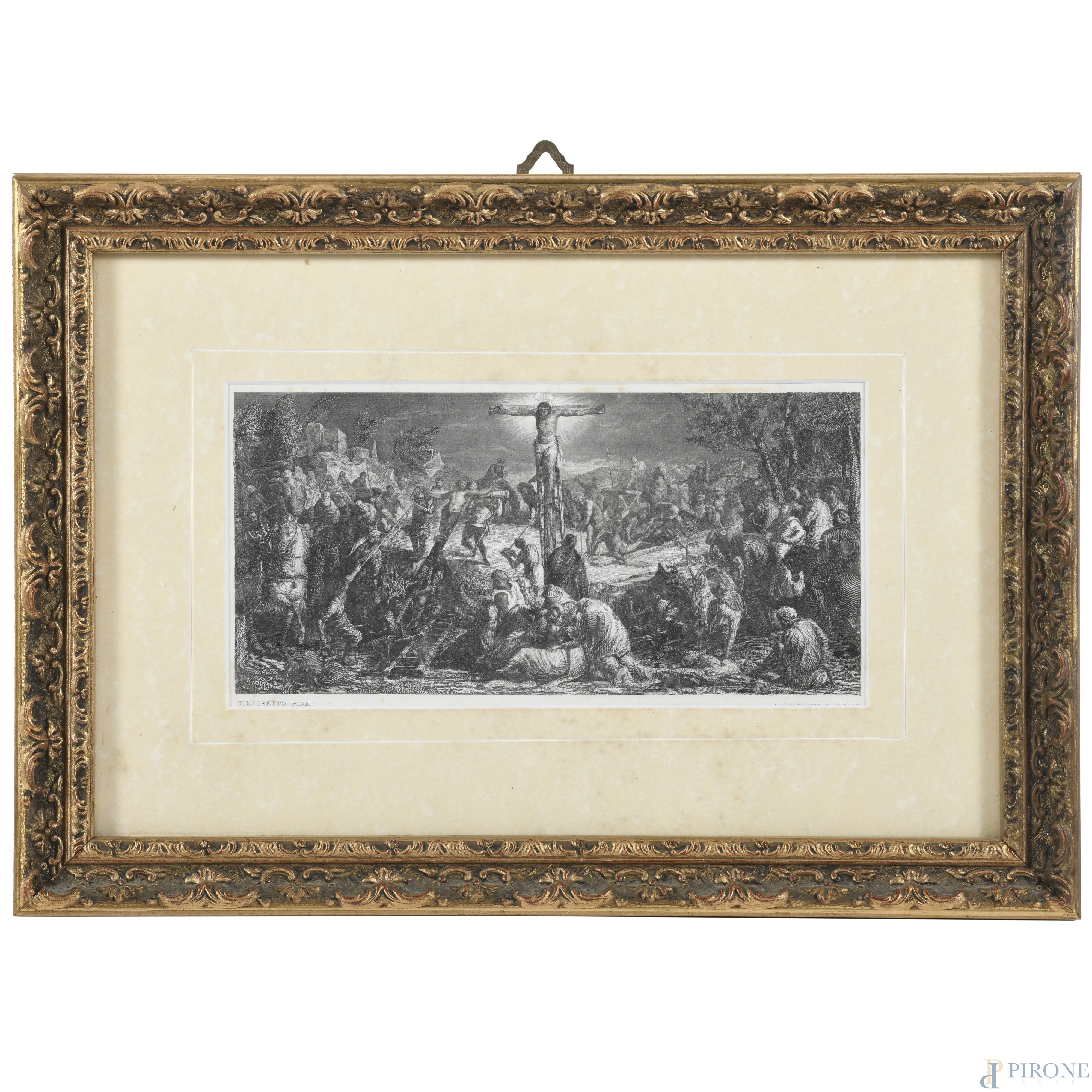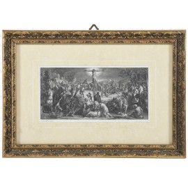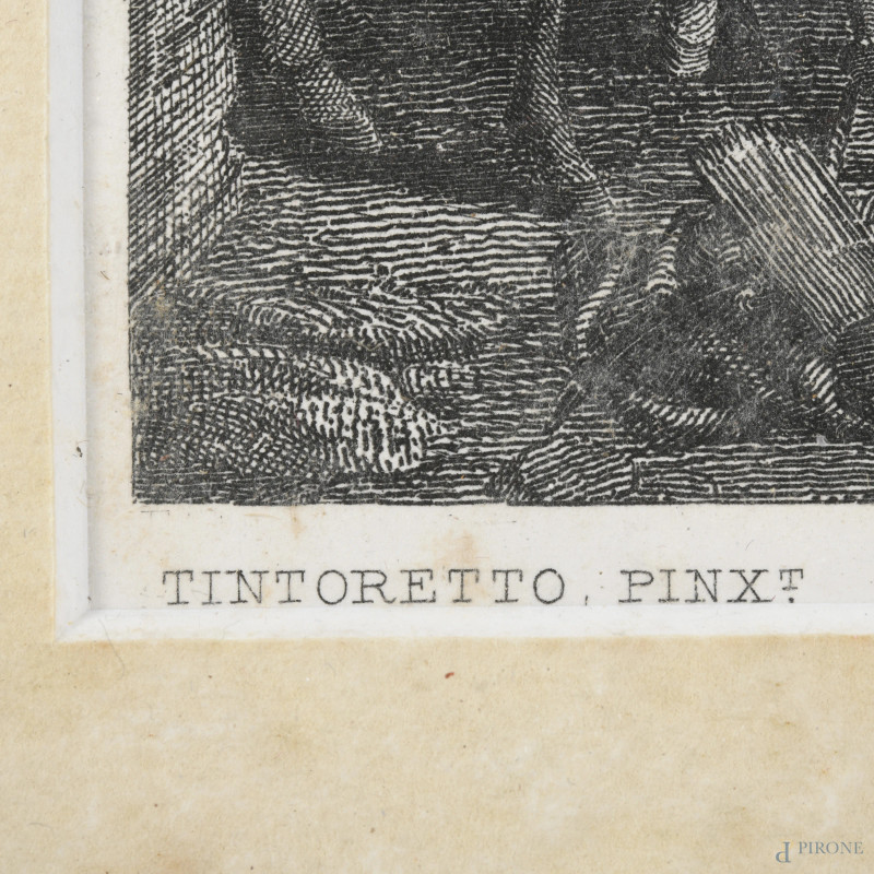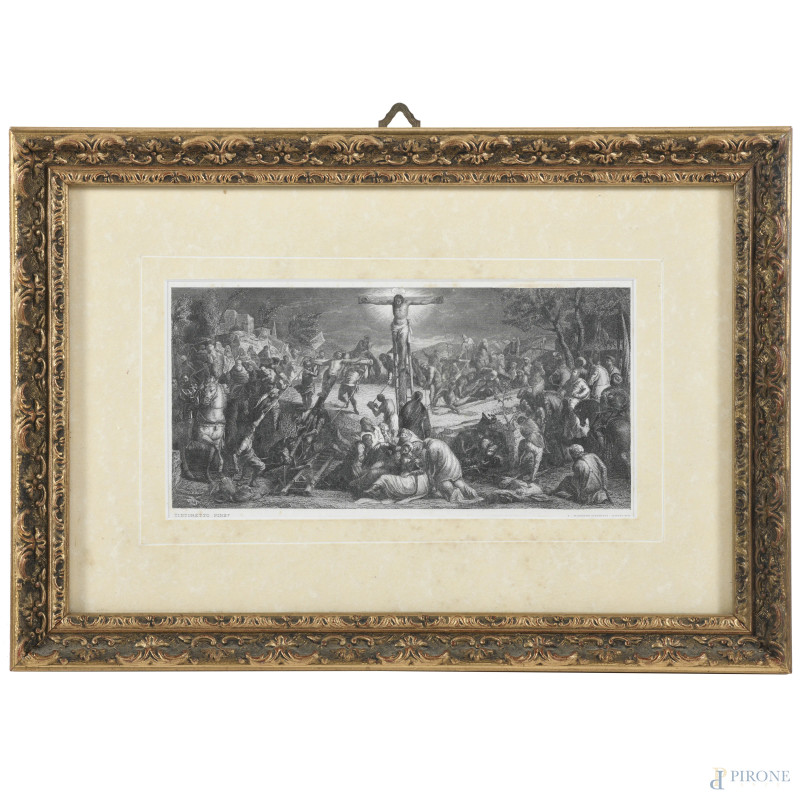 Crocifissione, XX secolo, incisione (da Jacopo Robusti, detto Tintoretto), cm 20x31, entro cornice, ondulazioni della carta, foxing)