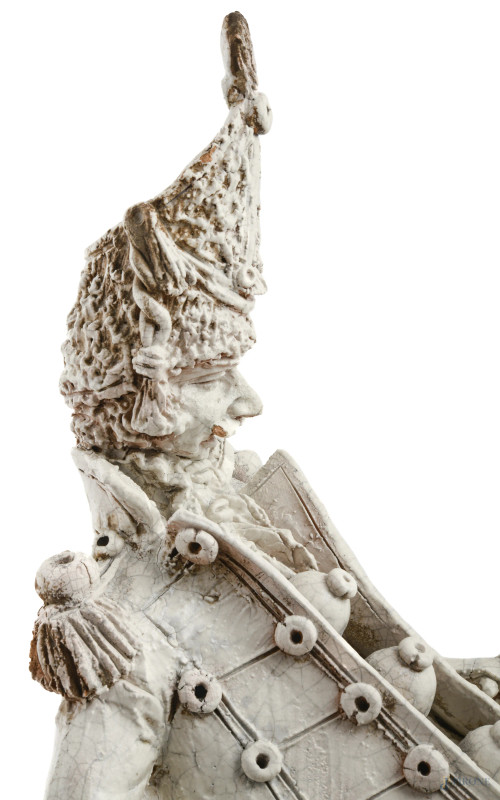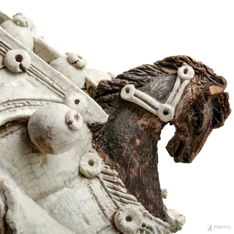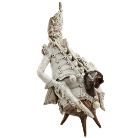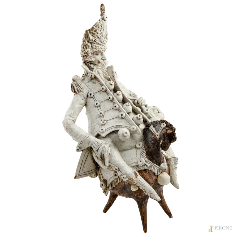 Domenico Poloniato (1926-2013), Giocattolo sonoro raffigurante ufficiale napoleonico a cavallo, terracotta dipinta e smaltata, altezza cm 62, (rotture, difetti, mancanze)
