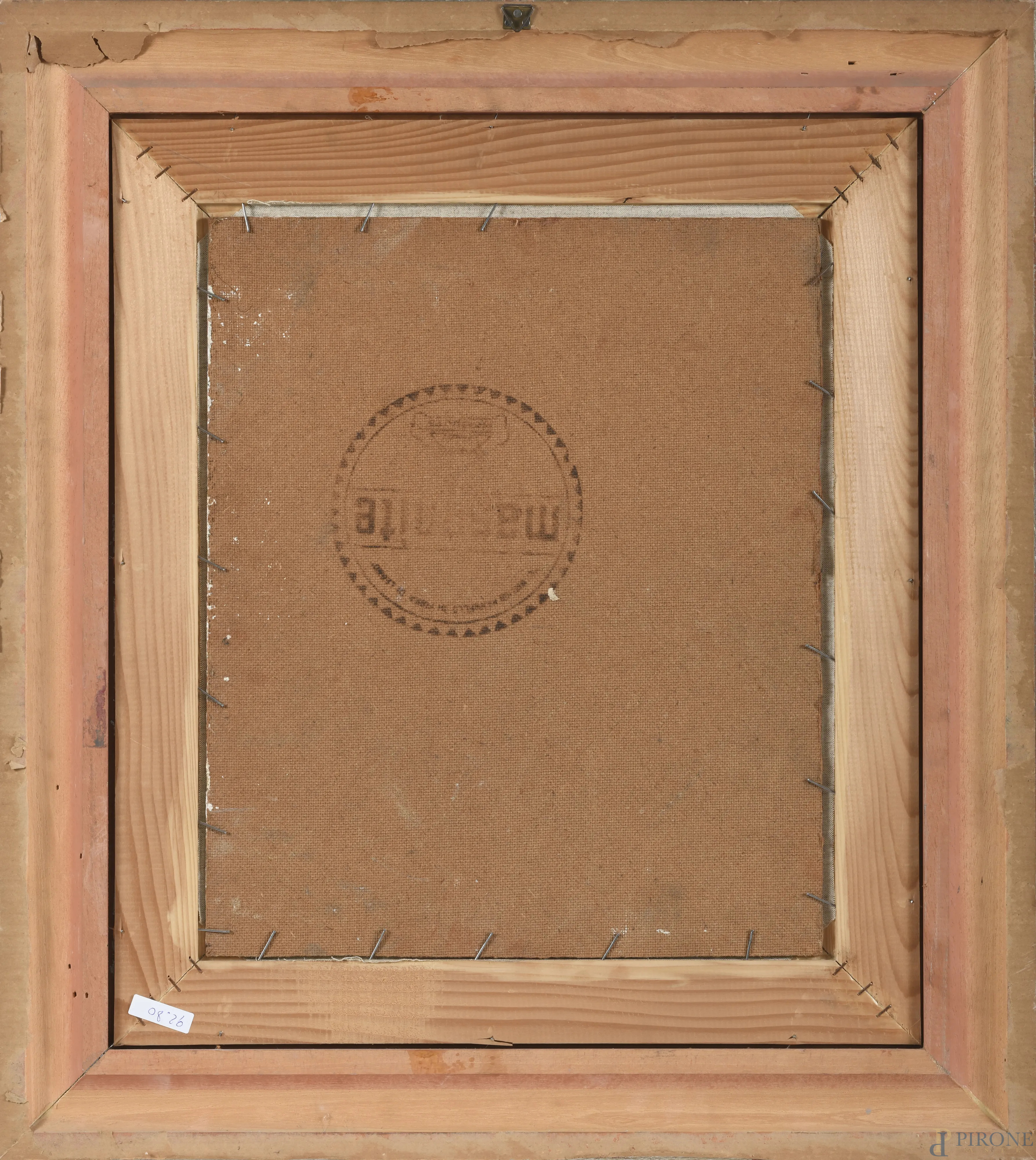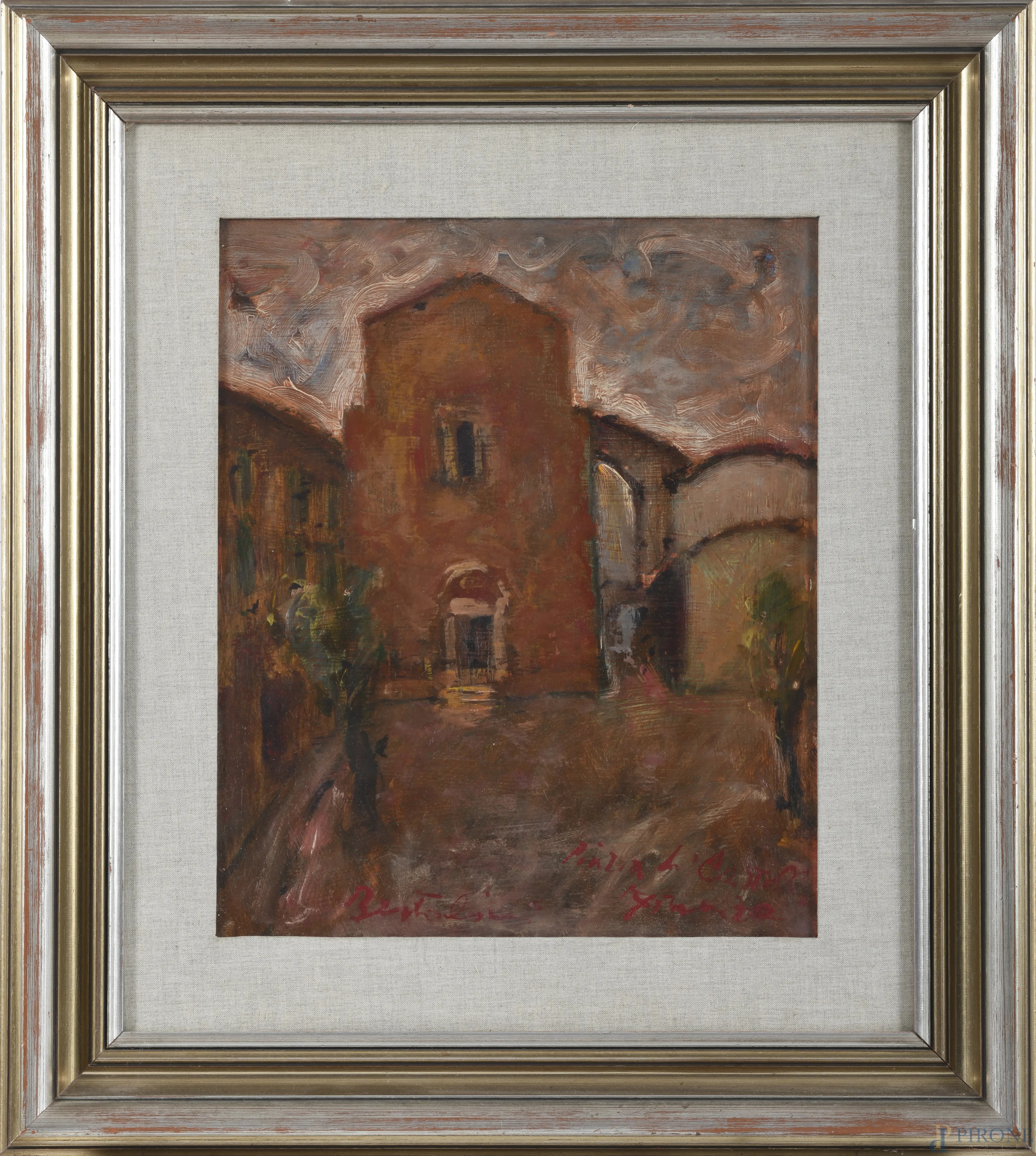 Esterno, XX secolo, olio su faesite, cm 44x36, firmato e iscritto in basso, entro cornice