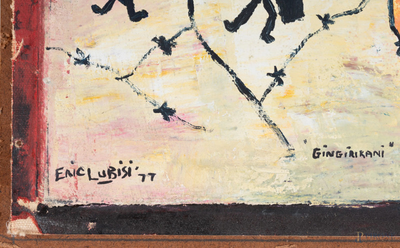 Gingirikani, XX secolo, tecnica mista su cartone telato applicato su faesite, cm 50x39,5, firmato e datato "99" in basso a sinistra, (segni di usura, piccoli fori)