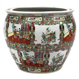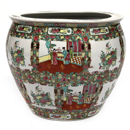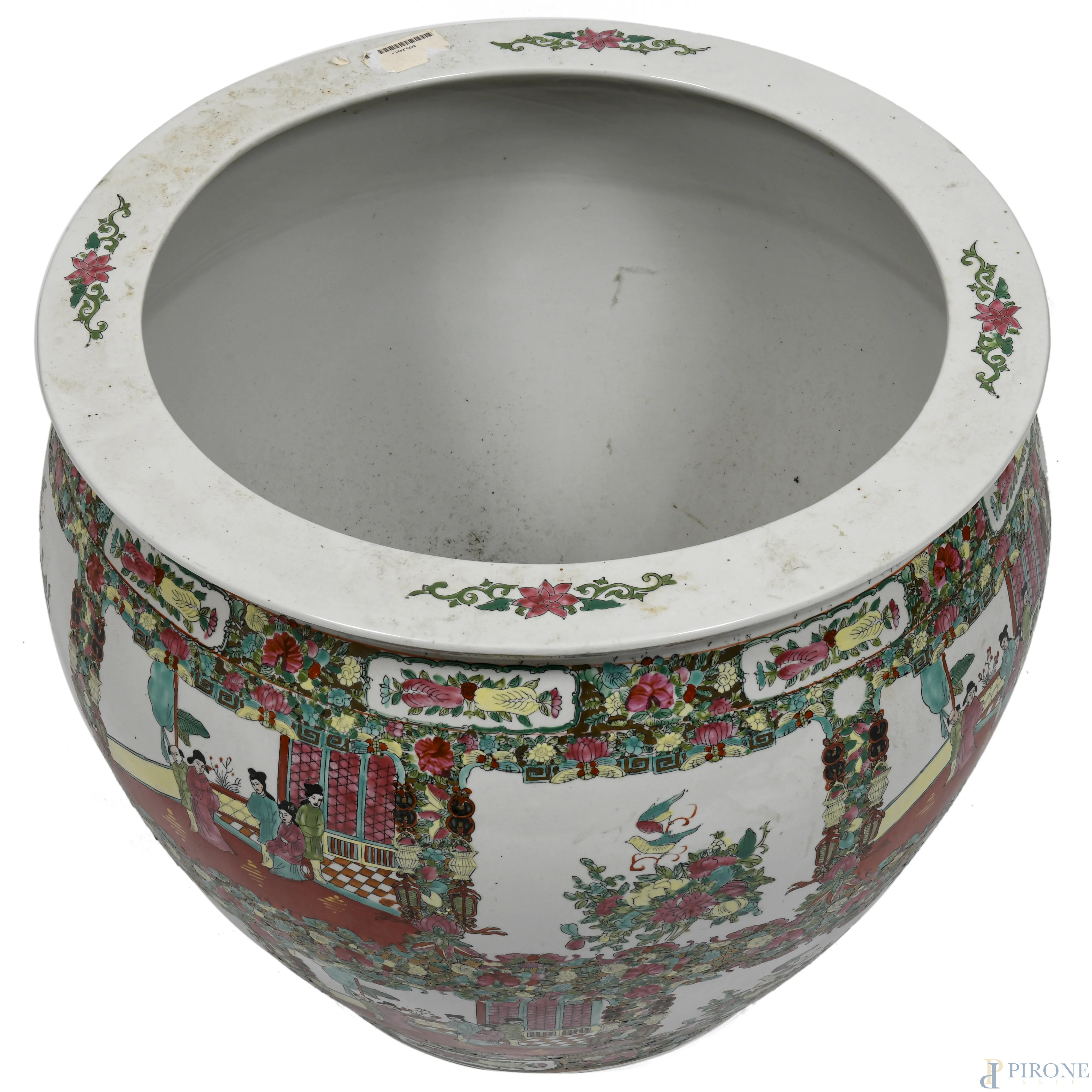 Grande cachepot fioriera in ceramica decorata con scene di genere e motivi floreali. Cina, XX secolo, cm 50x56, (segni di usura, difetti)