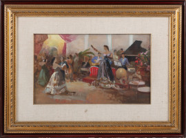 Il ballo, XX secolo, olio su faesite, cm 30x50, firmato in basso a sinistra, entro cornice