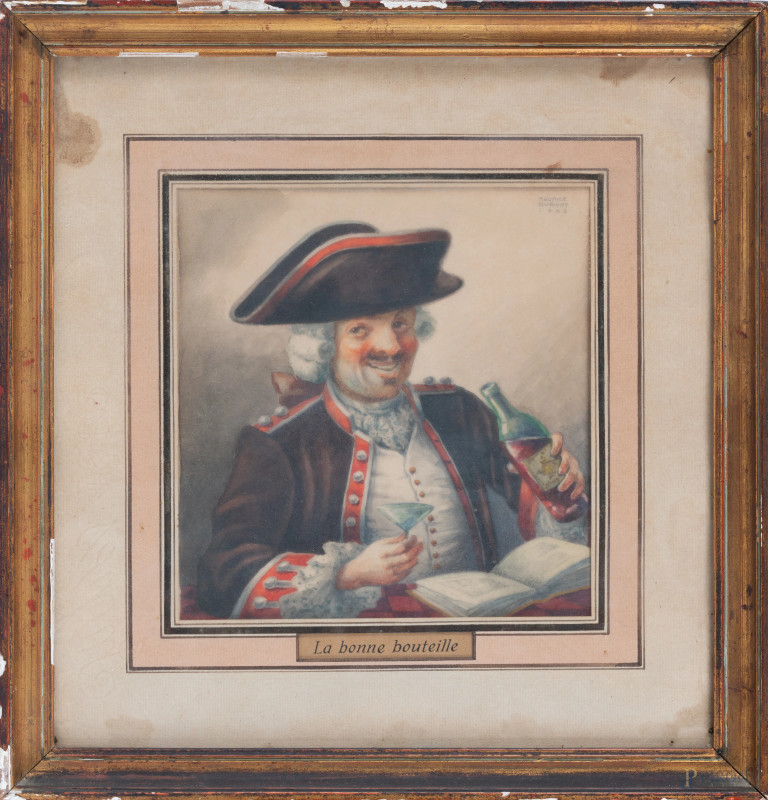 La bonne bouteille, XX secolo, stampa ritoccata, cm 30x29 compreso passepartout, entro cornice, (tracce di umidità, segni di usura)
