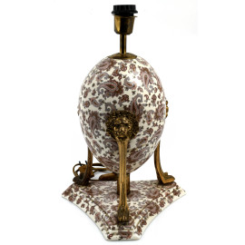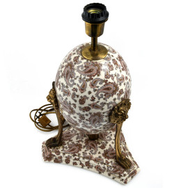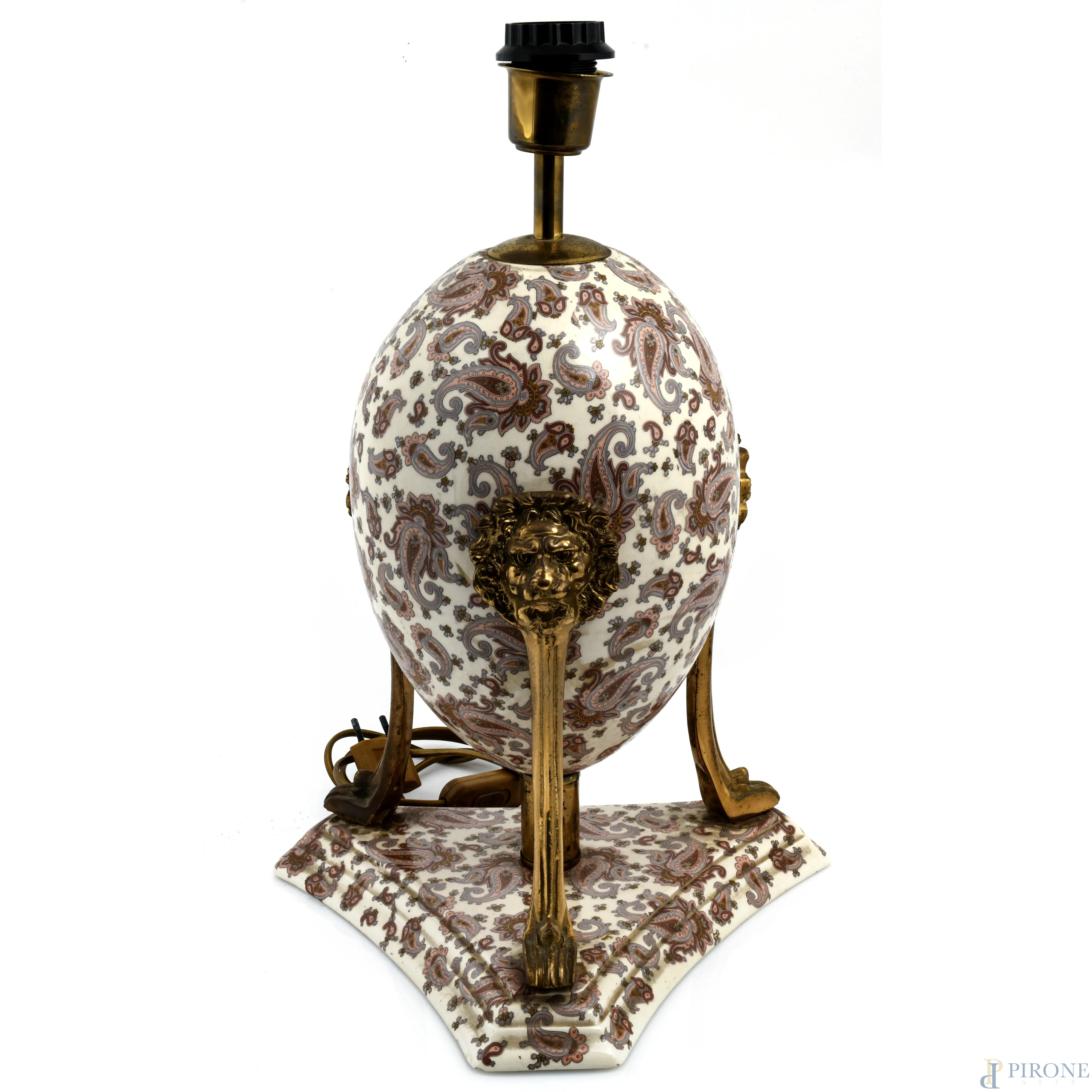 Lampada da tavolo in ceramica decorata ad arabeschi nei toni del grigio e del rosa con inserti in metallo dorato, XX secolo, altezza cm 45, (segni di usura, scalfiture, graffi, da revisionare)