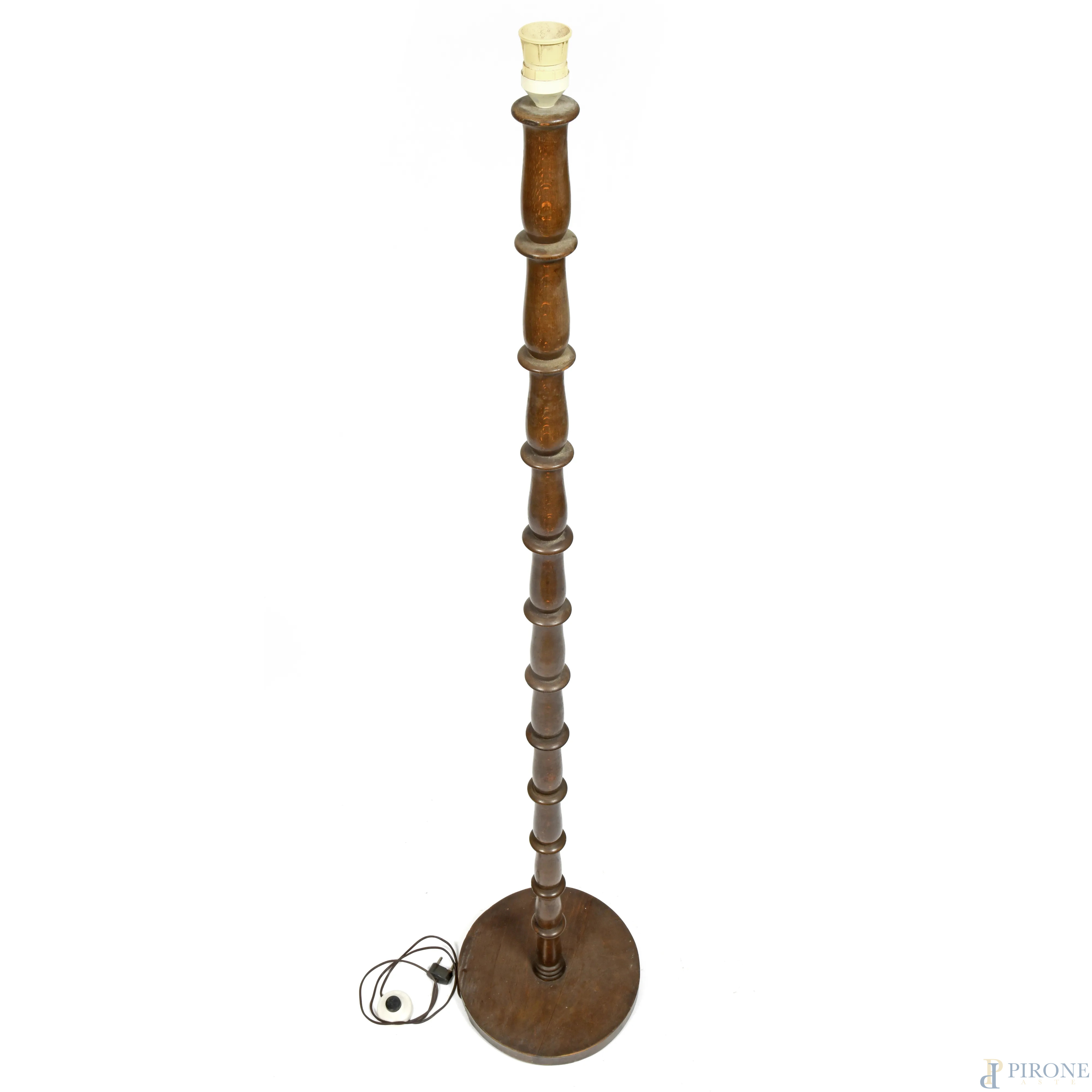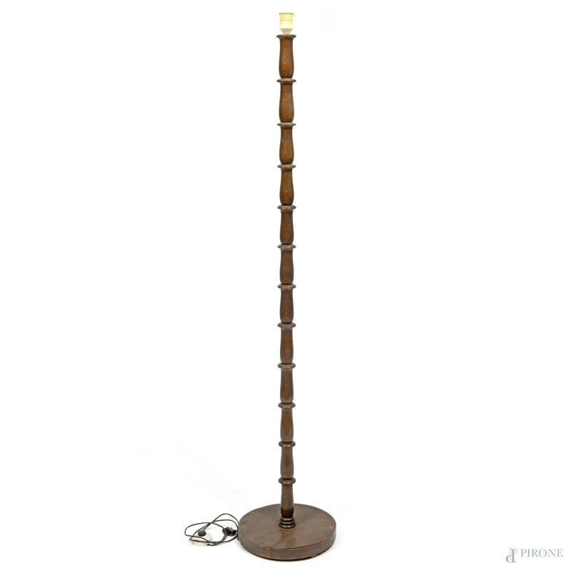 Lampada da terra con fusto in legno tornito e base circolare, XX secolo, altezza cm 158, (segni di usura, difetti, da revisionare)