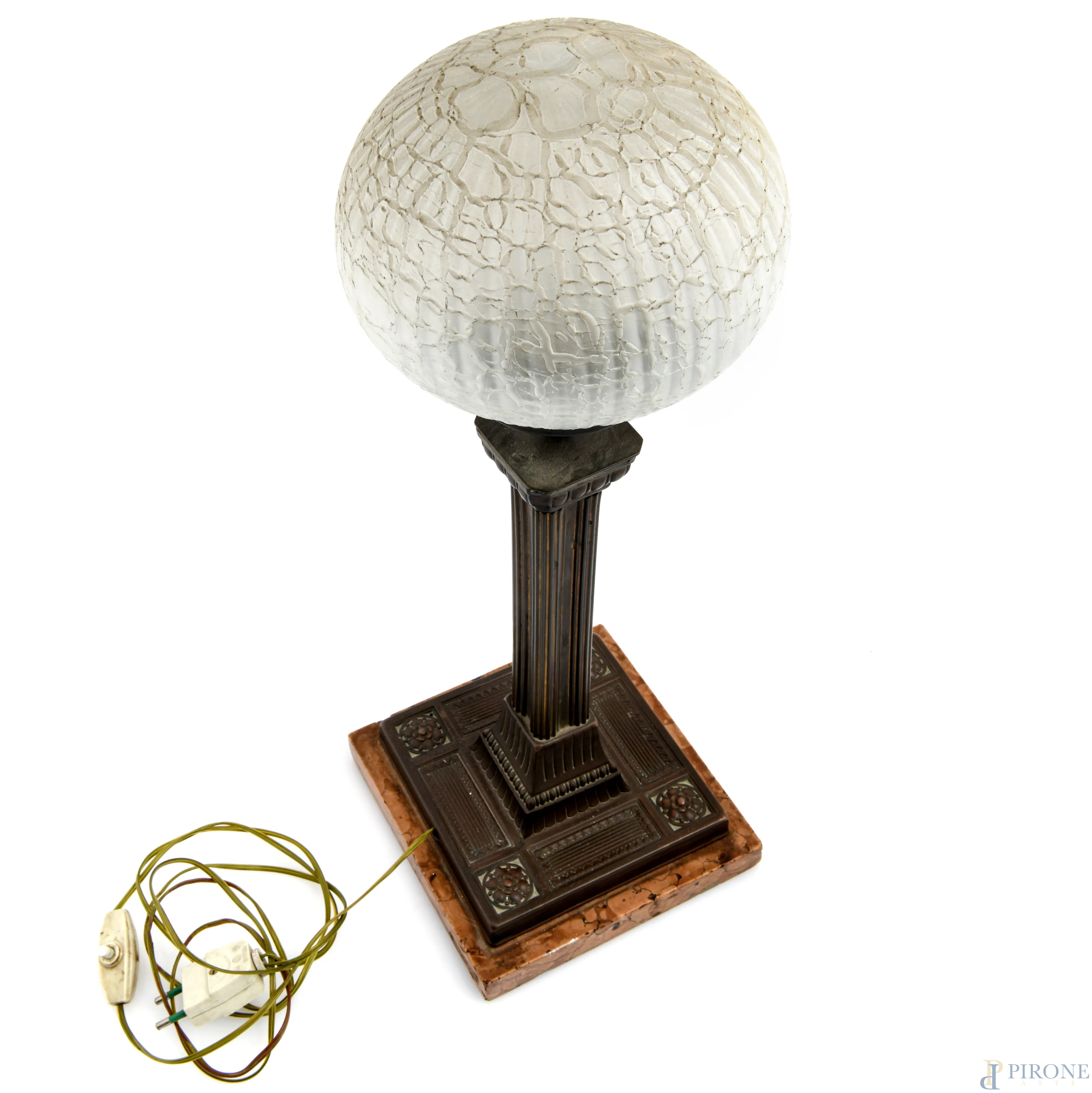 Lampada in metallo a guisa di colonna scanalata poggiante su base in marmo, XX secolo, altezza cm 36, (segni di usura, difetti, da revisionare)
