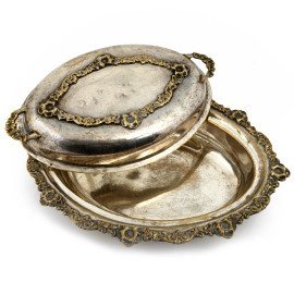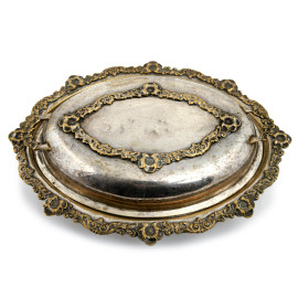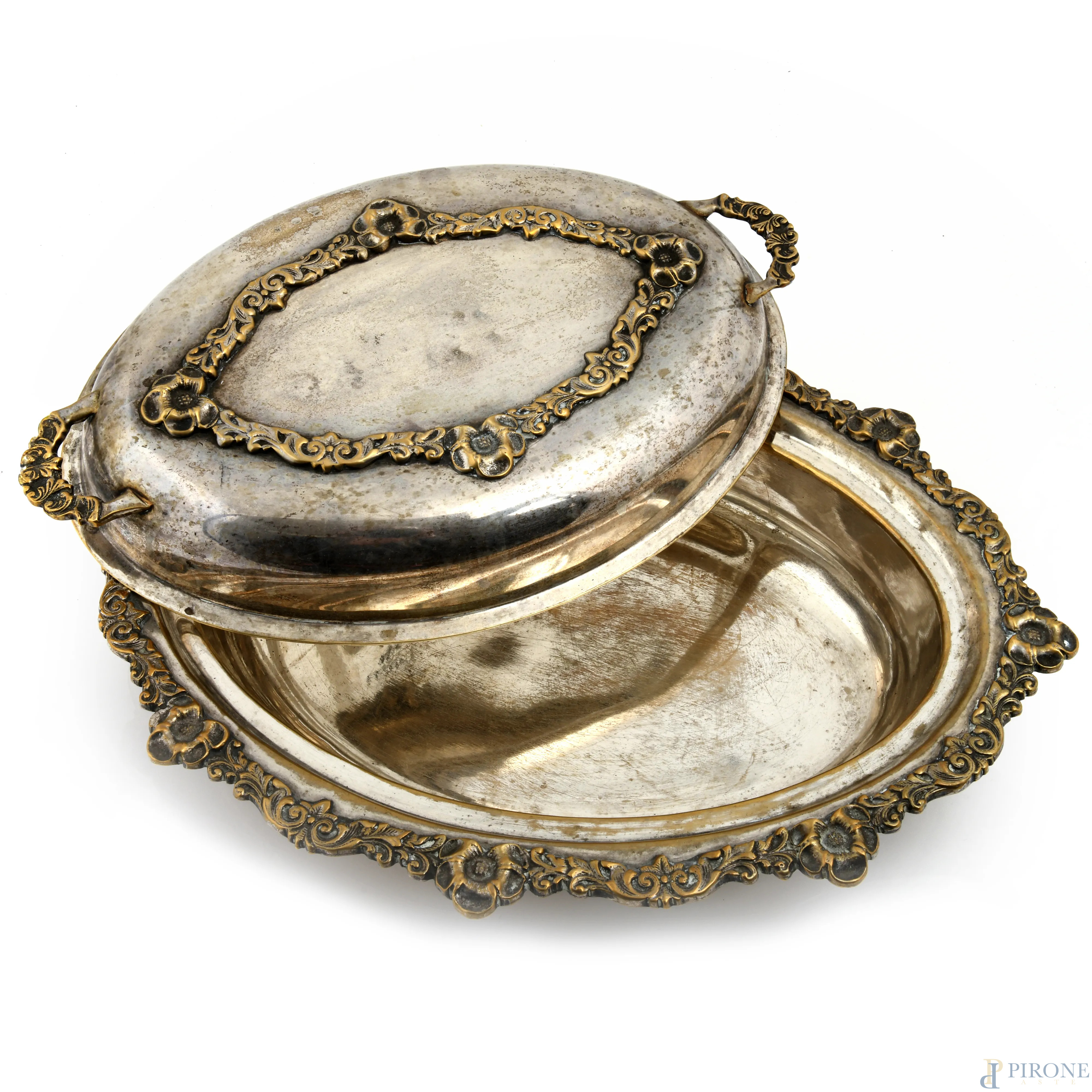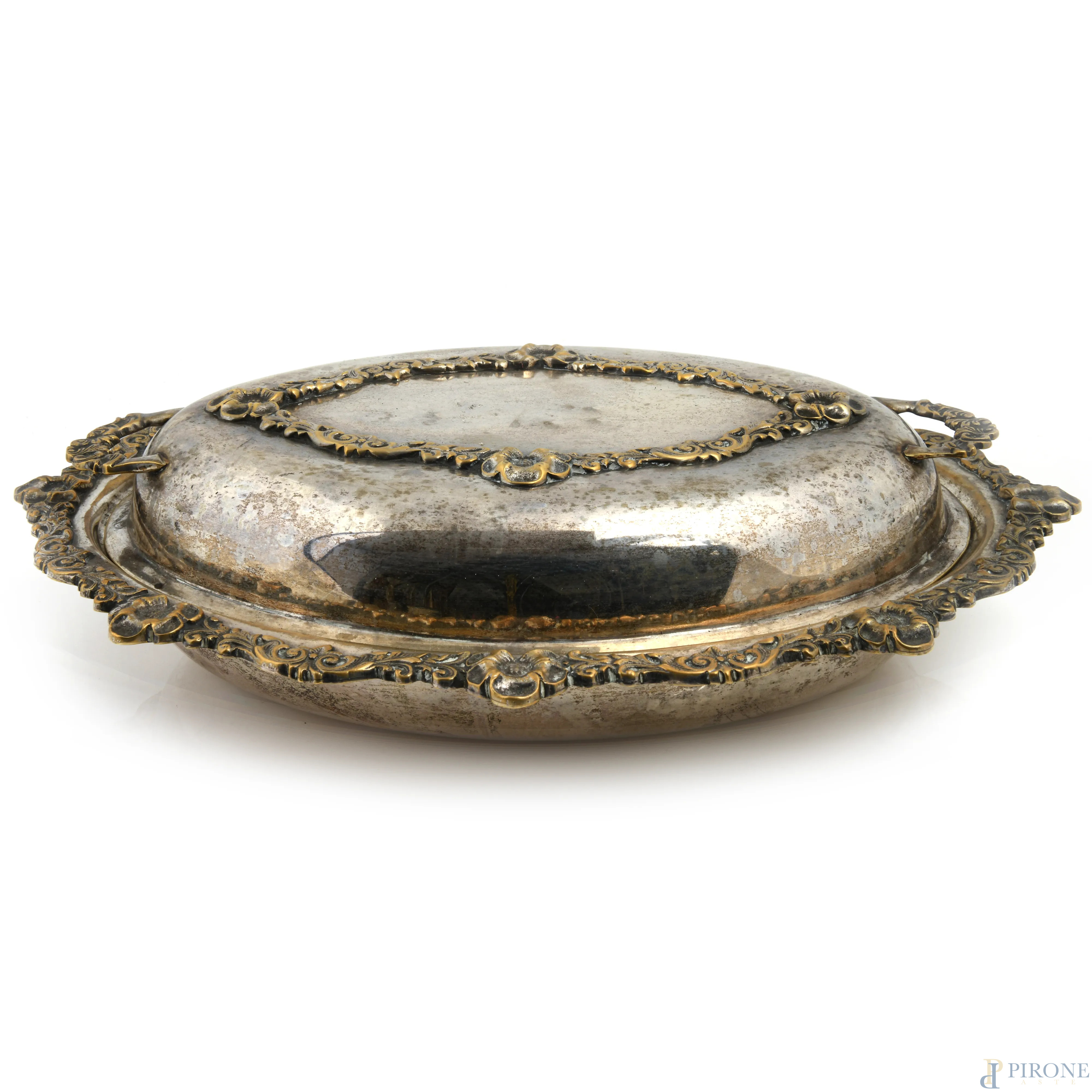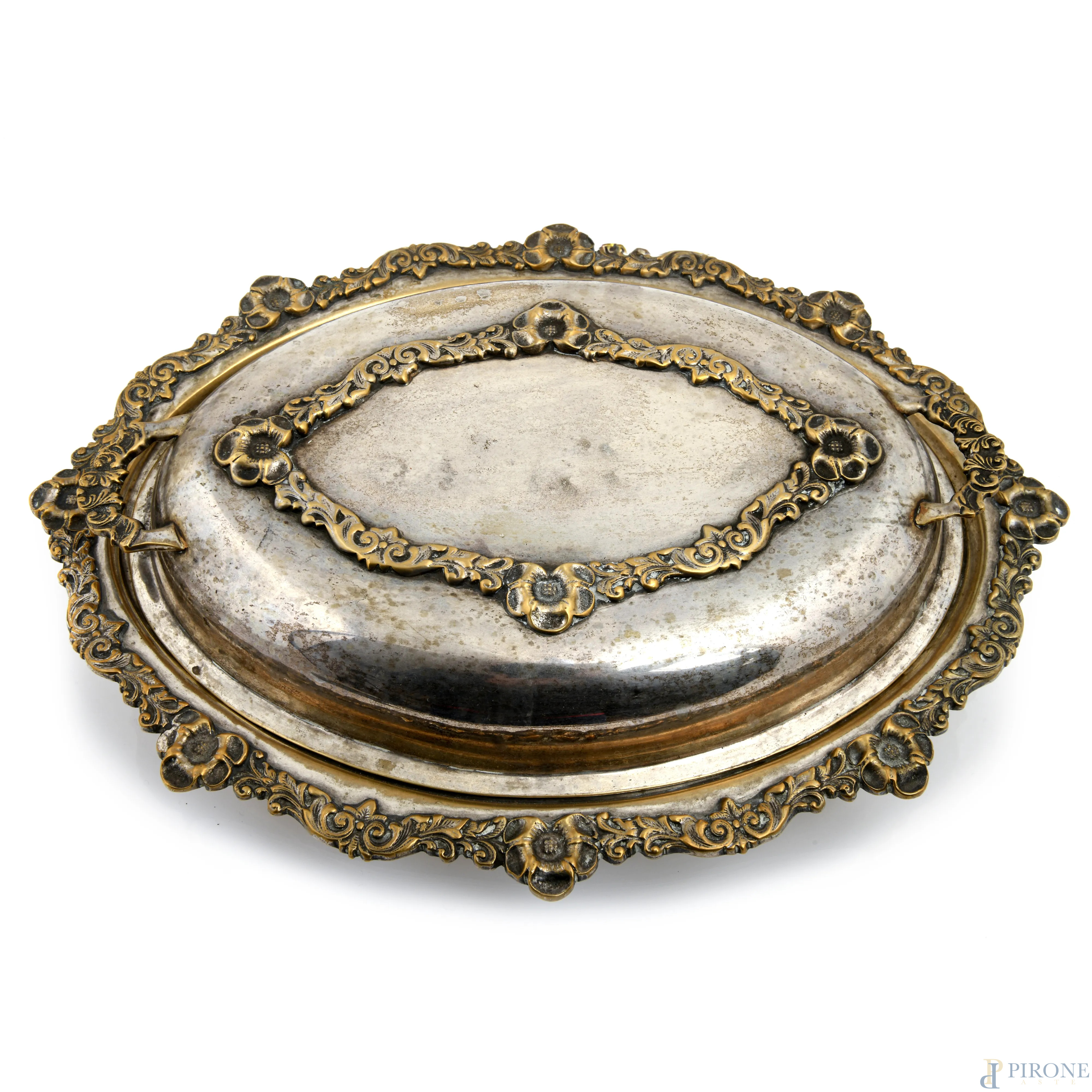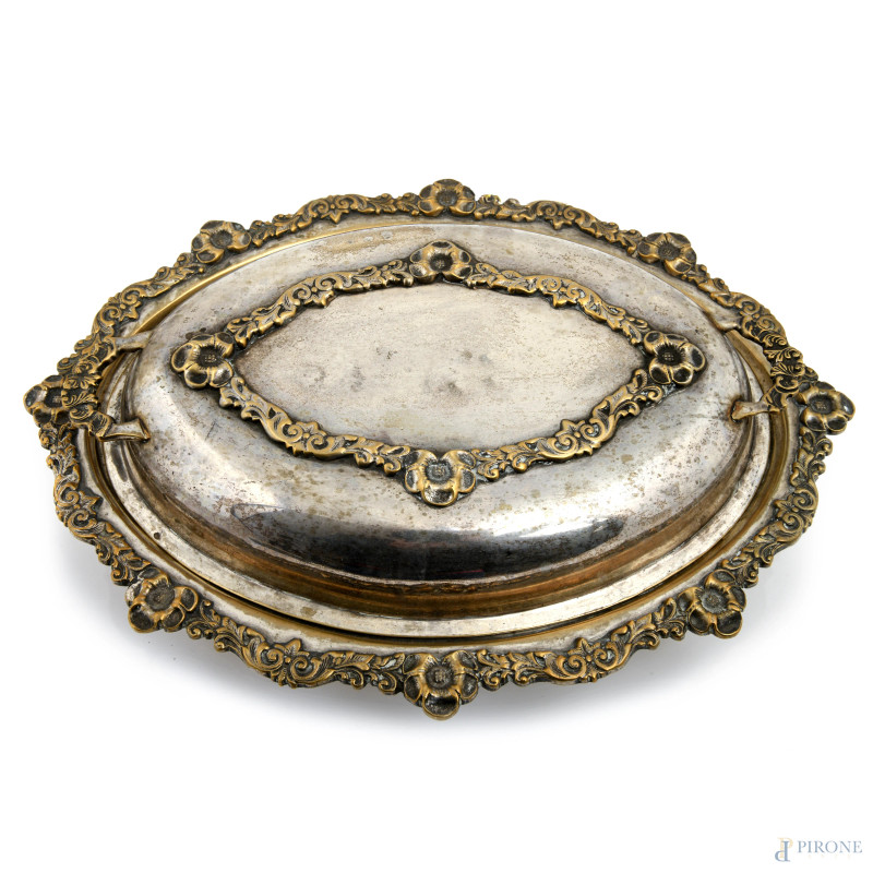 Legumiera in metallo con orlo cesellato a motivi floreali e vegetali, XX secolo, cm 8,5x33,5x26, ( lievi segni di usura)