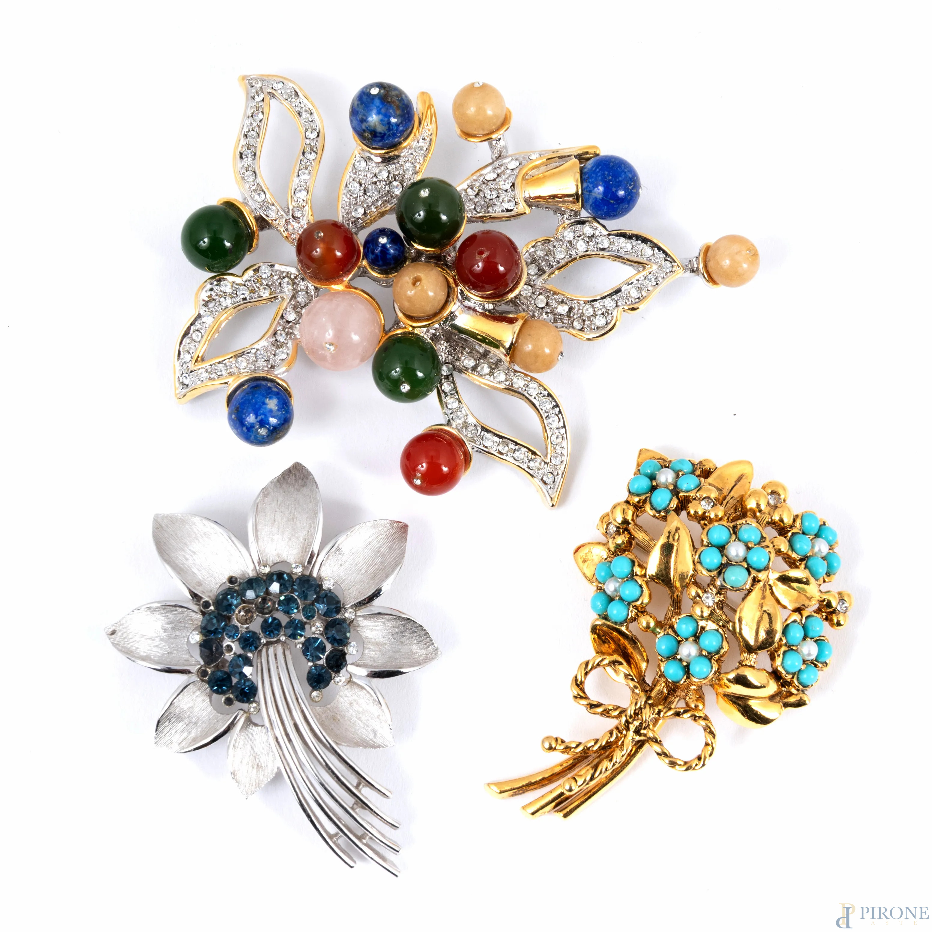 Lotto composto da 3 spille di bigiotteria, misure massime cm 10x8, (difetti)