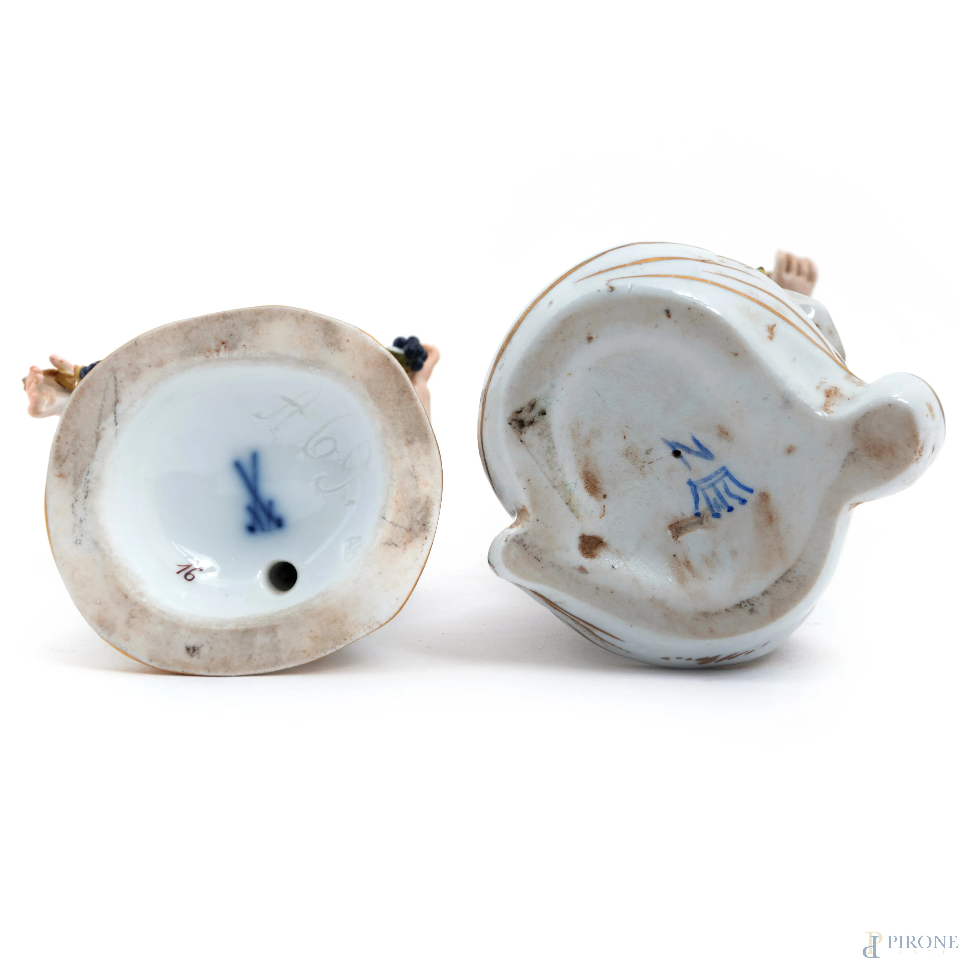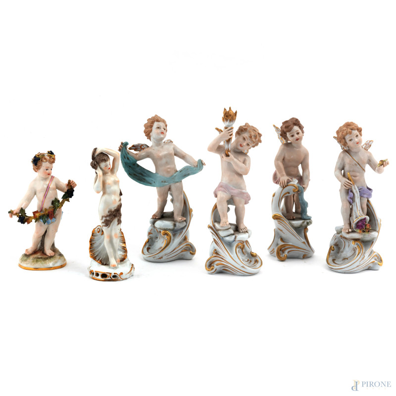 Lotto composto da 4 sculture in porcellana Capodimonte e 2 in porcellana Meissen raffiguranti angeli, XIX-XX secolo, altezza cm 18,5, (segni di usura, difetti, sbeccature)