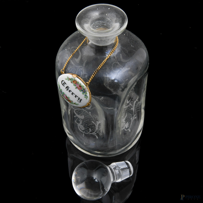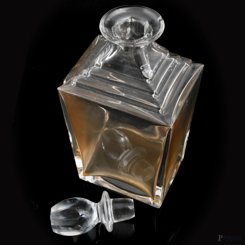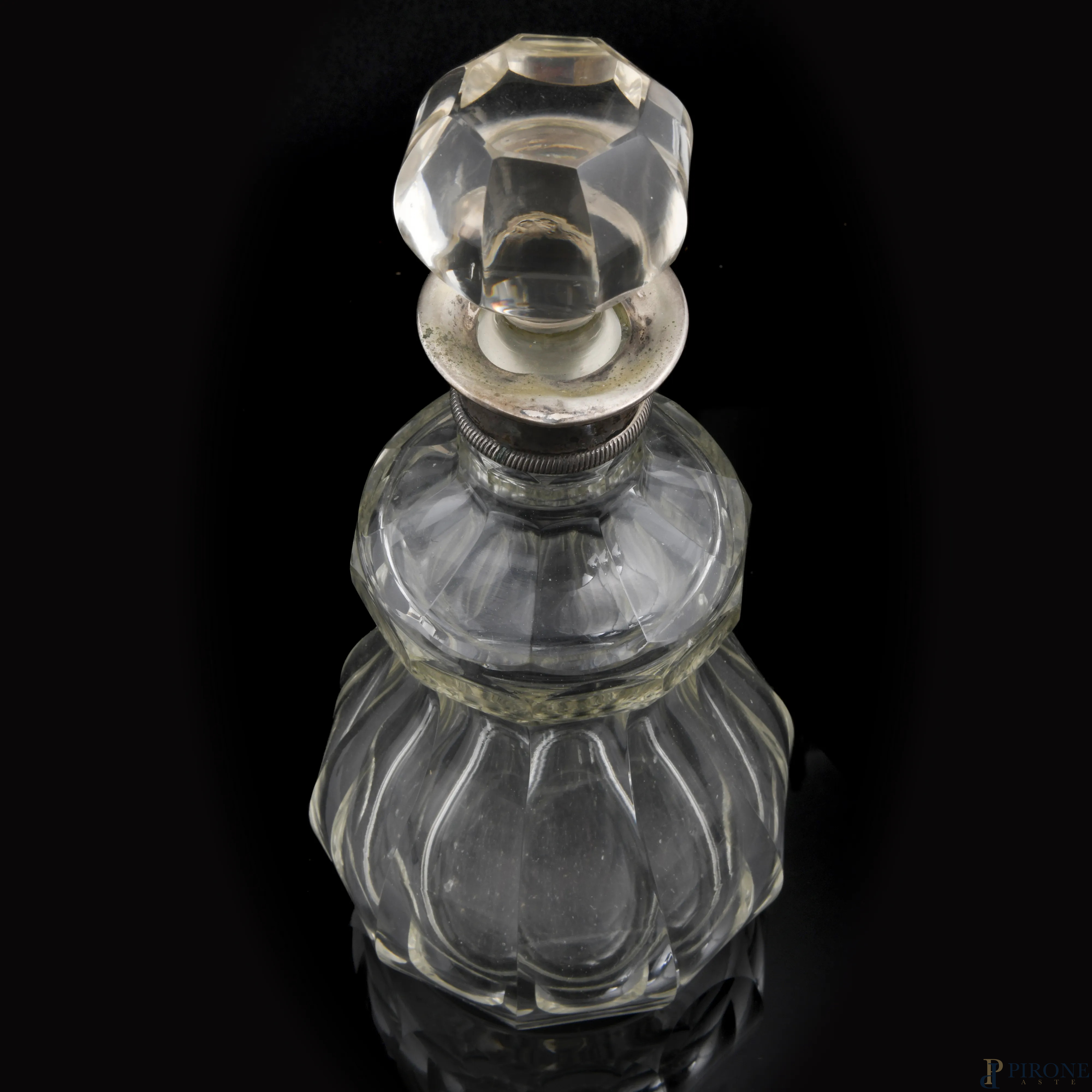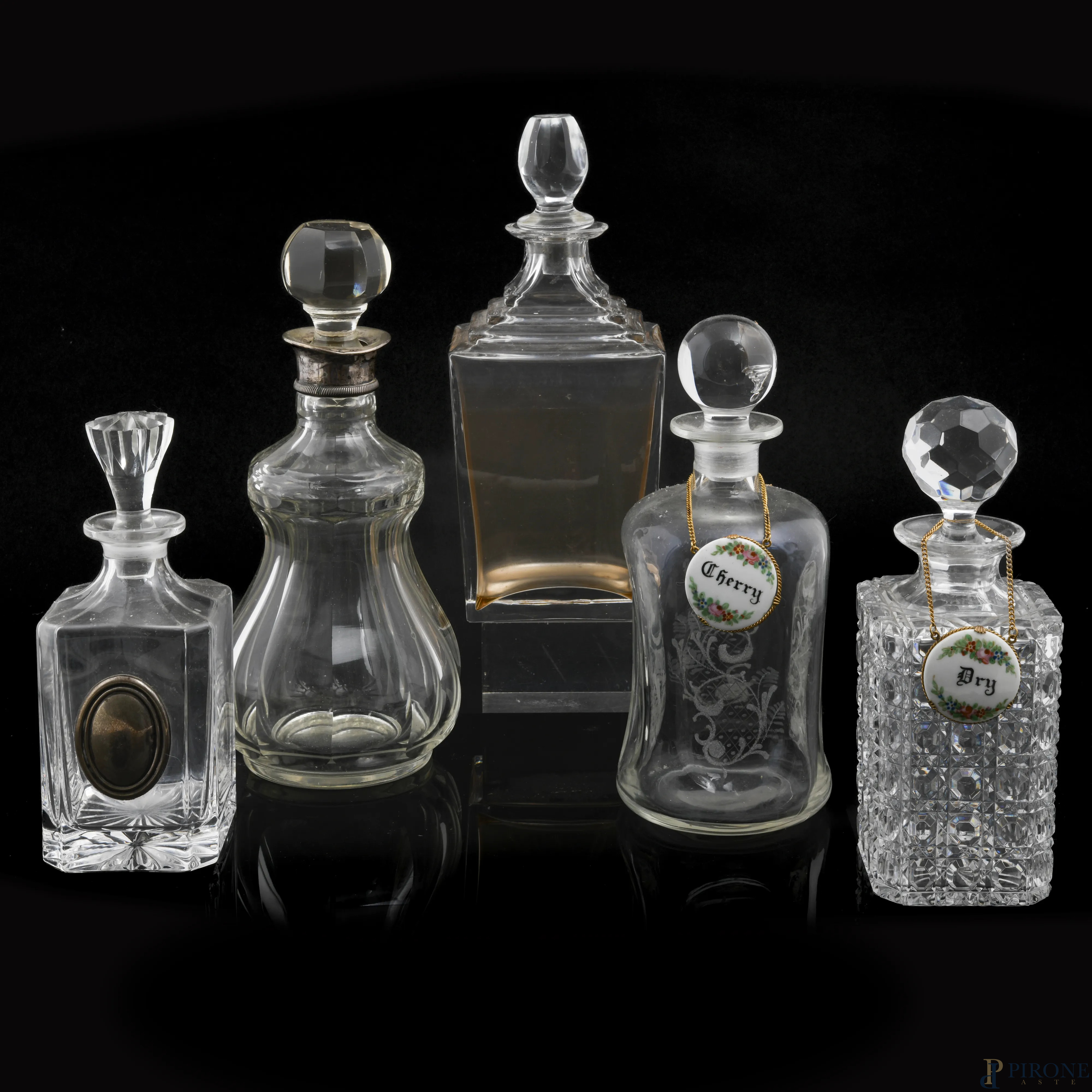 Lotto composto da 5 bottiglie in cristallo e vetro di varia foggia, XX secolo, altezza massima cm 28,5, ( segni di usura, sbeccature)
