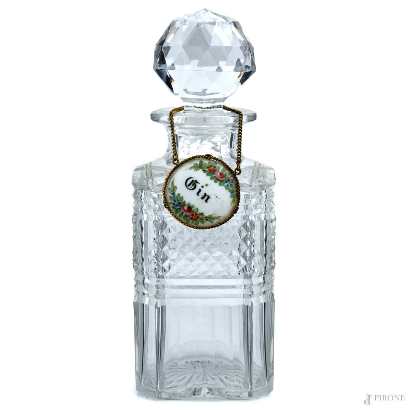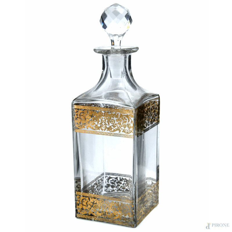 Lotto composto da 6 bottiglie in cristallo e vetro di varia foggia, XX secolo, altezza massima cm 28,5, ( sbeccature, segni di usura)