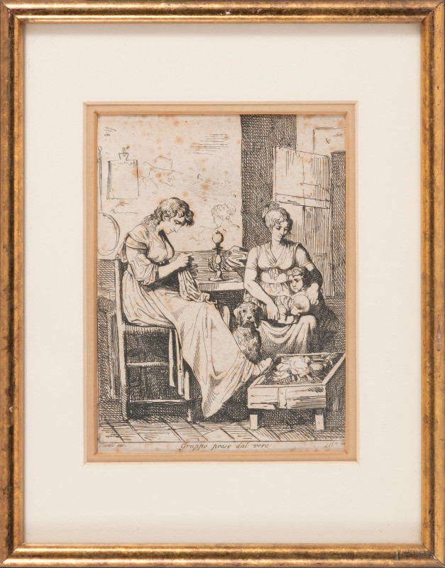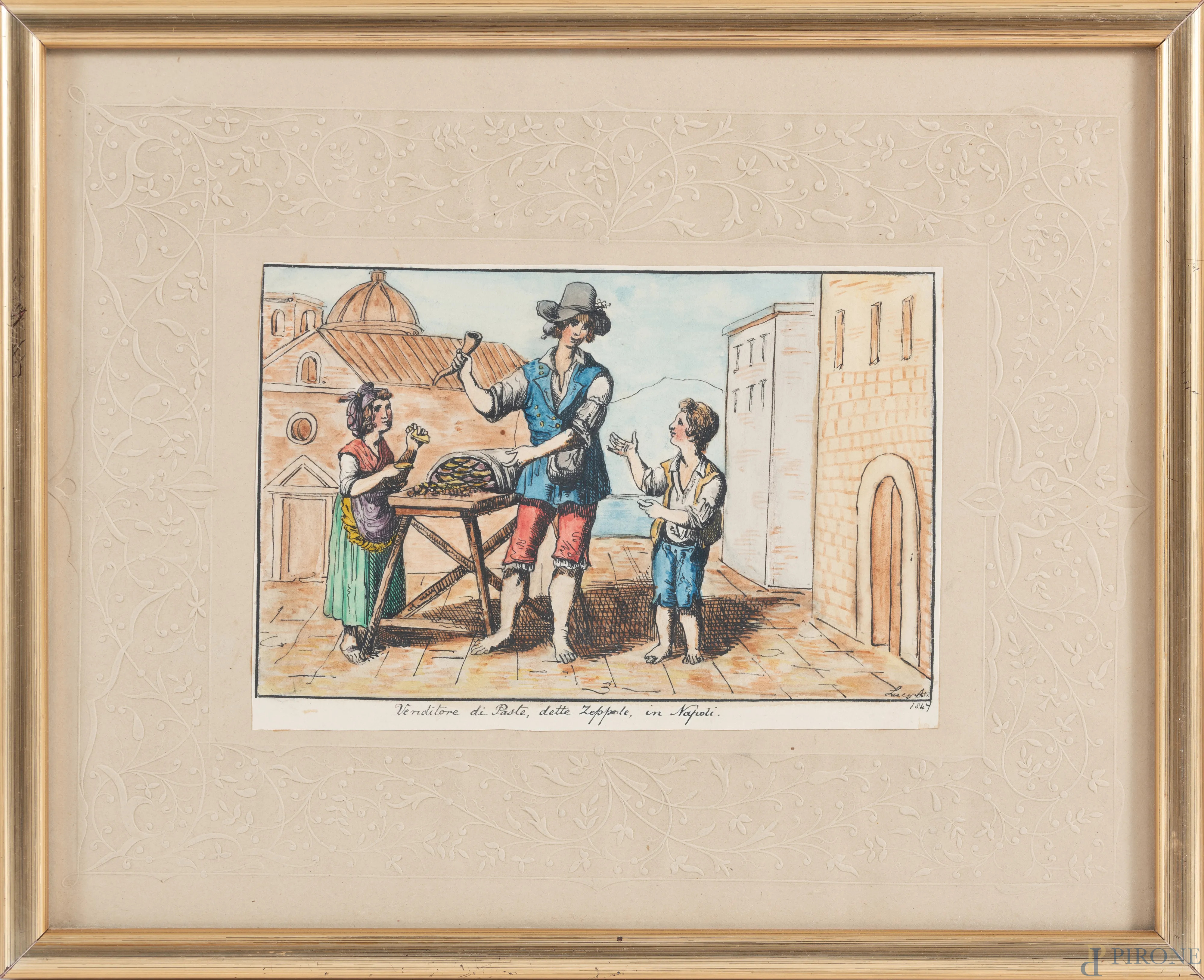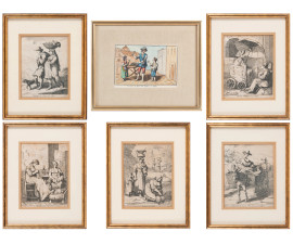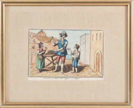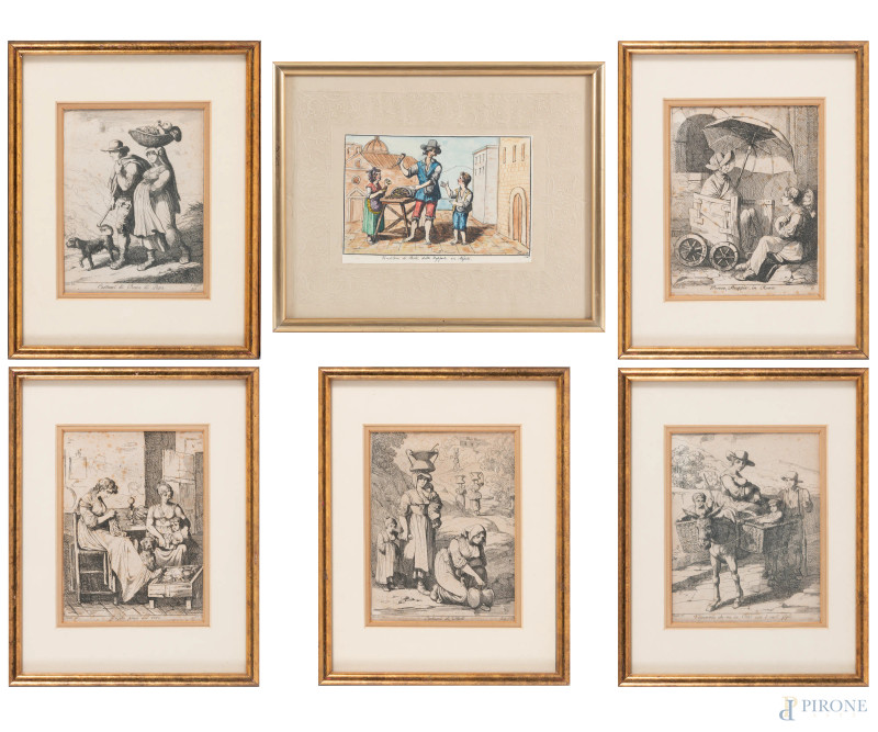 Lotto composto da cinque stampe da Bartolomeo Pinelli e una stampa a colori raffigurante venditore di zeppole (Napoli), XIX-XX secolo, misure massime cm 25x20 compreso passepartout, entro cornice, (ondulazioni della carta, foxing, tracce di umidità)