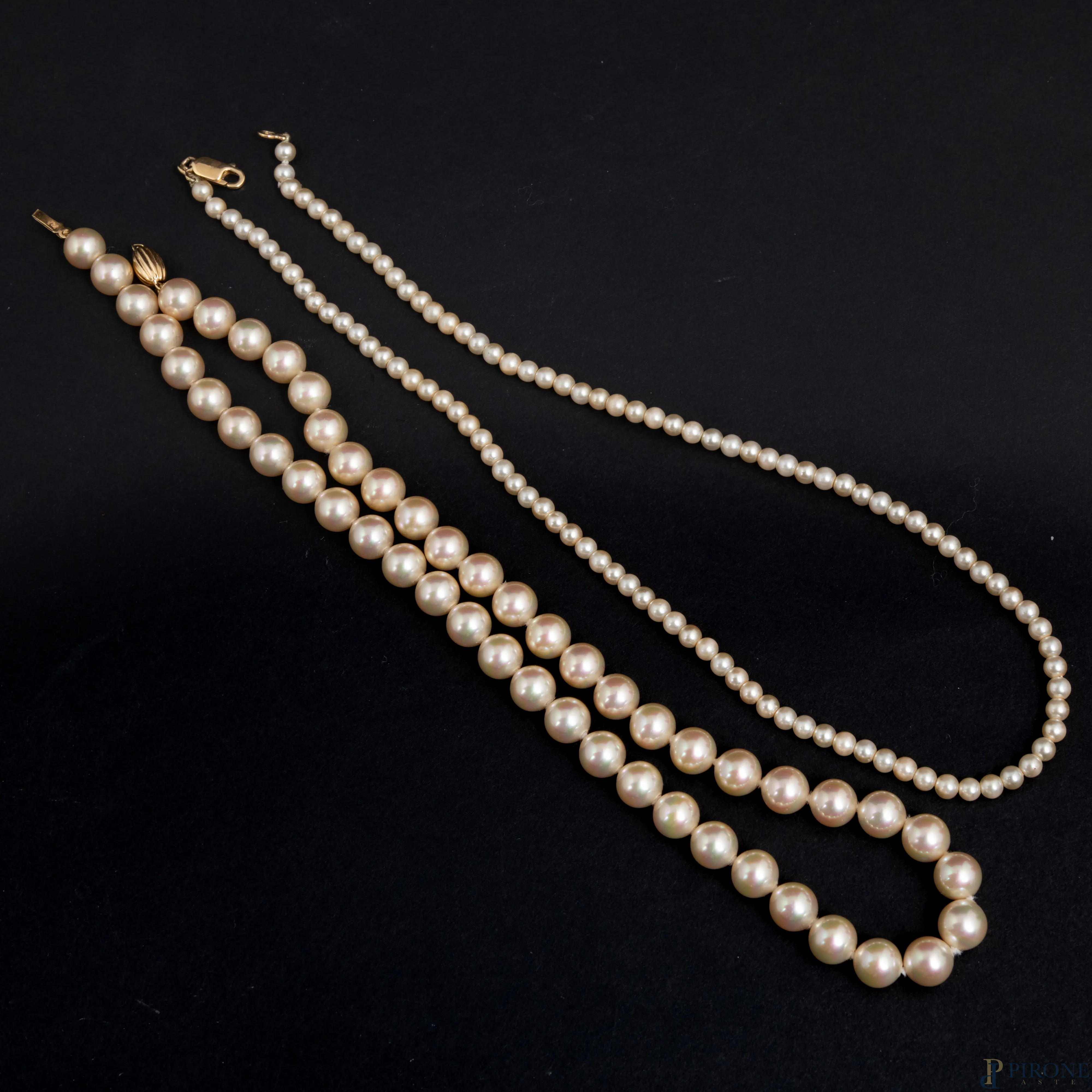 Lotto composto da due collane a un filo di perle con chiusure in oro 18 kt, lunghezza massima cm 45