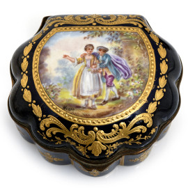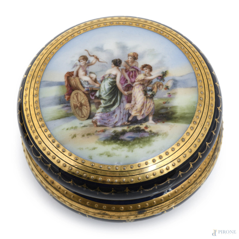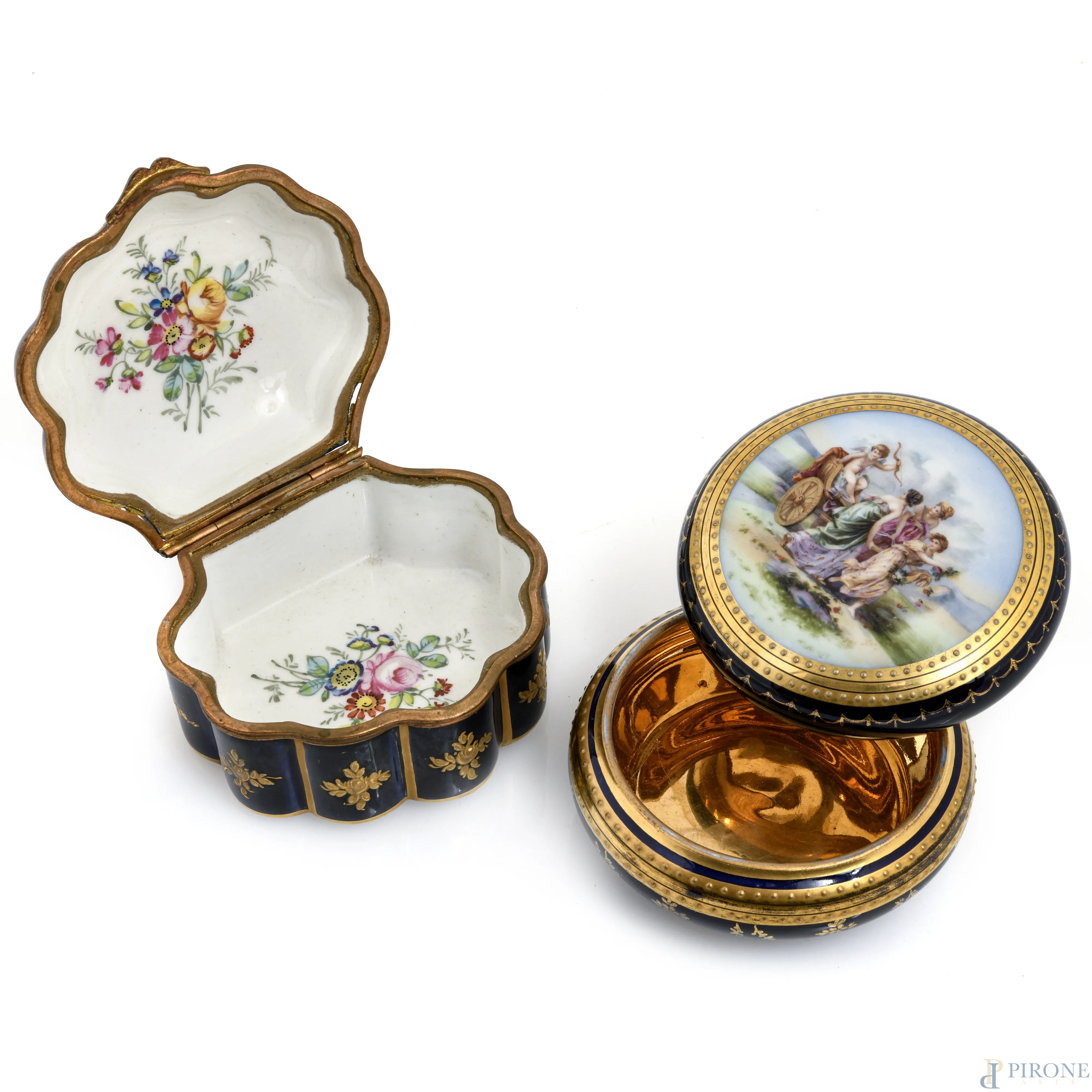 Lotto composto da due portagioie in porcellana francese e austriaca nei toni del blu e dell'oro con scene galanti-mitologiche al coperchio, XX secolo, misure massime cm 5,5x9x10, (segni di usura)