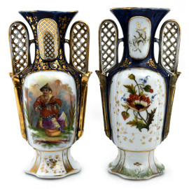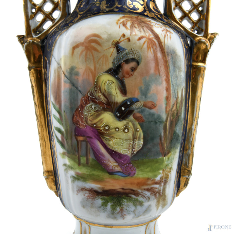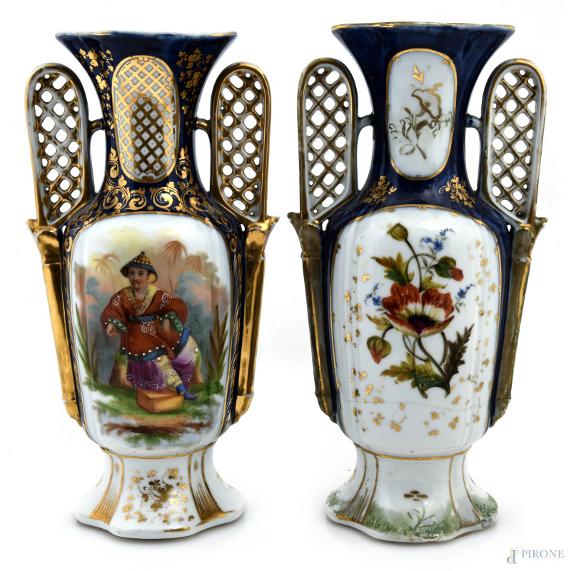 Lotto composto da due vasi in porcellana nei toni del blu e dell'oro con decori floreali e figure orientali, XIX-XX, altezza cm 36,6,(segni usura, felature, rotture, restauri, perdita di smalto e doratura)