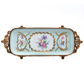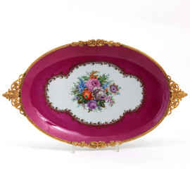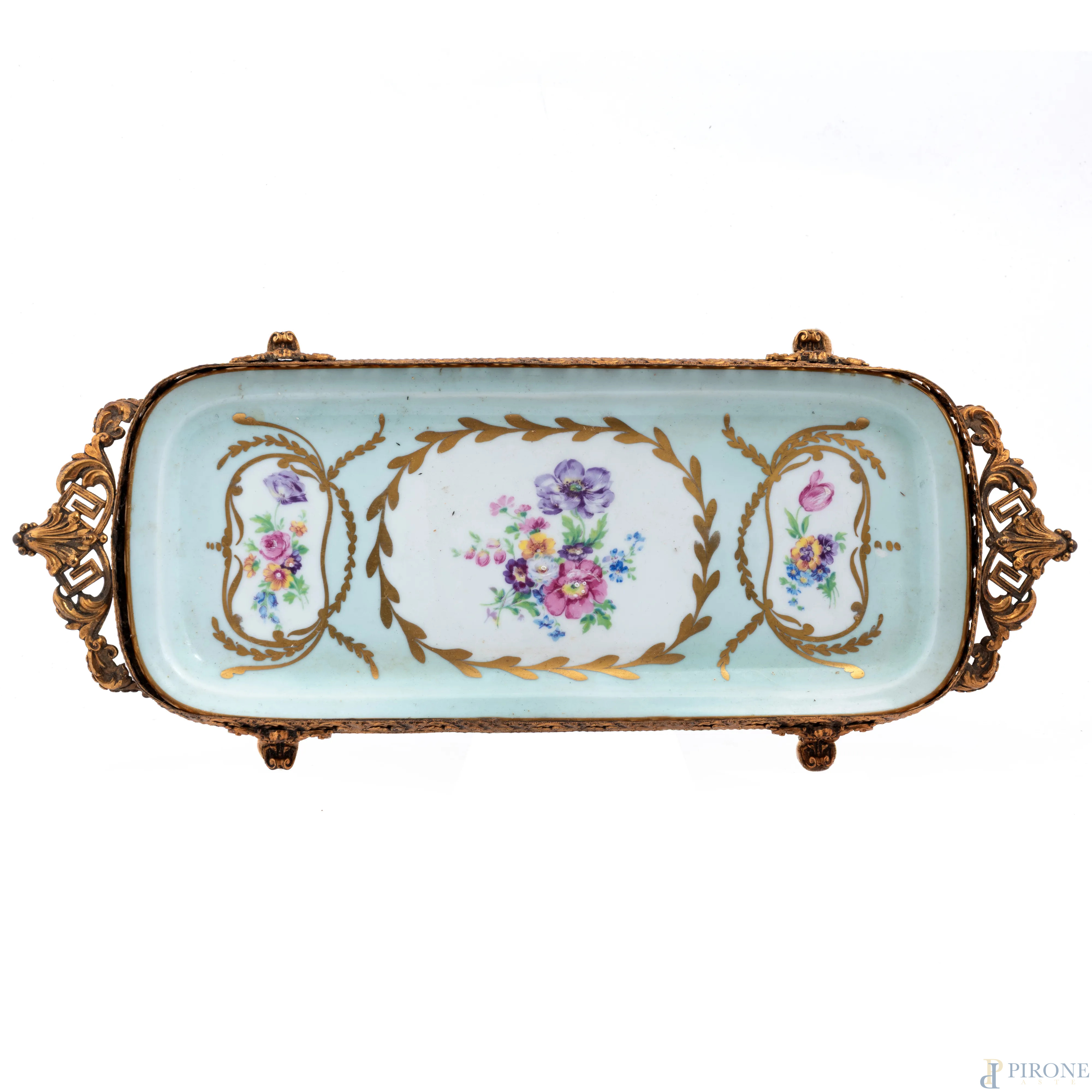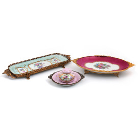 Lotto composto da due vassoi, un piattino e portacandela in porcellana Limoges, XX secolo, misure massime 46,5x22,5, (difetti, rotture, restauri)