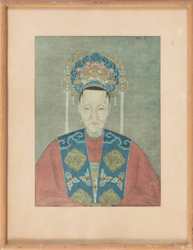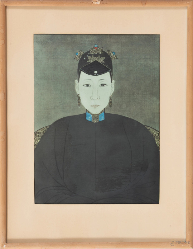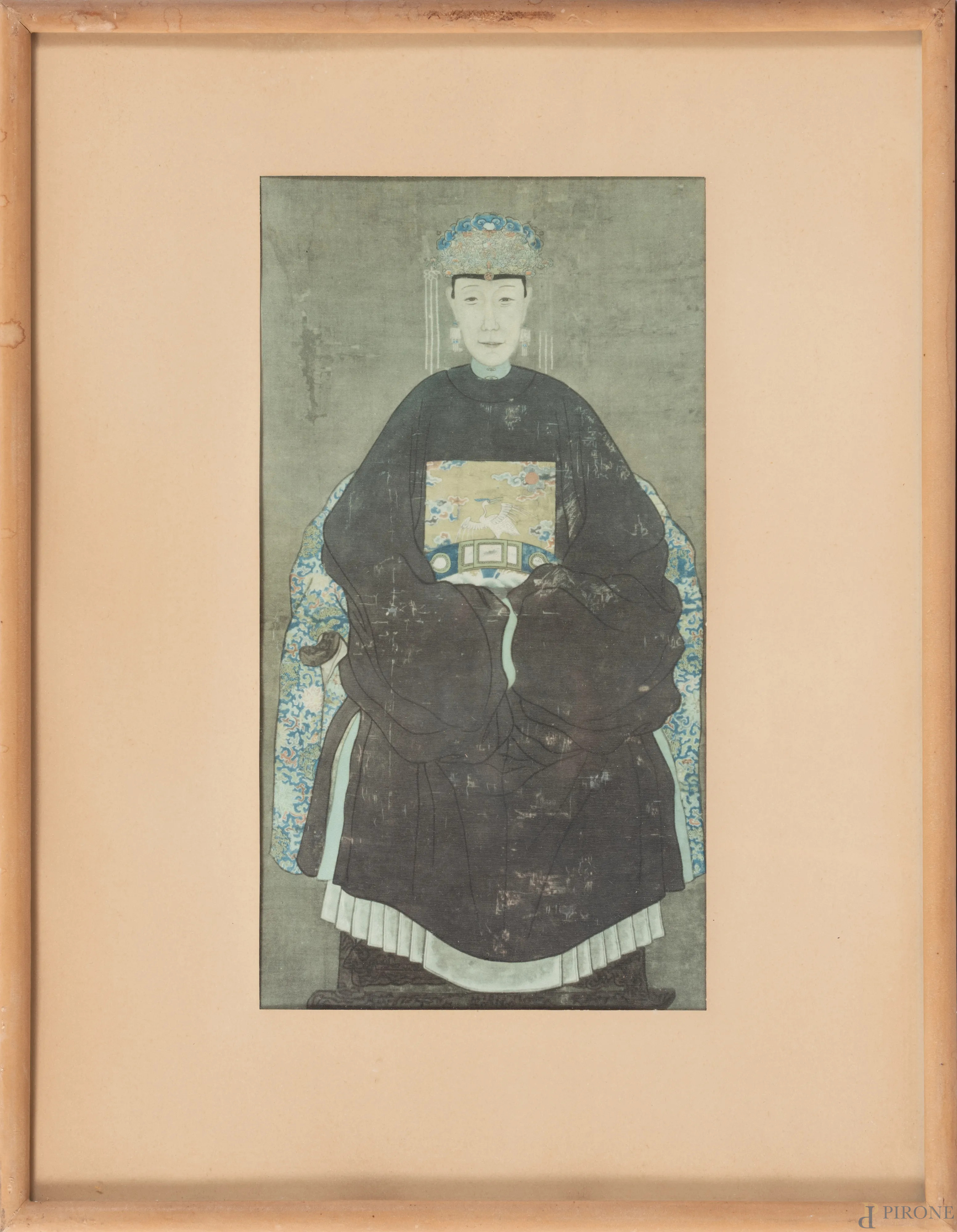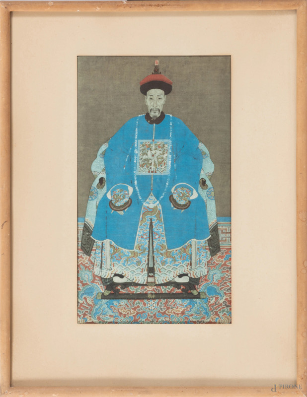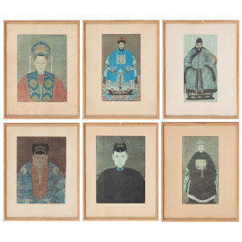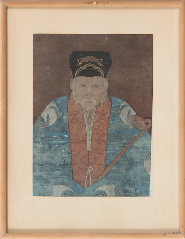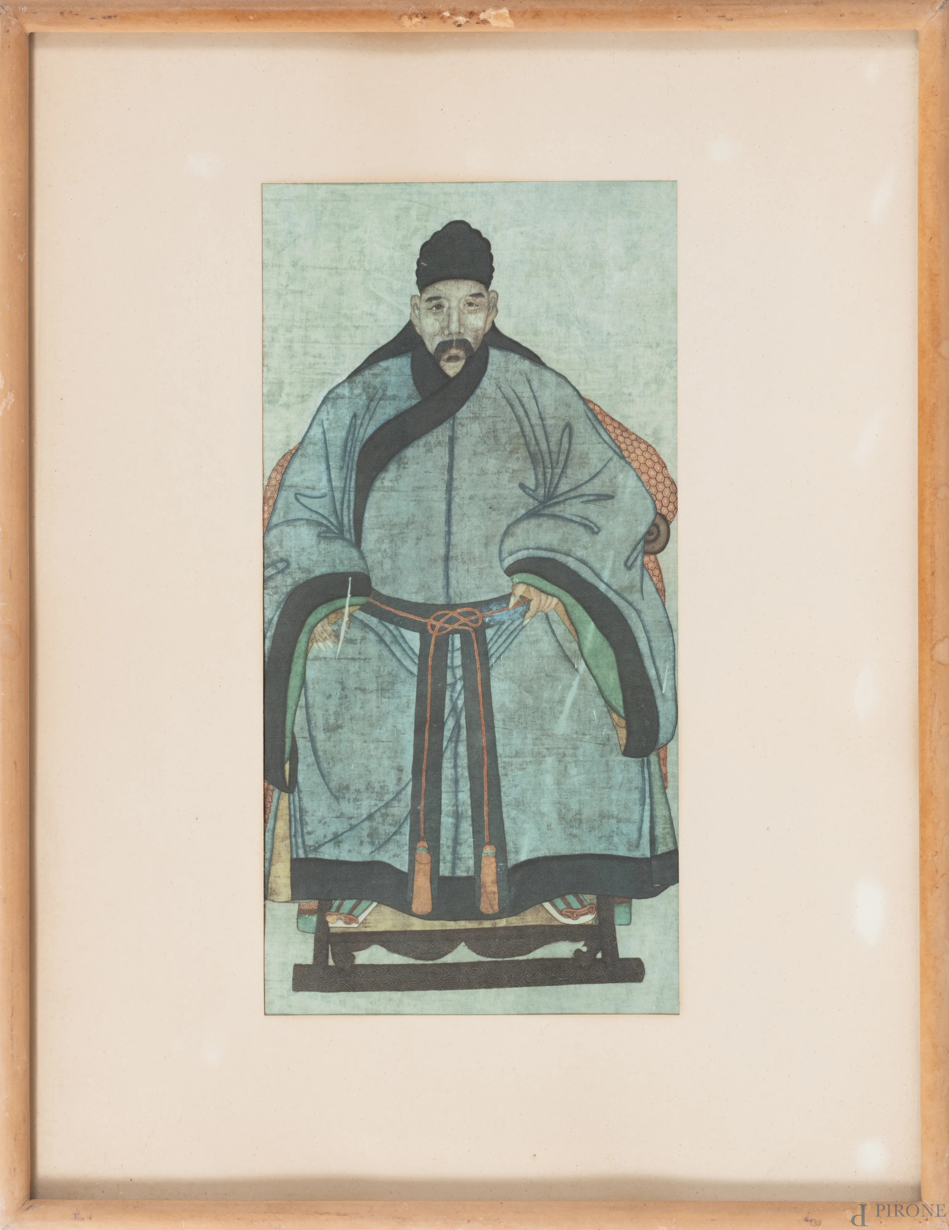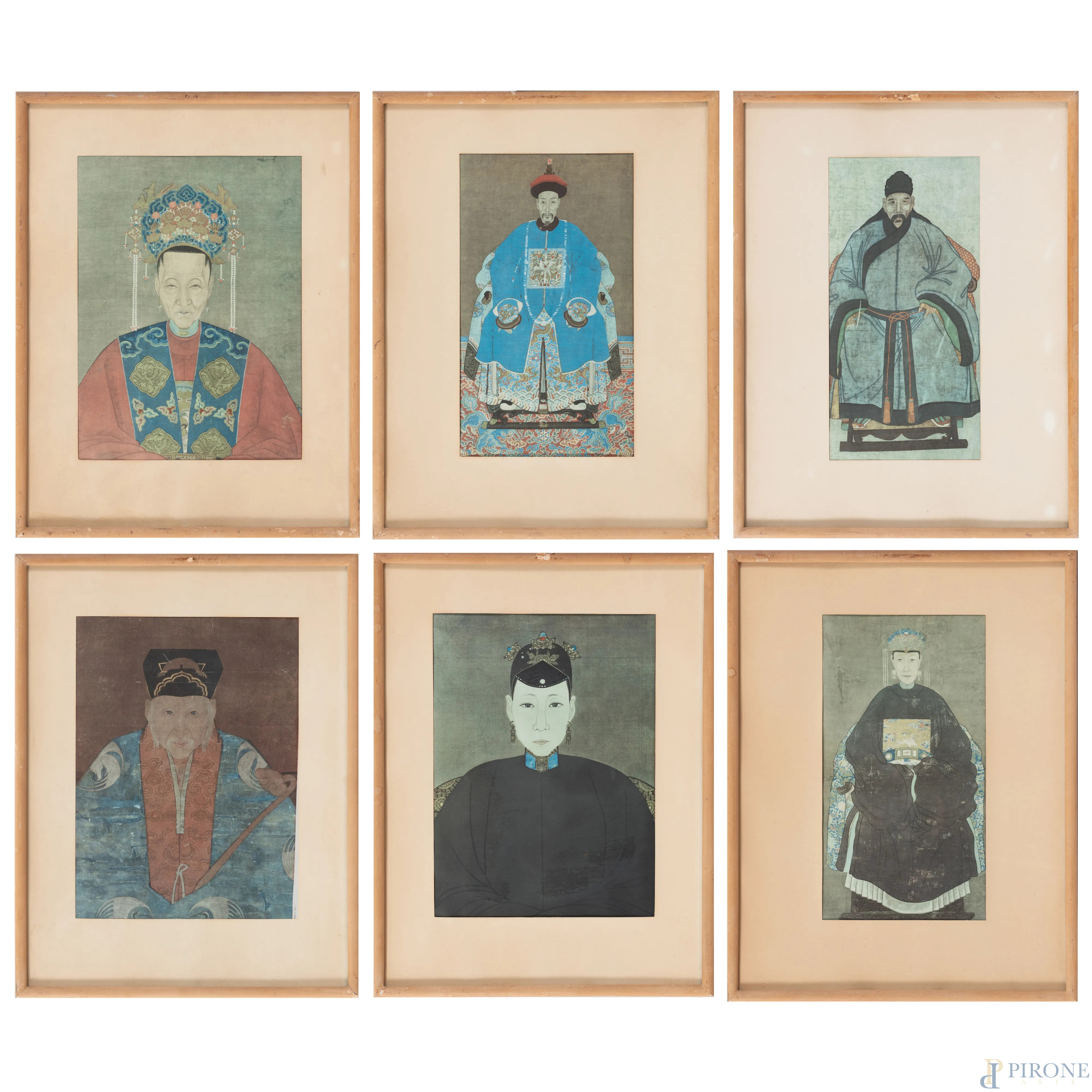 Lotto composto da sei stampe su tessuto raffiguranti dignitari cinesi, XX secolo, cm42x32 compreso passepartout , entro cornice, (segni di usura)