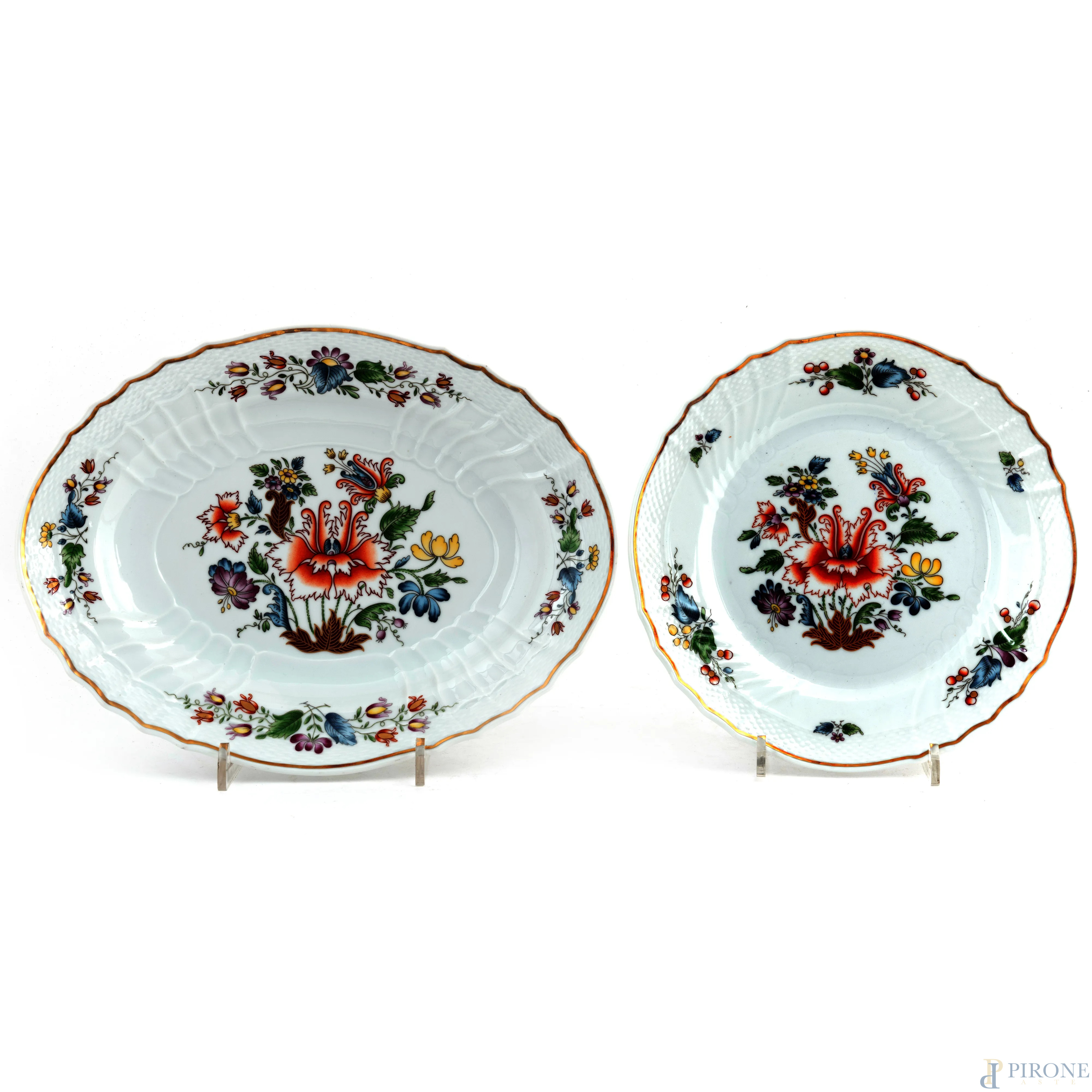 Lotto composto da vassoio e piatto in porcellana Ginori decorato a motivi floreali, XX secolo, misure massime cm 33,5x25,5, (segni di usura, difetti)