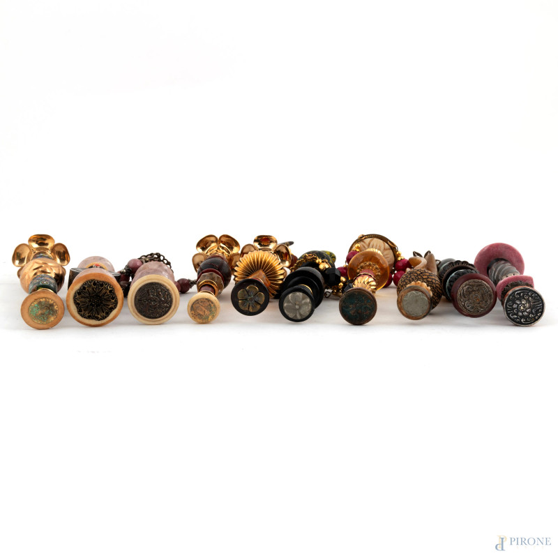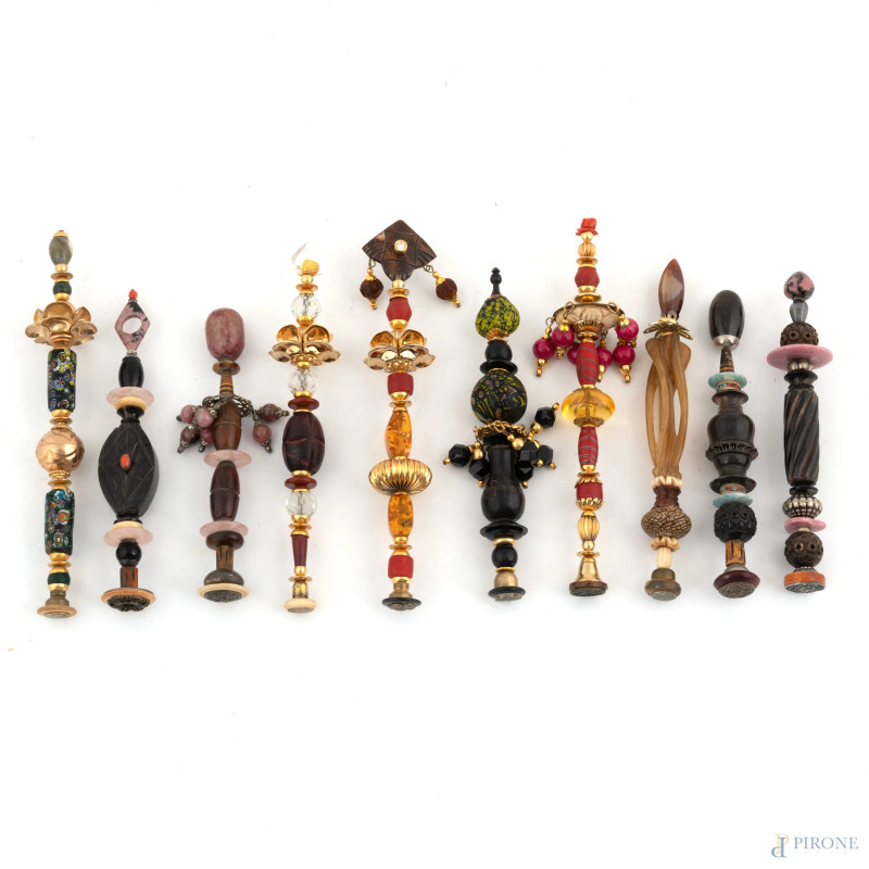 Lotto di dieci sigilli in materiali vari, XX secolo, altezza massima cm 23, (segni di usura, difetti)