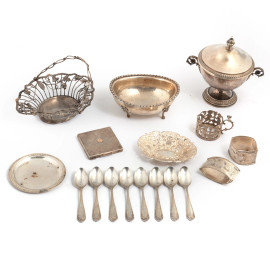 Lotto di oggetti in argento di varia manifattura, misure massime, cm 14x17, peso complessivo lordo gr 840, (segni di usura, difetti)