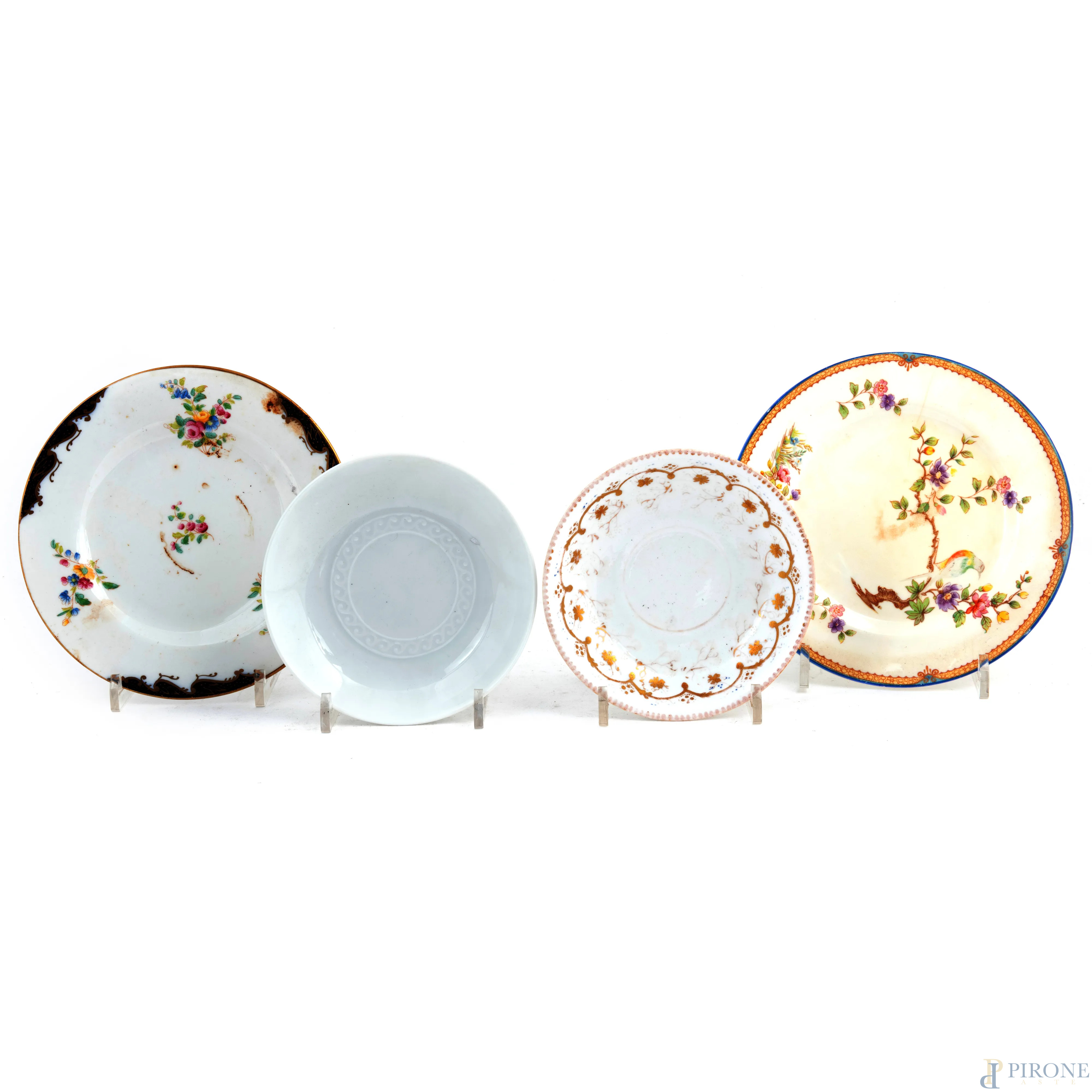 Lotto di quattro piatti in porcellana di foggia e manifattura varia, XX secolo, diametro massimo cm 18, (segni di usura, scalfiture, difetti)