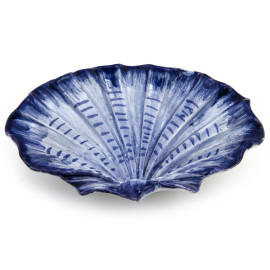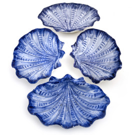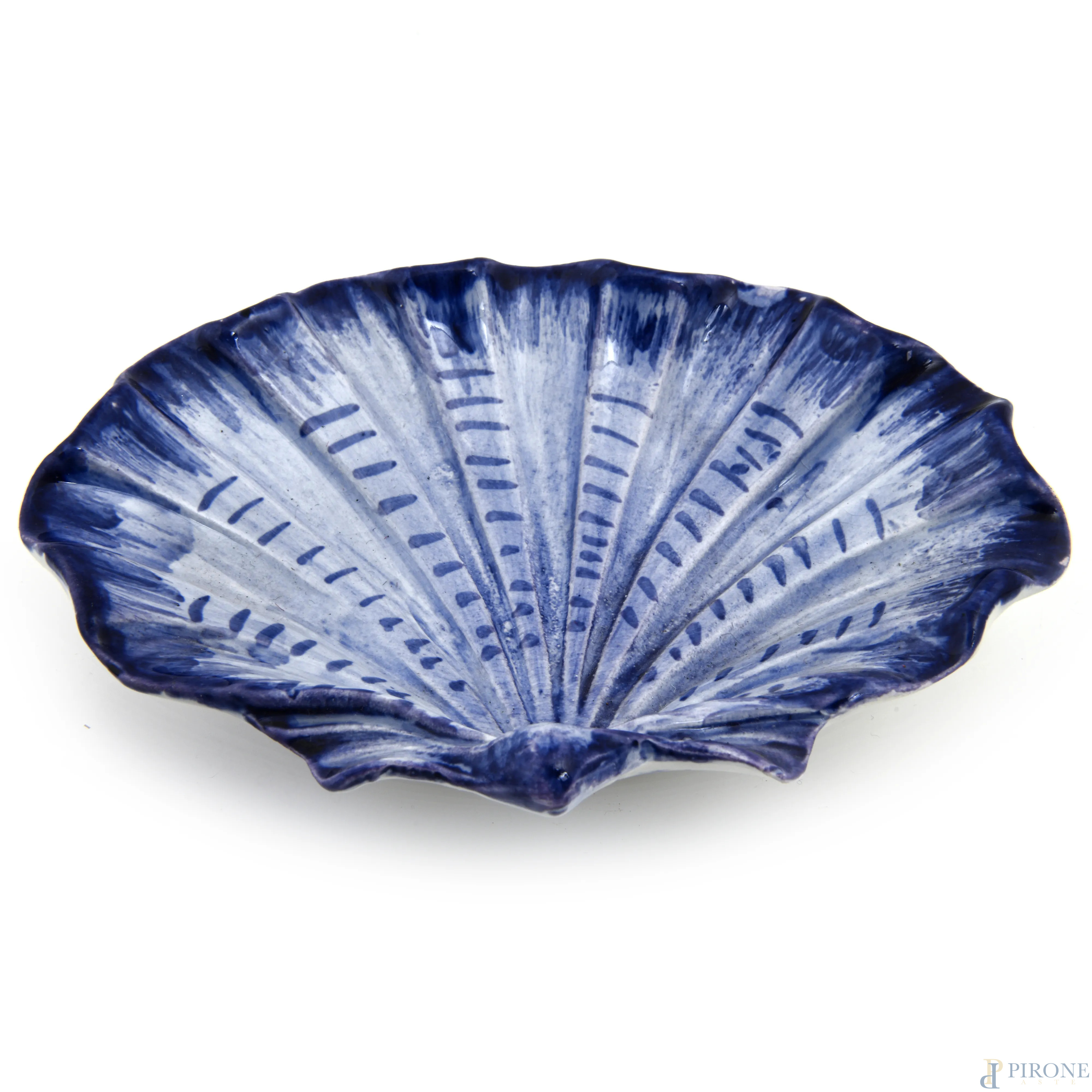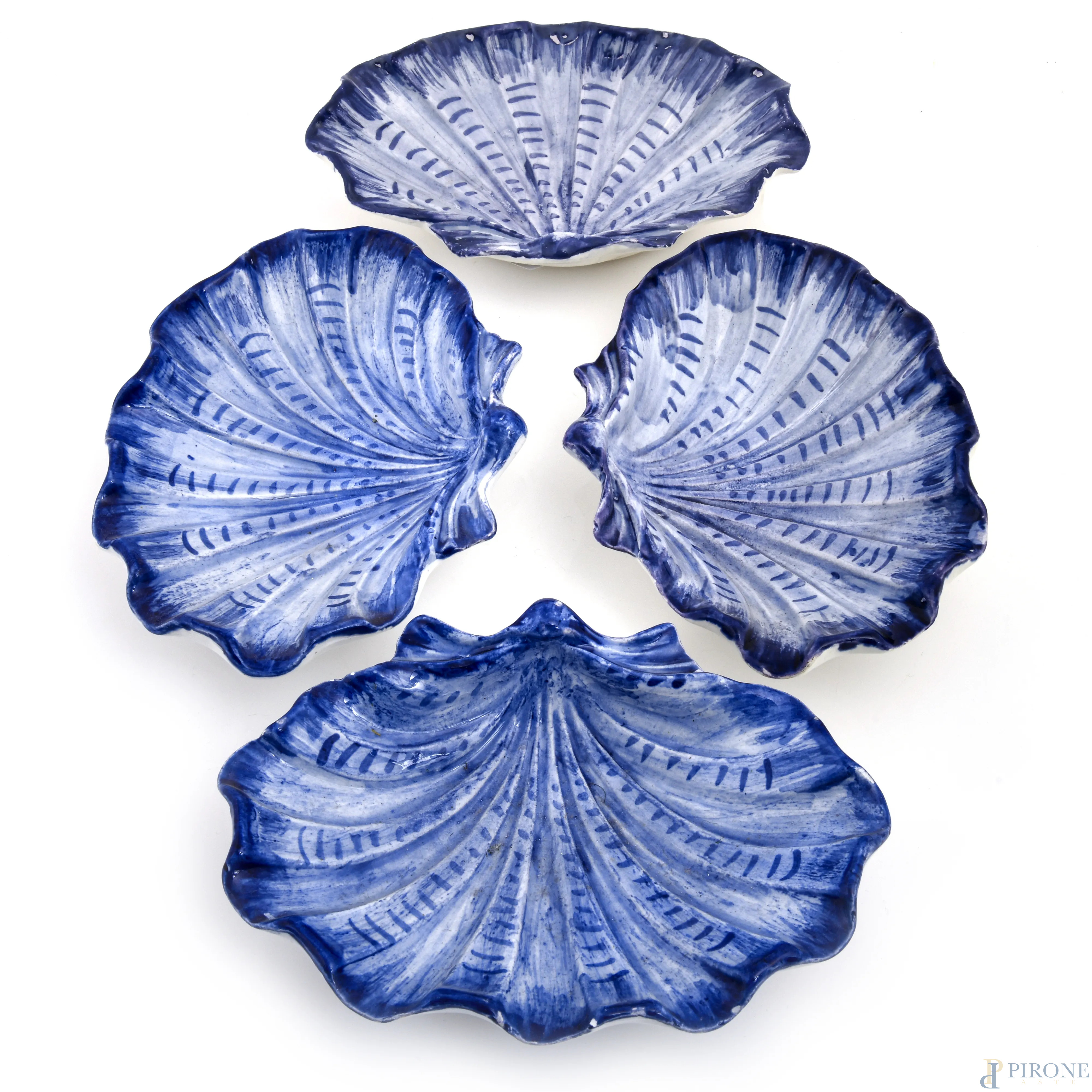Lotto di quattro piattini da antipasto in porcellana a foggia di conchiglia nei toni del blu, XX secolo, cm 3,5x15,5x11, (segni di usura, scalfiture, difetti)