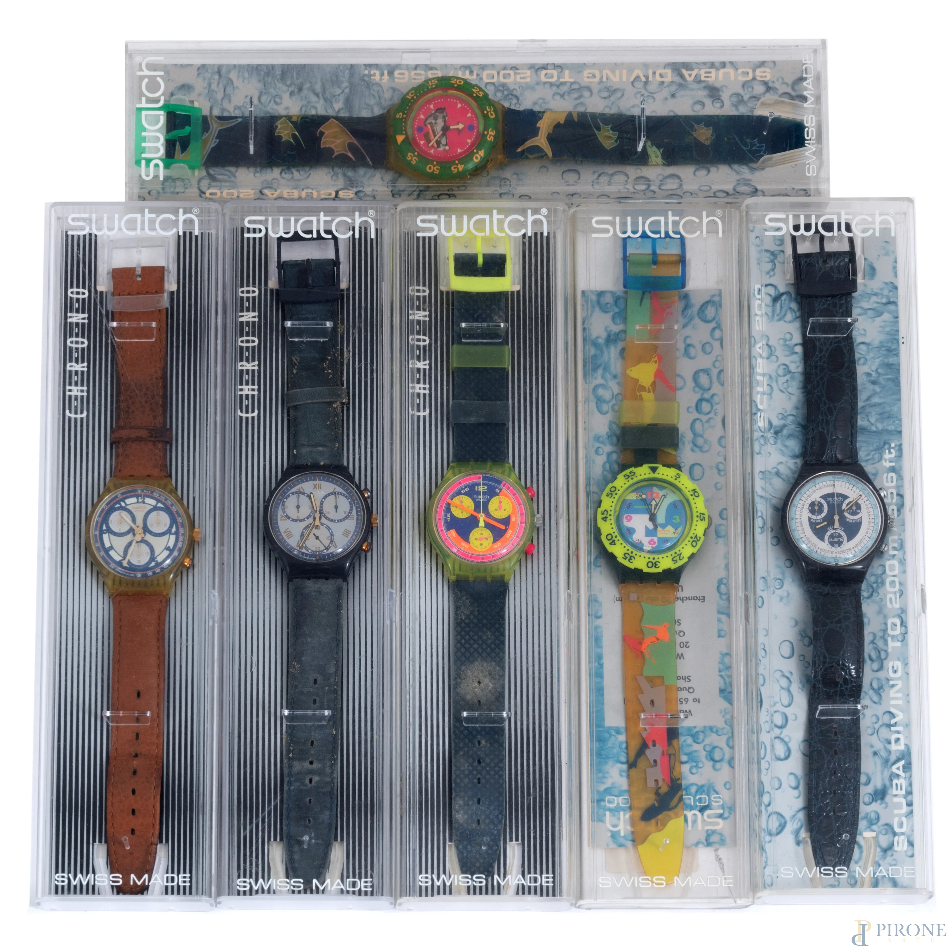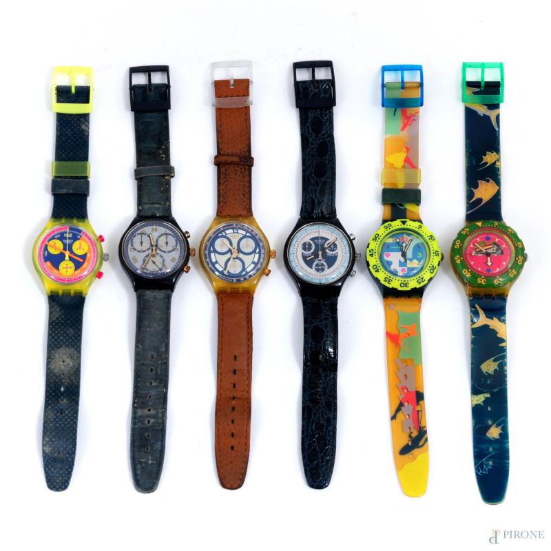 Lotto di sei orologi Swatch, misura massima cm 23, (segni di usura, da revisionare)