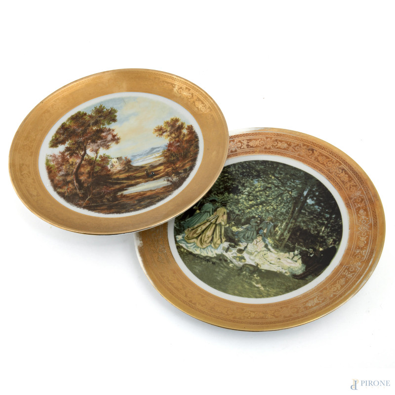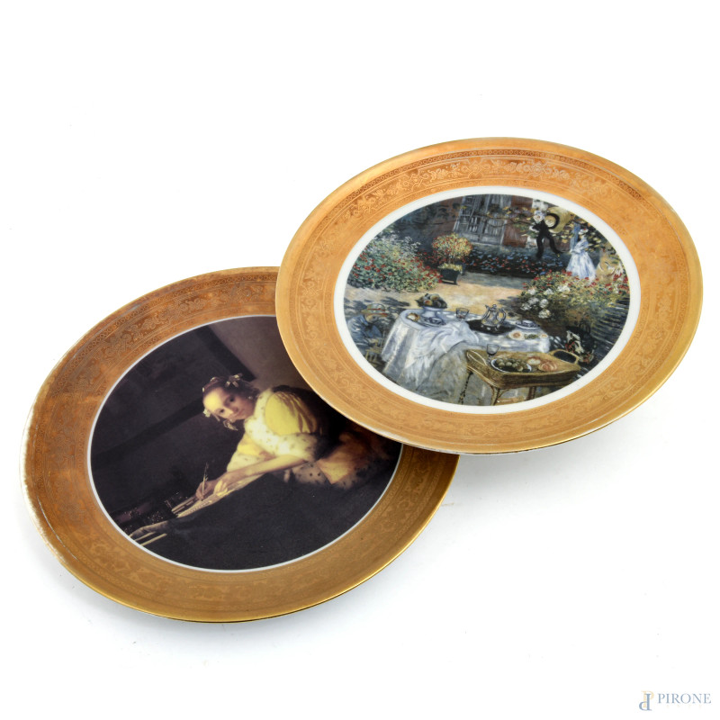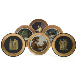 Lotto di sei piatti in porcellana tedesca con profilo dorato e riproduzione a stampa di dipinti e sculture antiche, XX secolo, diametro cm 26, (segni di usura, sbeccature, perdite di doratura)