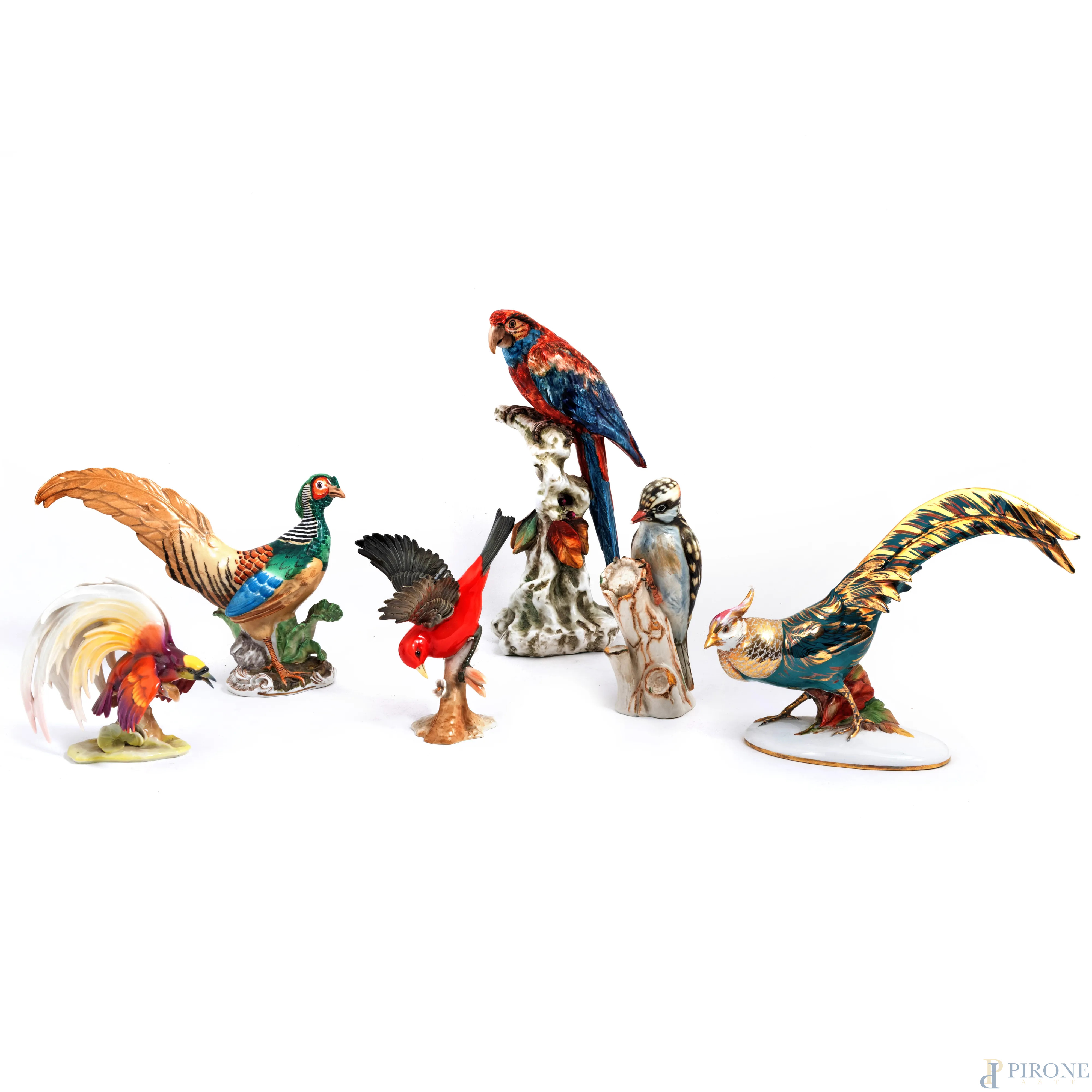 Lotto di sei sculture in porcellana raffiguranti volatili, XX secolo, altezza massima cm 30, (segni di usura, scalfiture, difetti)
