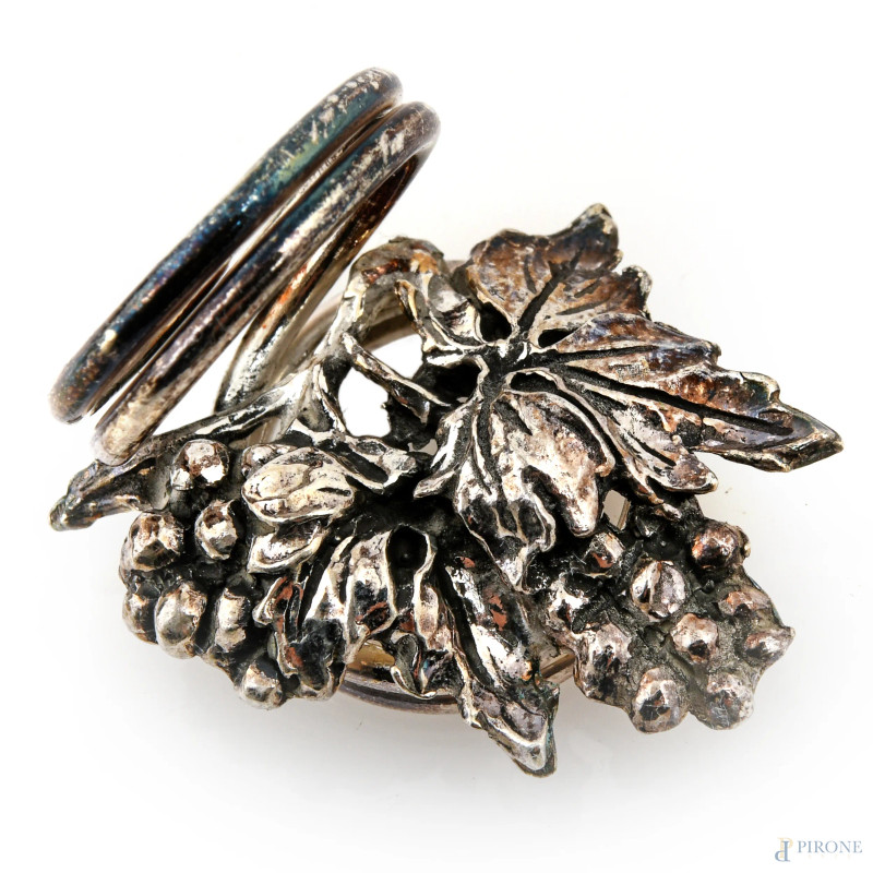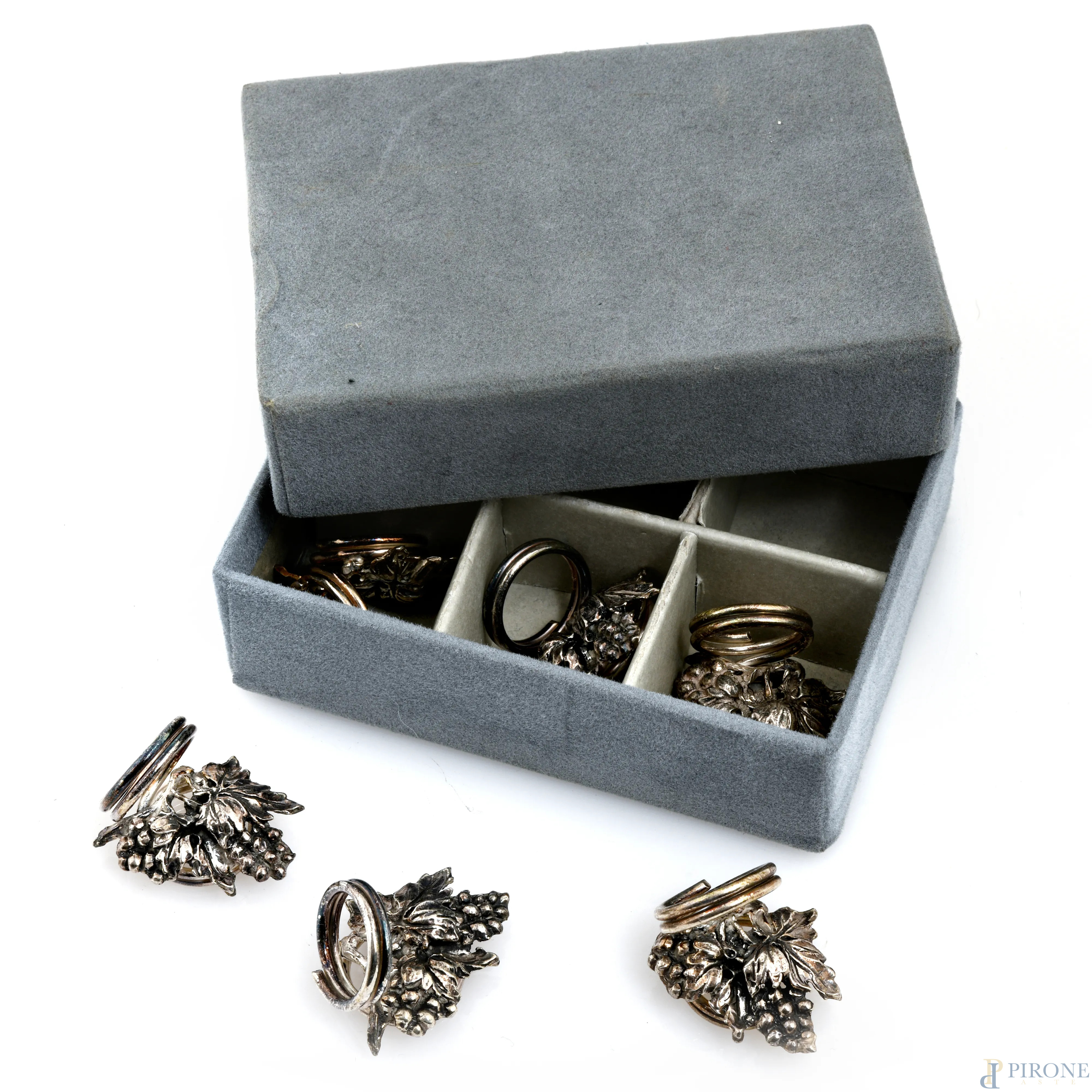 Lotto di sei segnaposto in argento a guisa di grappolo d'uva, cm 3, peso complessivo gr 90, (segni di usura)