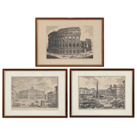 Lotto di tre incisioni raffiguranti vedute dei monumenti di Roma, XX secolo, misura massima cm 37,5x55,5, entro cornice (segni di usura, segni di piegatura, brunitura della carta)