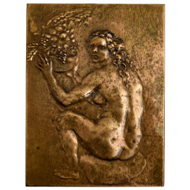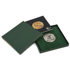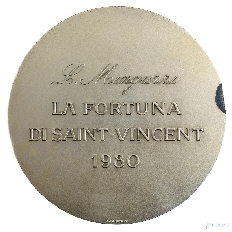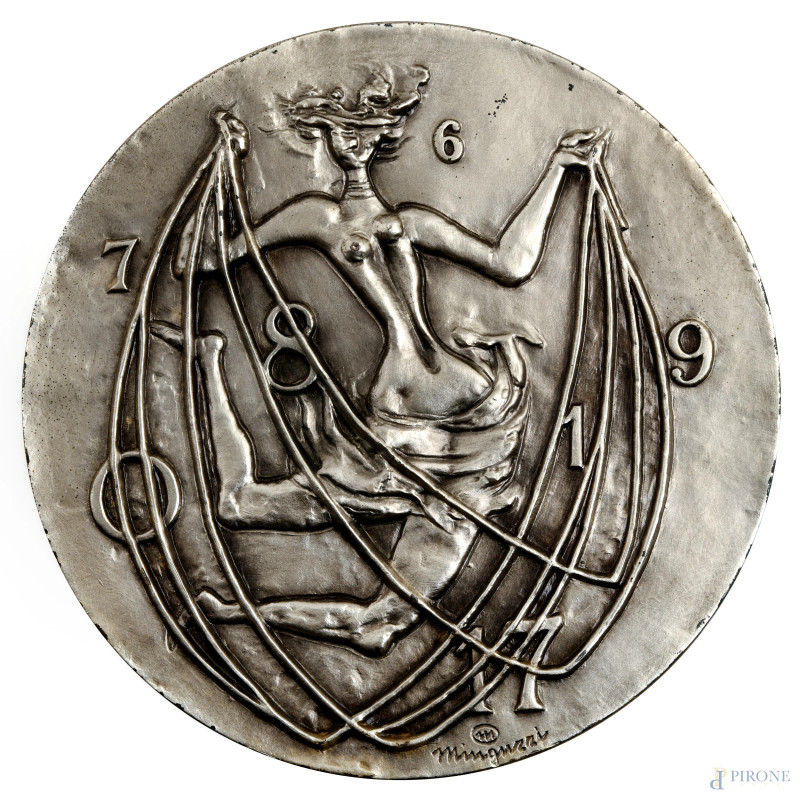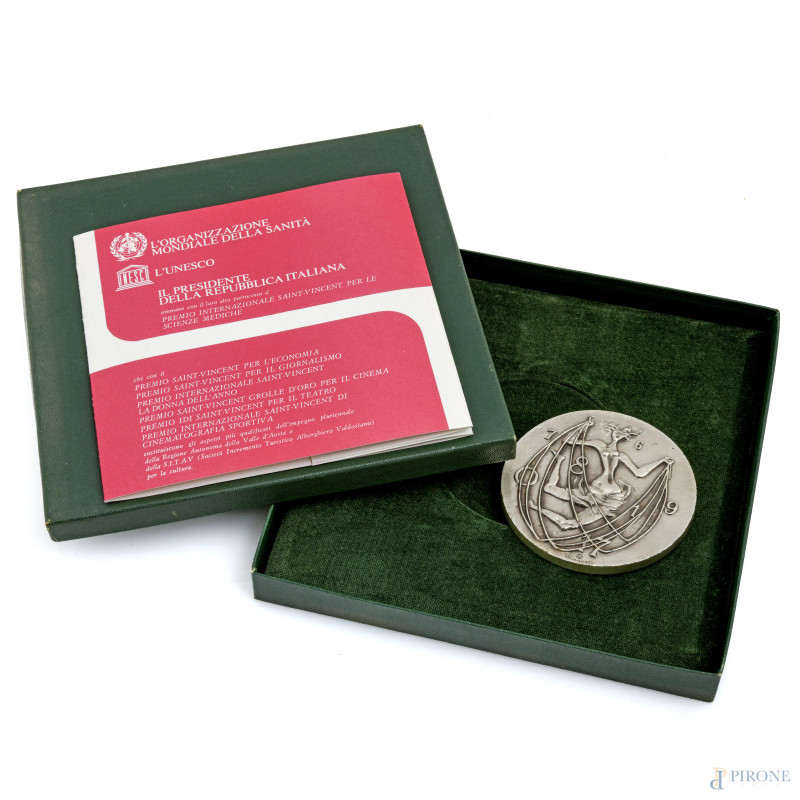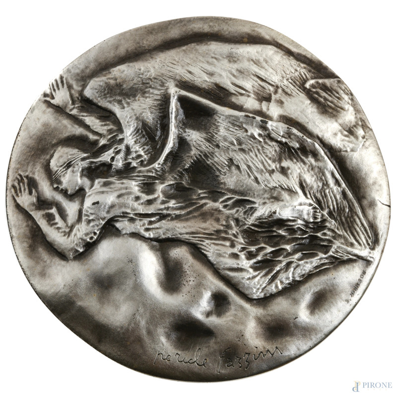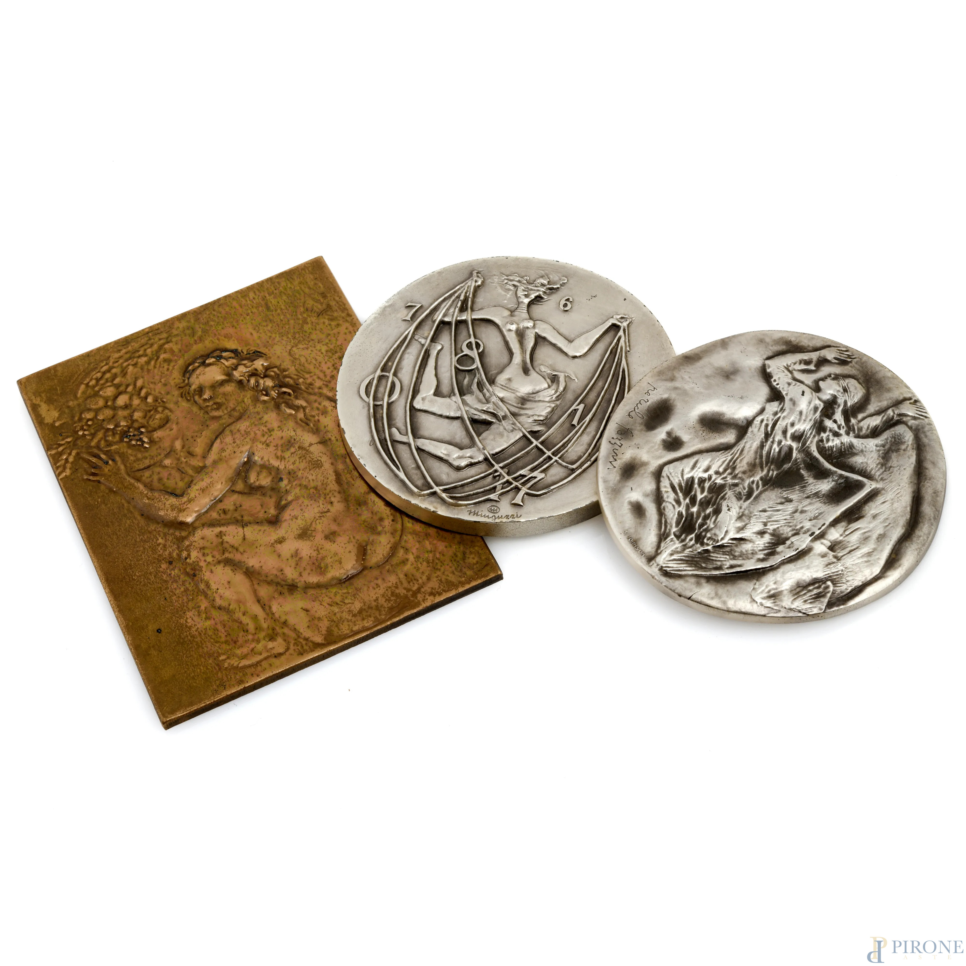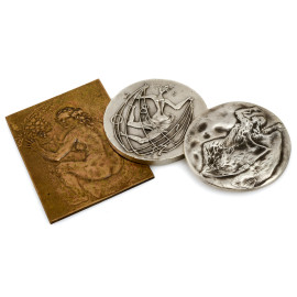 Lotto di tre medaglie in metallo a firma rispettivamente di Pericle Fazzini, Francesco Messina e Luciano Minguzzi, XX secolo, misura massima cm 11x8, entro cofanetti