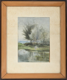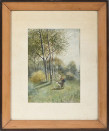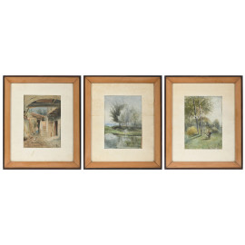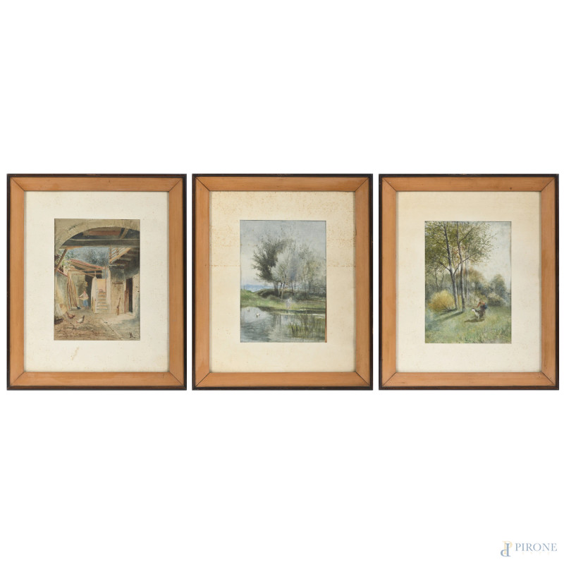 Lotto di tre opere a tecnica mista su carta raffiguranti scene campestri, XIX secolo, misure massime cm 35x27,5 compreso passepartout, uno siglato in basso a destra, entro cornice, (ondulazioni della carta, tracce di umidità, foxing)