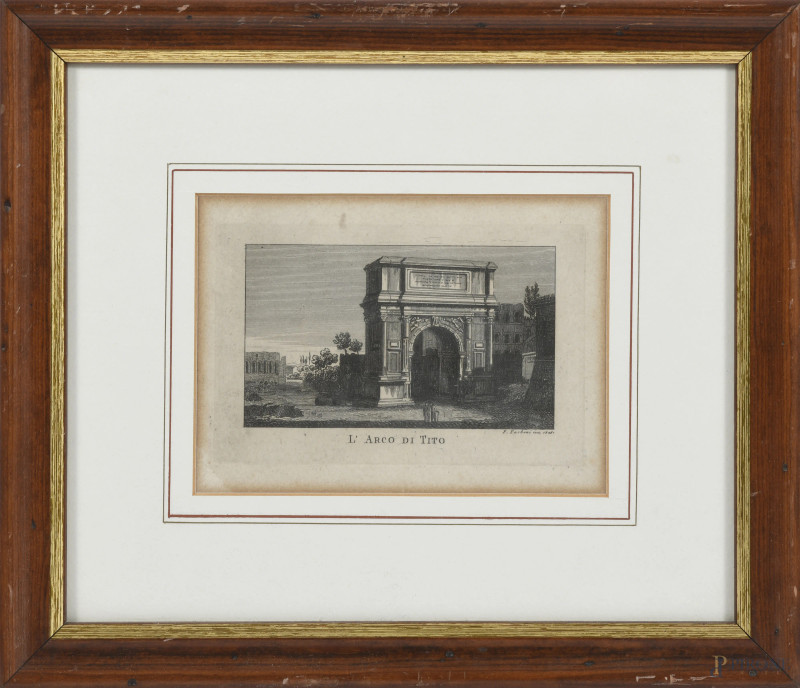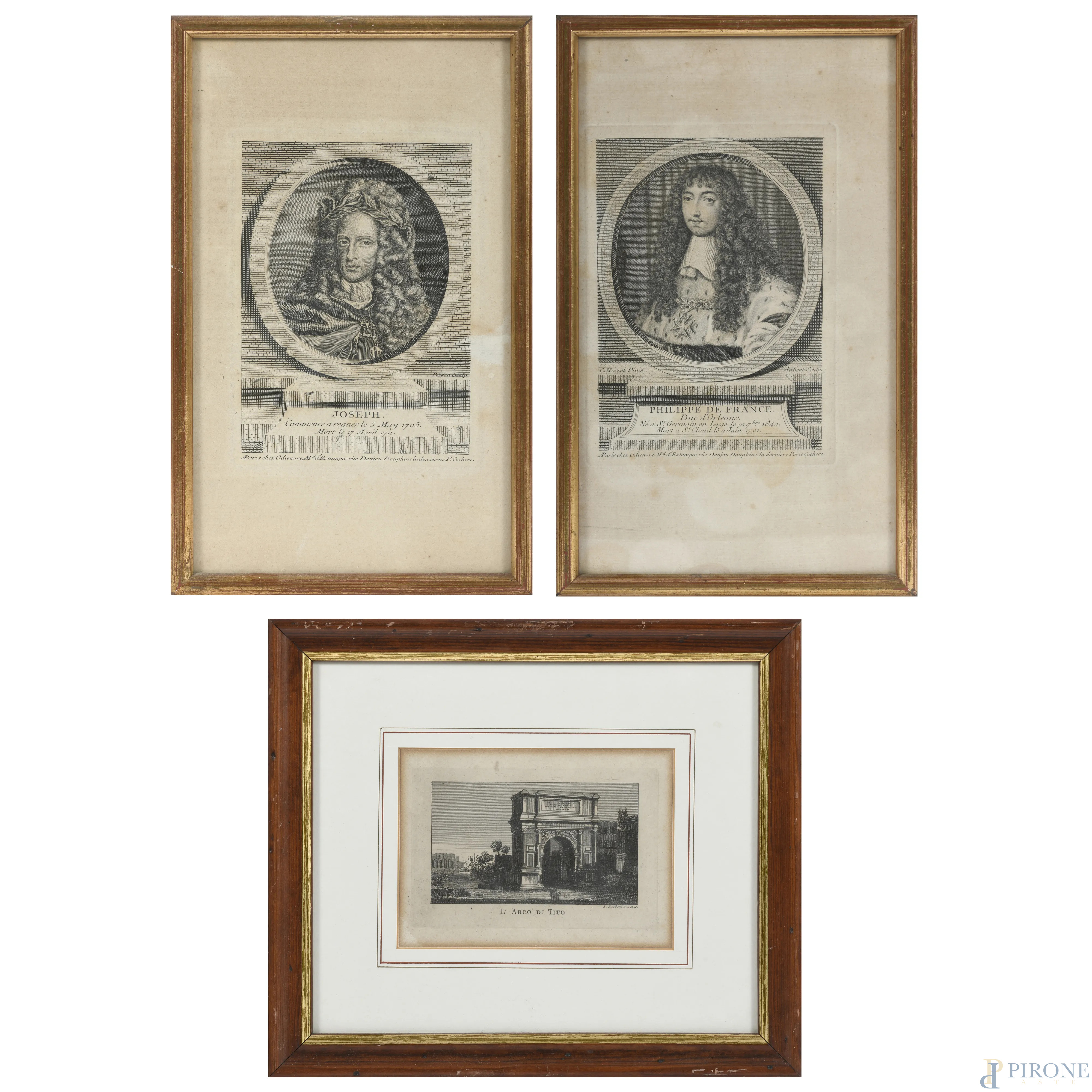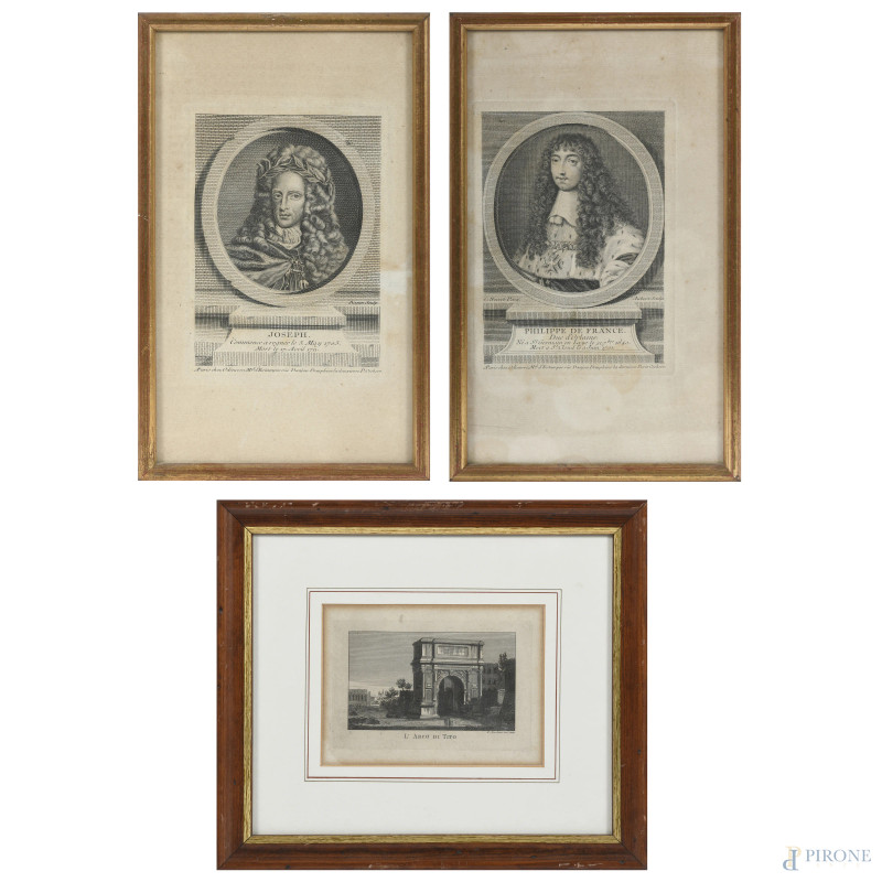 Lotto di tre stampe raffiguranti reali e veduta dell'Arco di Tito, XX secolo, misure massime cm 20x23,5 compreso passepartout, entro cornice, (tracce di umidità, foxing, ondulazioni della carta)