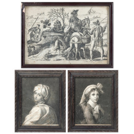 Lotto di tre stampe, XIX secolo, misure massime cm 22x17, entro cornice, (segni di usura, tracce di umidità, foxing, segni di piegatura, piccole lacune)