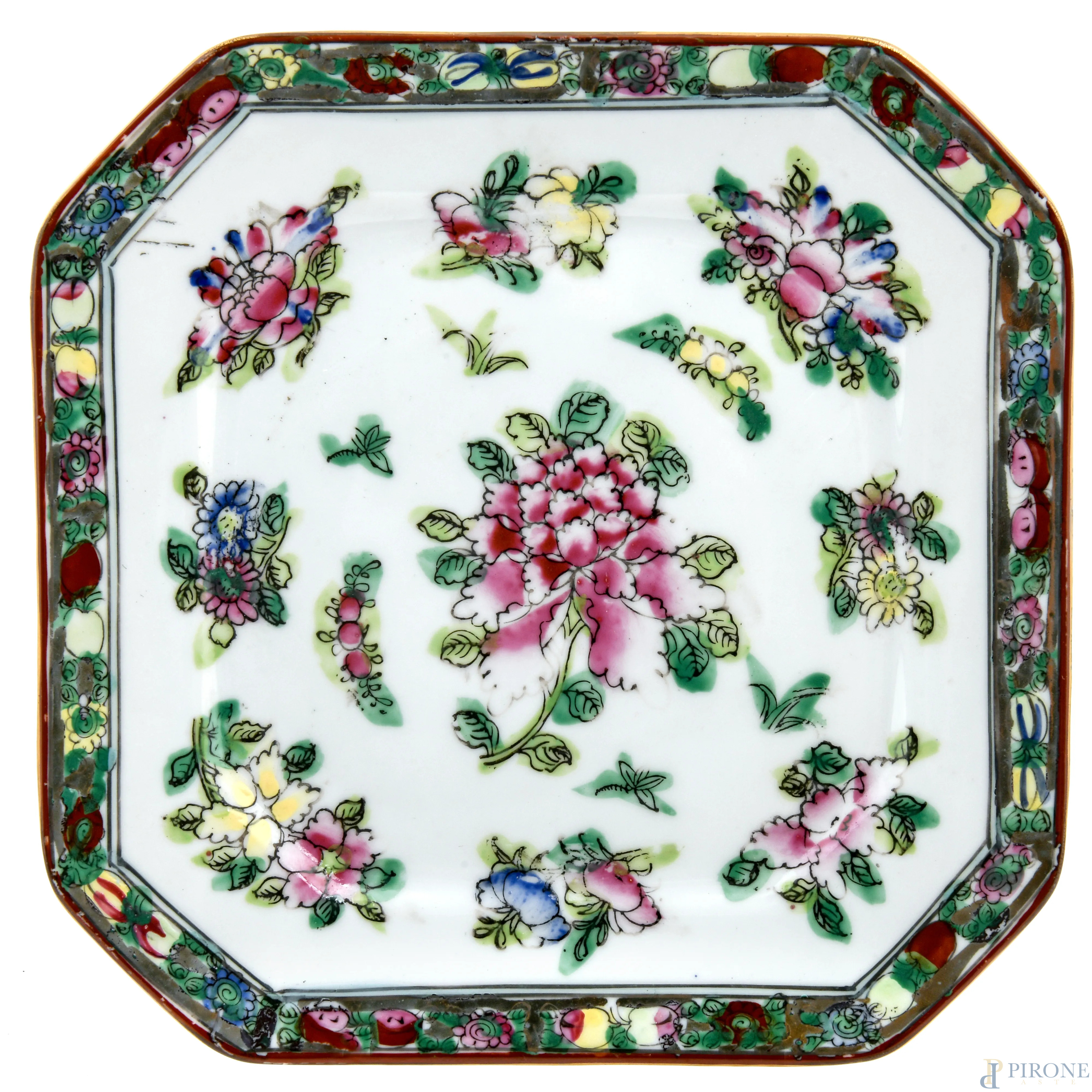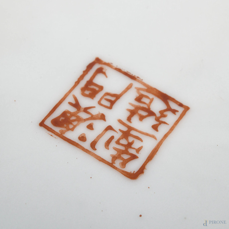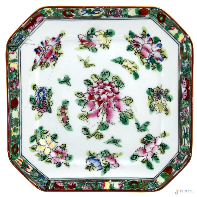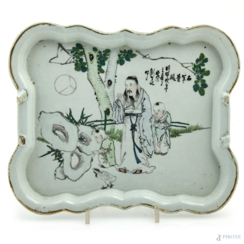 Lotto di un piatto e un vassoio in porcellana decorata a motivi floreali e scene di genere. Cina, XX secolo, misure massime cm 25,5x21, (segni di usura, sbeccature, rotture, difetti)