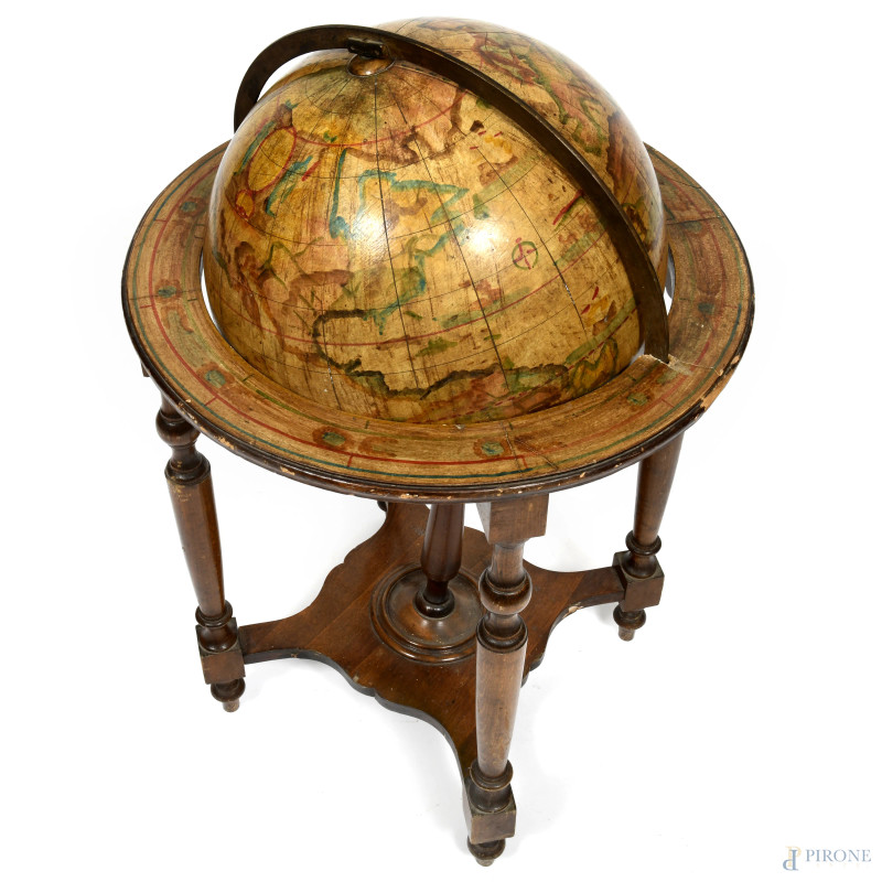 Mappamondo in legno dipinto, XX secolo, diametro cm 88, (fessurazioni, scalfiture. difetti)