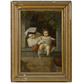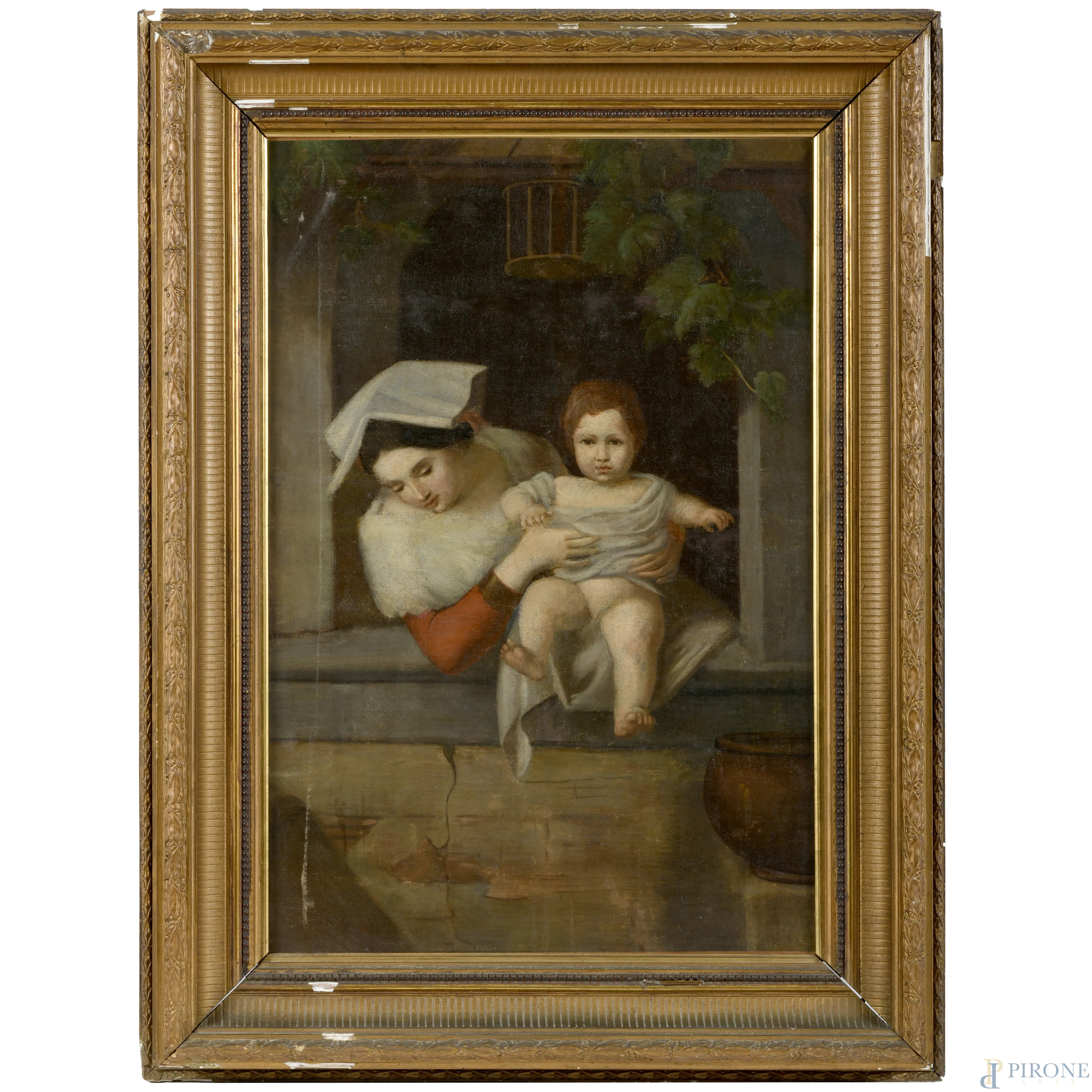 Maternità, XX secolo, copia da Giuseppe Mazzolini (1806-1876), olio su tela, cm 63x47,5, entro cornice, (abrasioni, graffi, segni di usura)