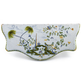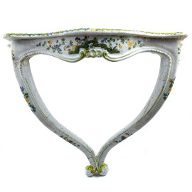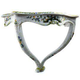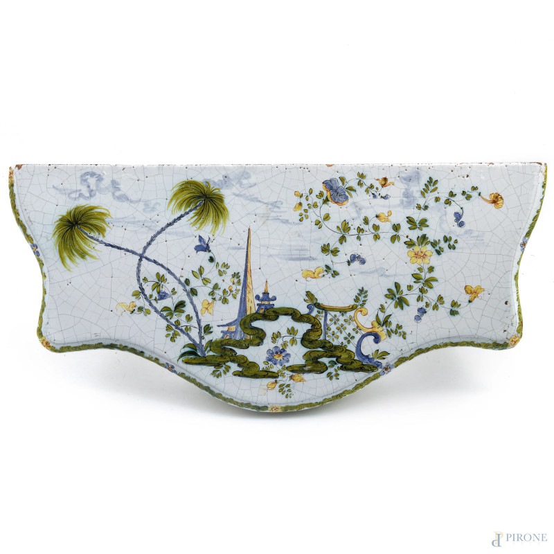 Mensola in ceramica dipinta e smaltata, XX secolo, cm 40x53,5x21, (rotture, scalfiture, difetti, restauri)