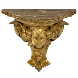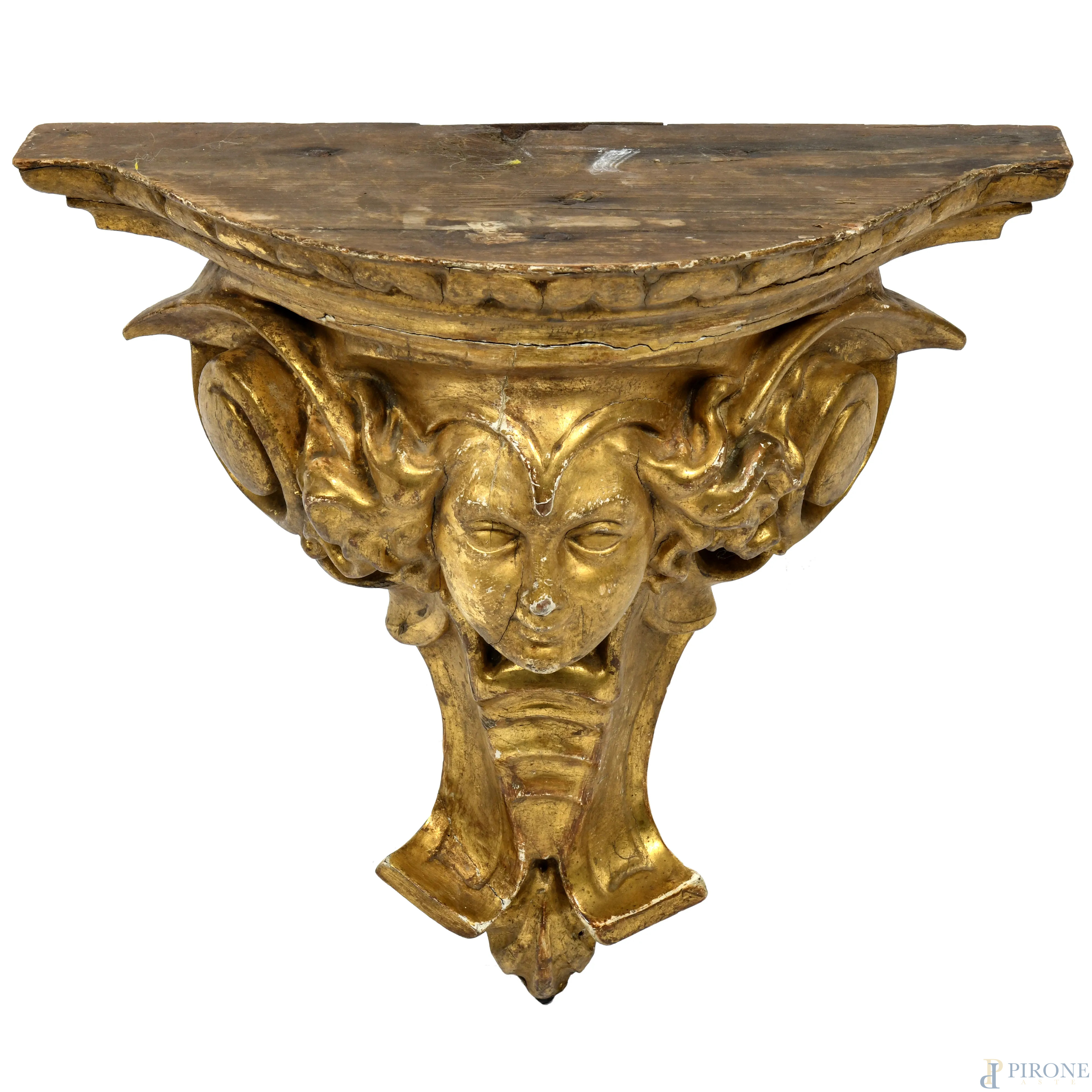 Mensola in legno dorato e intagliato con volto a rilievo, XIX-XX secolo, cm 32x34x16,5, (segni di usura, fessurazioni, cadute di doratura, scalfiture, restauri, difetti)