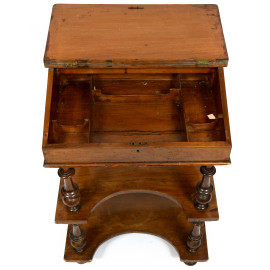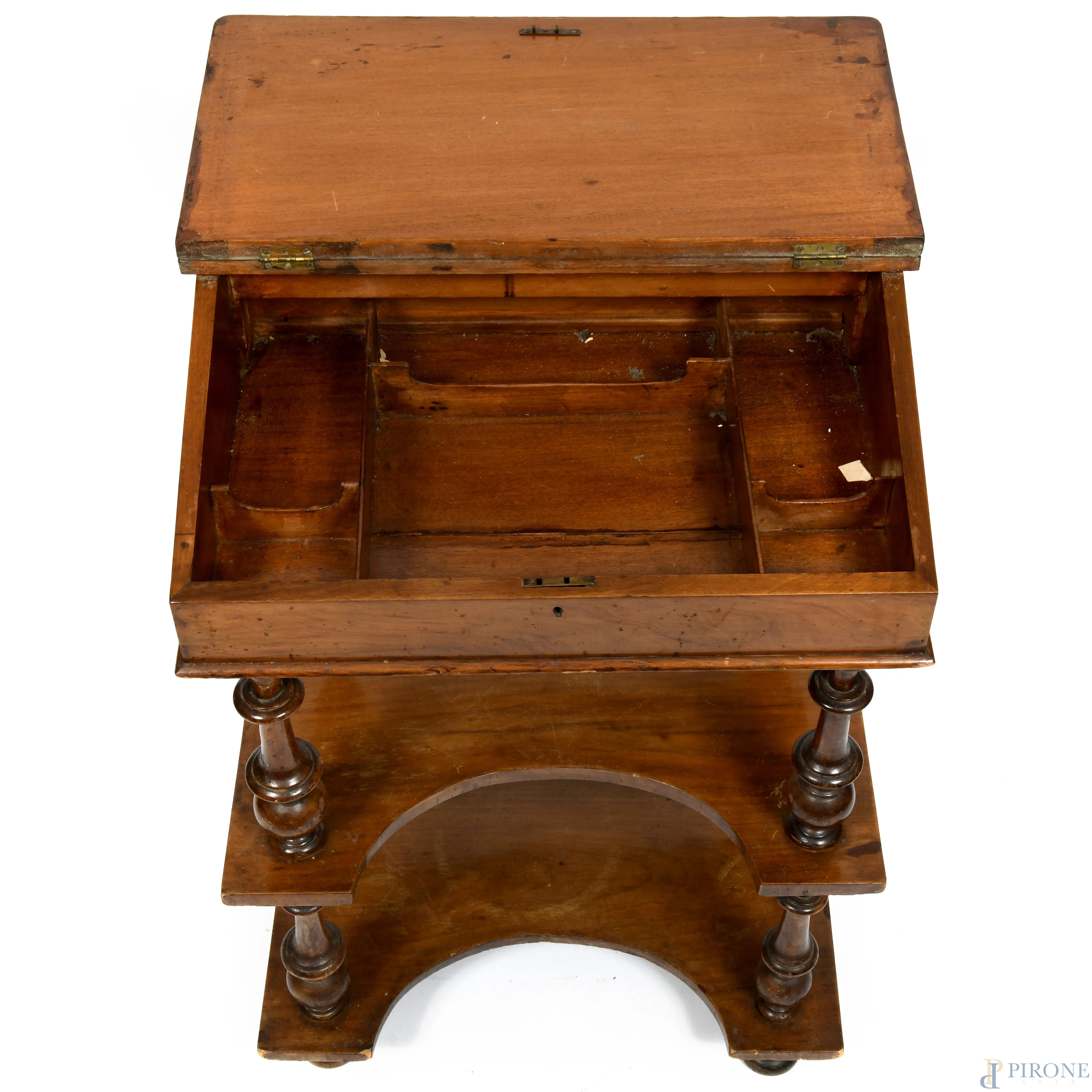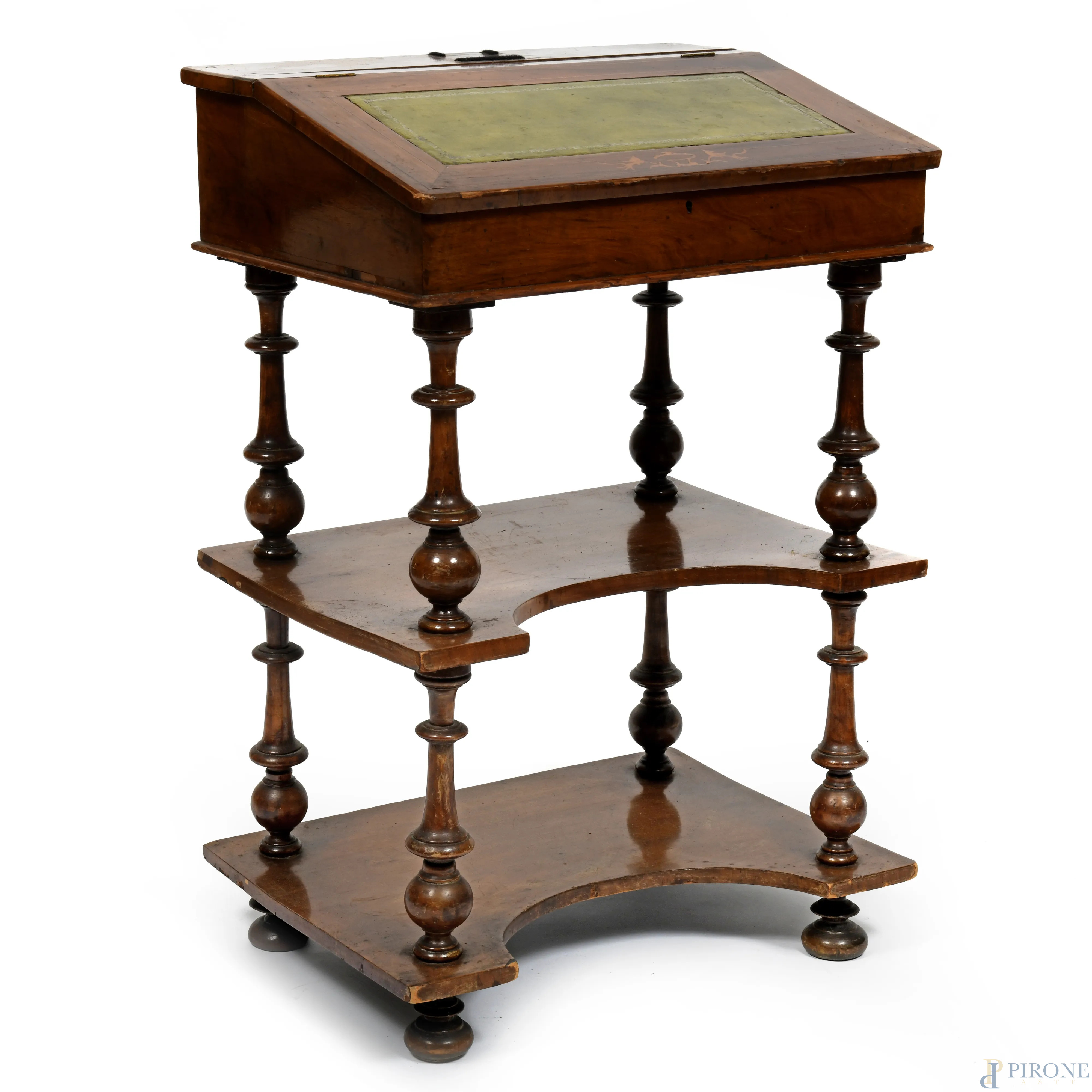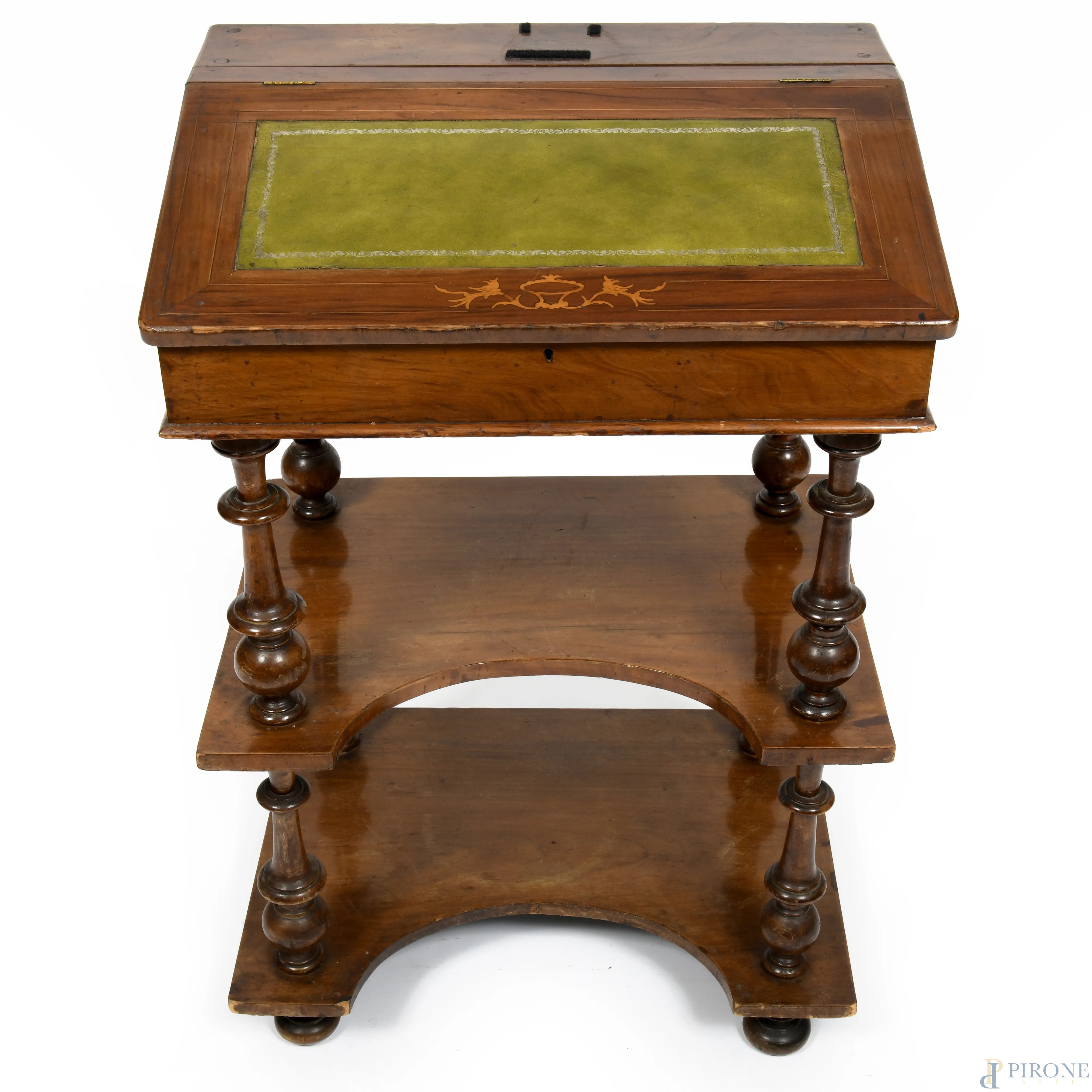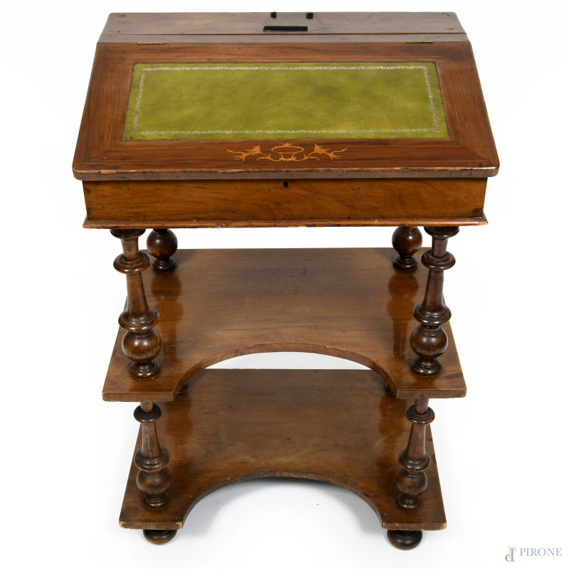 Mobile scrittoio impiallacciato con piano rivestito in cuoio verde celante vano portaoggetti. Poggiante su struttura a doppio ripiano raccordate da colonnine tornite, XX secolo, cm 84,5x56x40, (segni di usura, graffi, difetti, cadute di impiallacciatura)