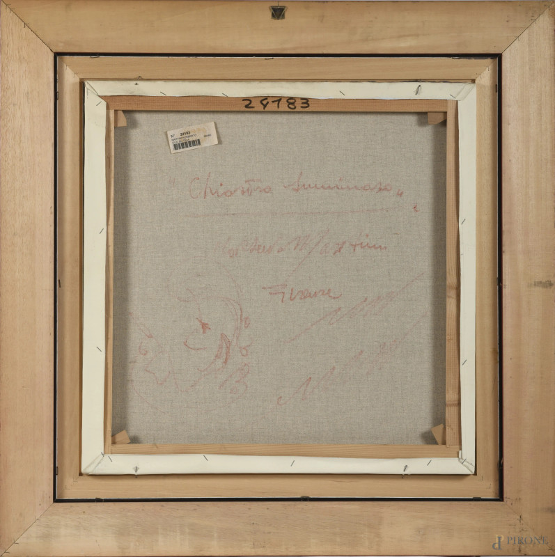 Norberto Martini (1940-2007), Chiostro luminoso, olio su tela, cm 60x60, firmato in basso a destra e titolato e firmato al retro, entro cornice), corredato di certificato di autenticità rilasciato dalla Galleria Spagnoli, (piccole cadute di colore)