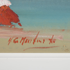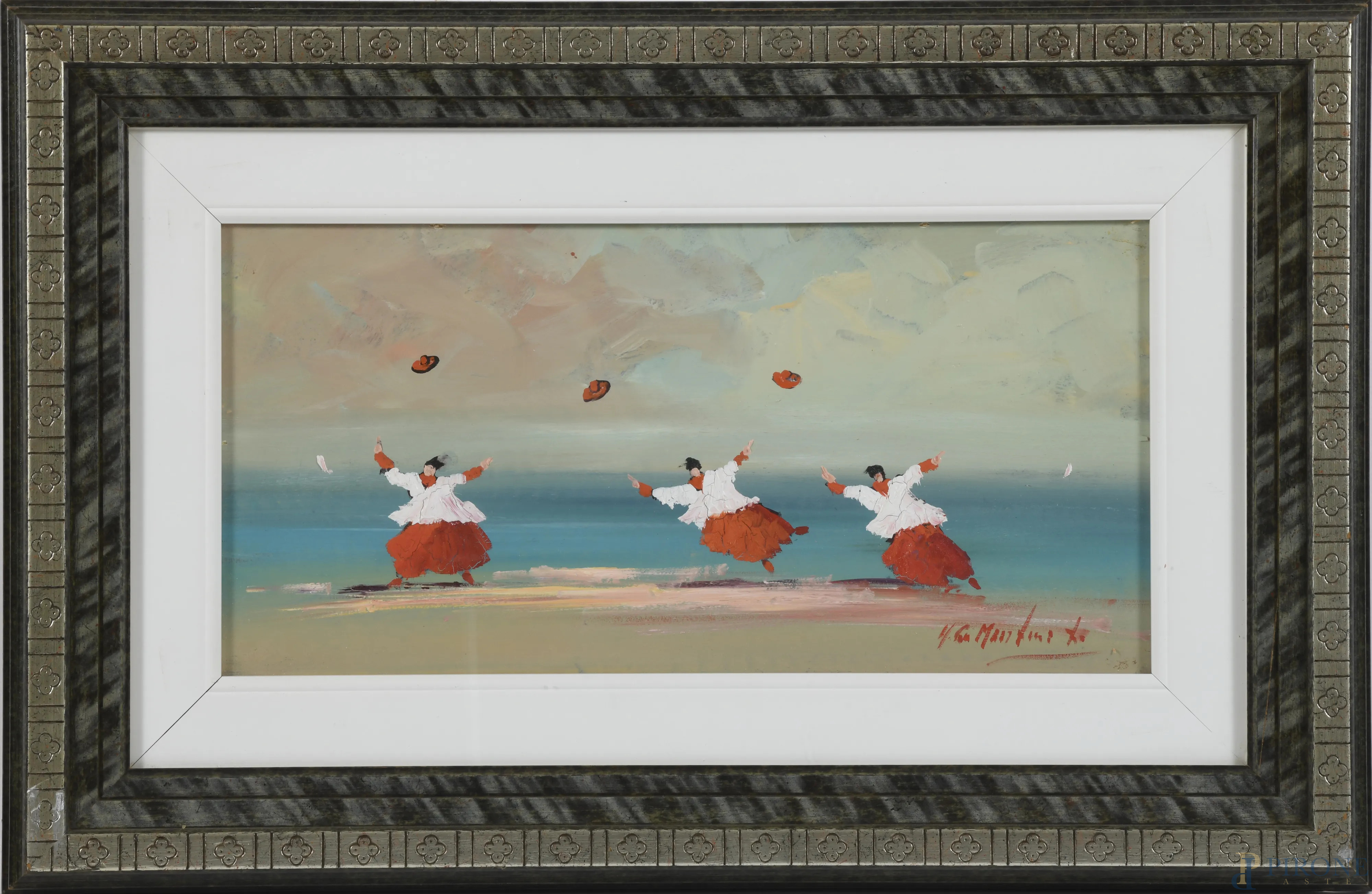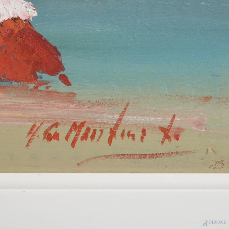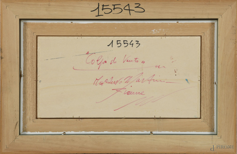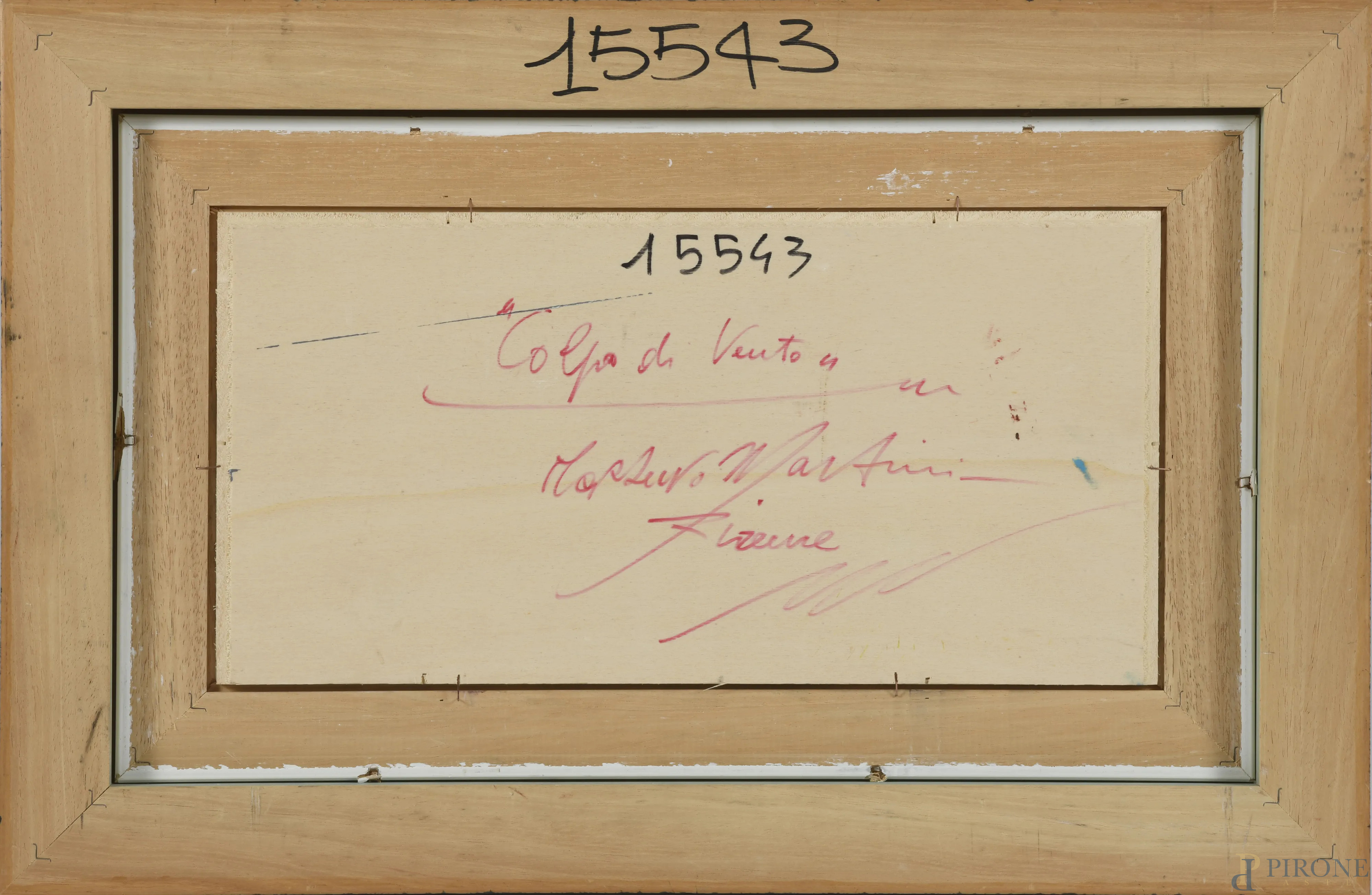 Norberto Martini ( 1940-2007), Colpo di vento, olio su compensato, cm 20x40, firmato in basso a destra, firmato e titolato al retro, entro cornice, corredato di certificato di autenticità rilasciato dalla Galleria Spagnoli
