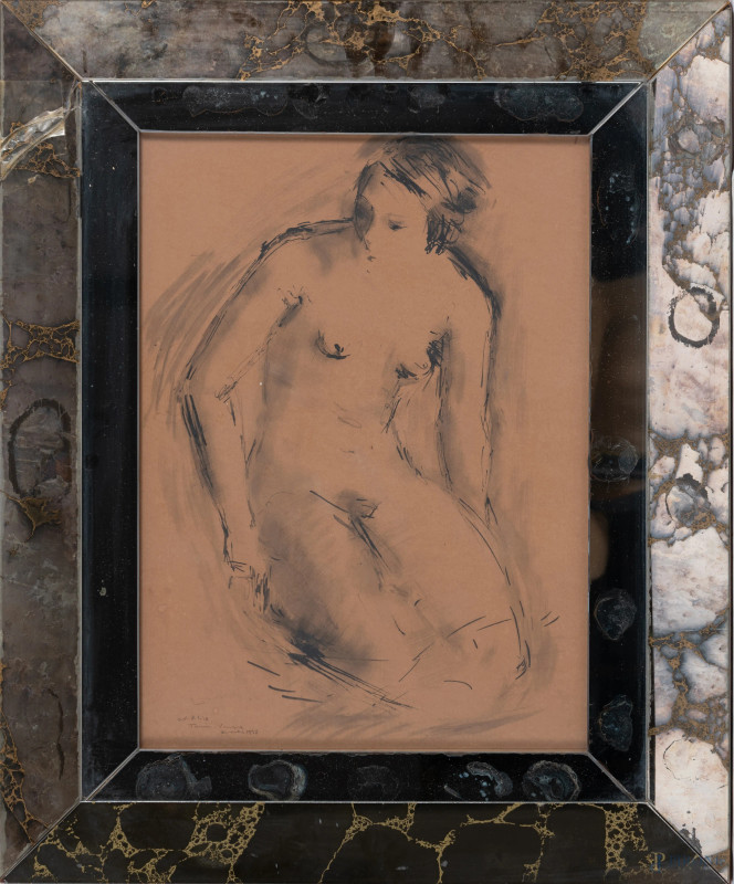 Nudo di donna, disegno a tecnica mista su carta, cm 47x34, firmato e datato "1932" in basso a destra, entro cornice