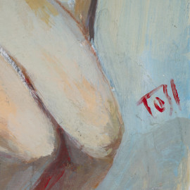 Nudo femminile seduto, olio su compensato, cm 34,5x22, firmato in basso a destra, (rotture, restauri)