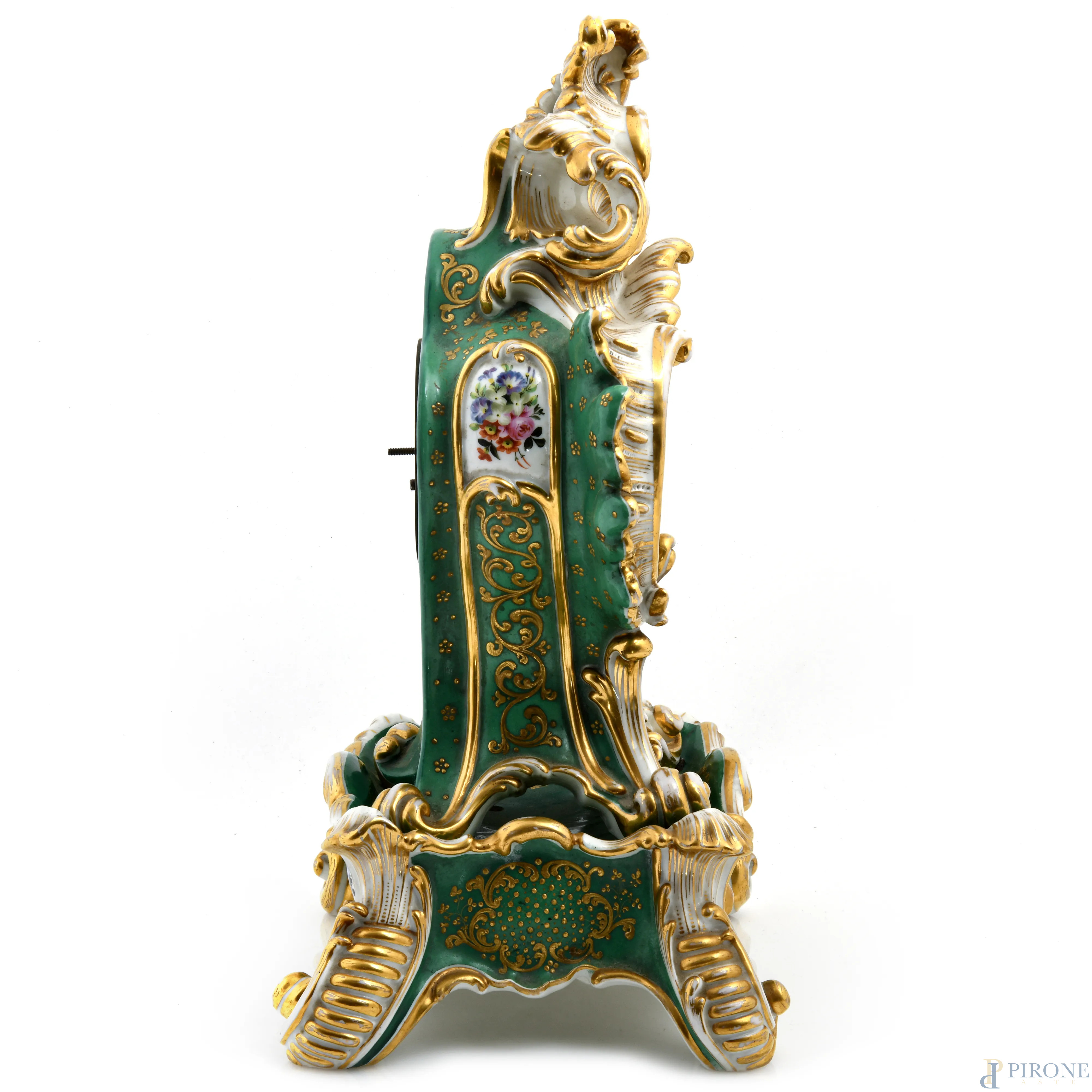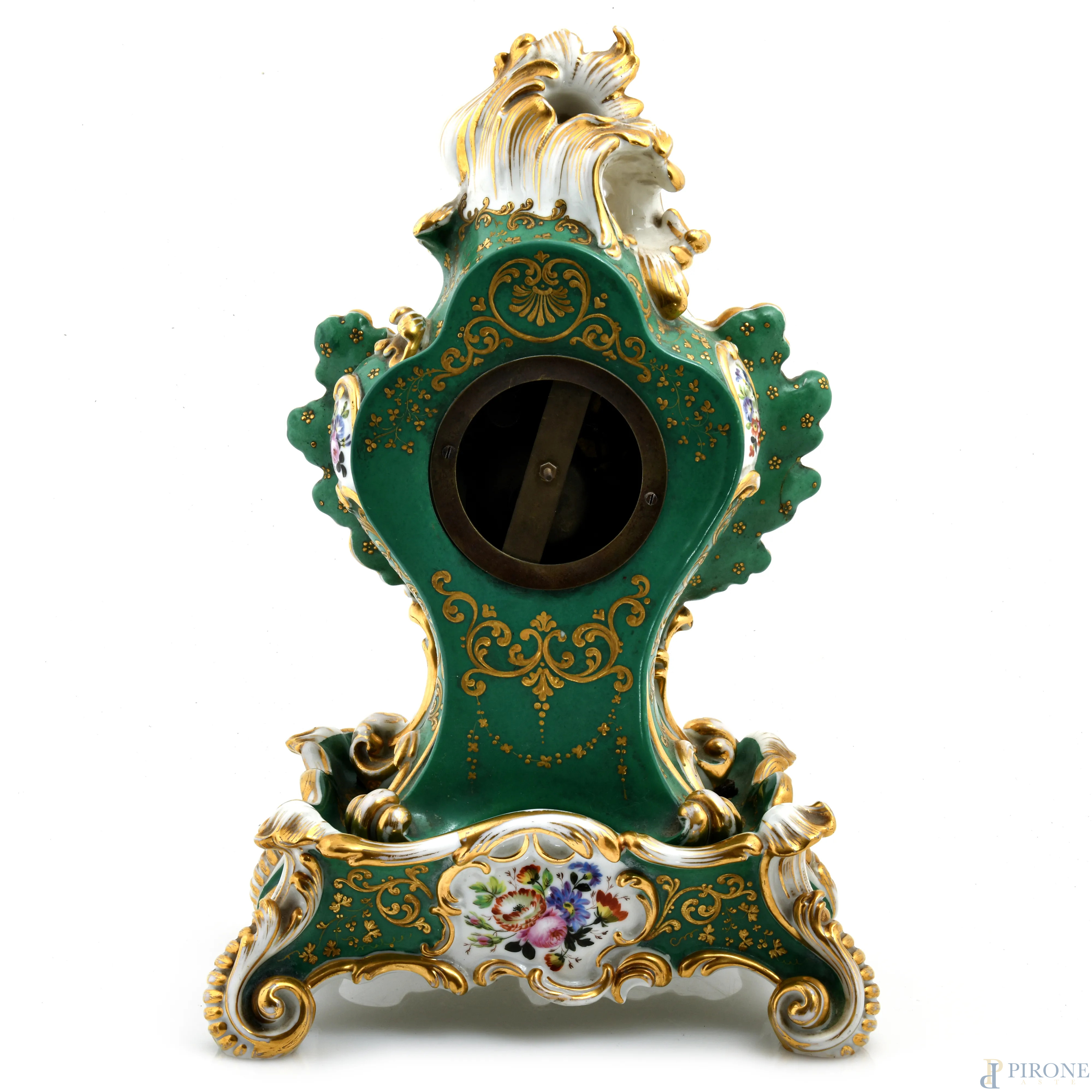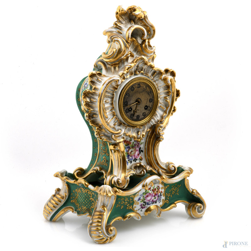 Orologio da tavola Luigi Filippo con base in porcellana nei toni del bianco, verde e oro, XIX secolo, altezza cm 37, (segni di usura, cadute di smalto, lievi scalfiture, da revisionare)